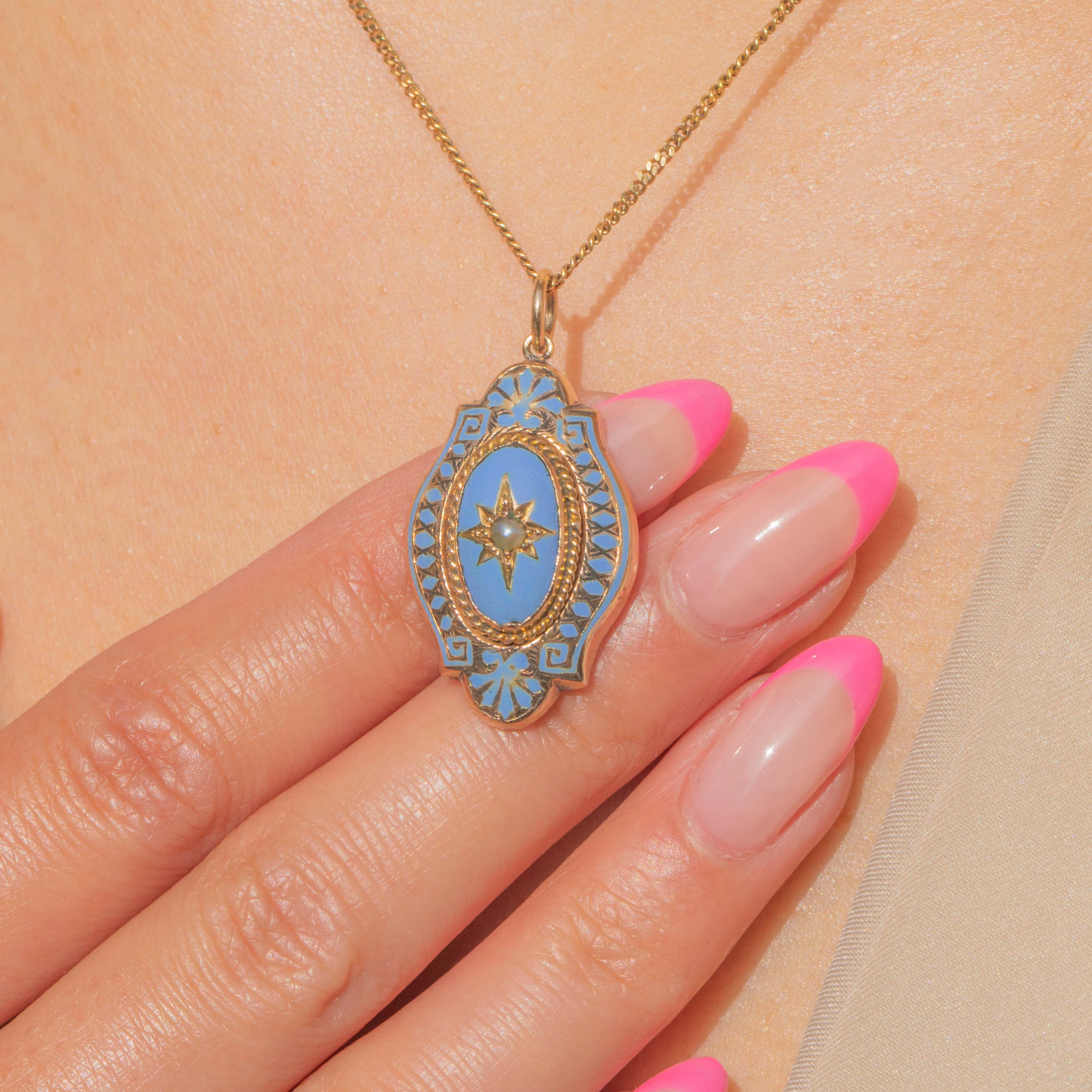 Displayed within a bold star setting, the lustrous Pearl shimmers, haloed by a twisted rope border and offset by powder blue Enamel. The Enamel has been inlaid into striking geometric Gold work, with intricate engravings that catch the light beautifully. If you have a penchant for unique treasures, don't hesitate to make this gorgeous Victorian Enamel pendant your newest acquisition!