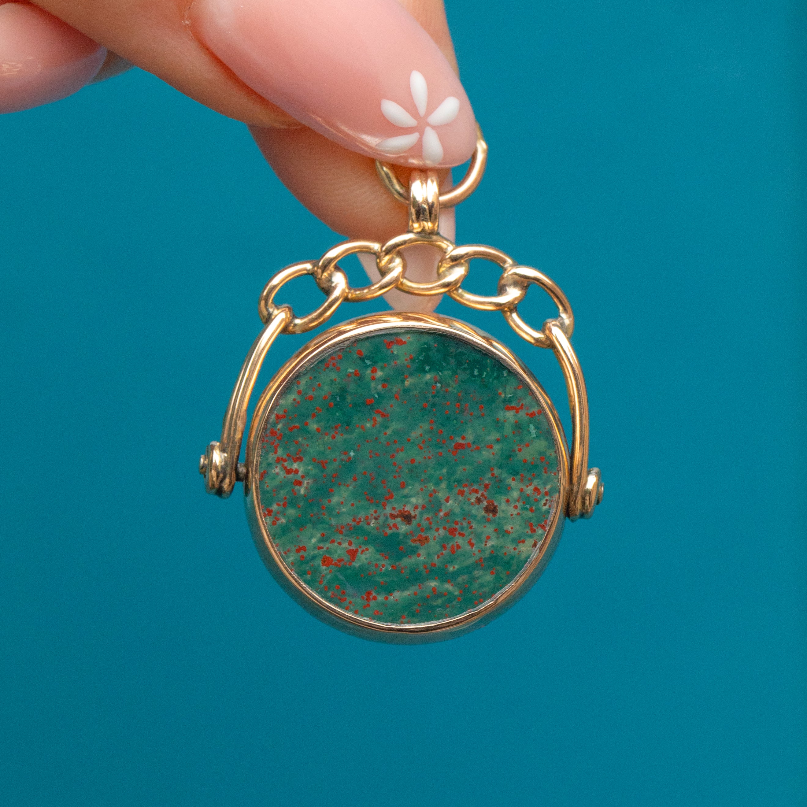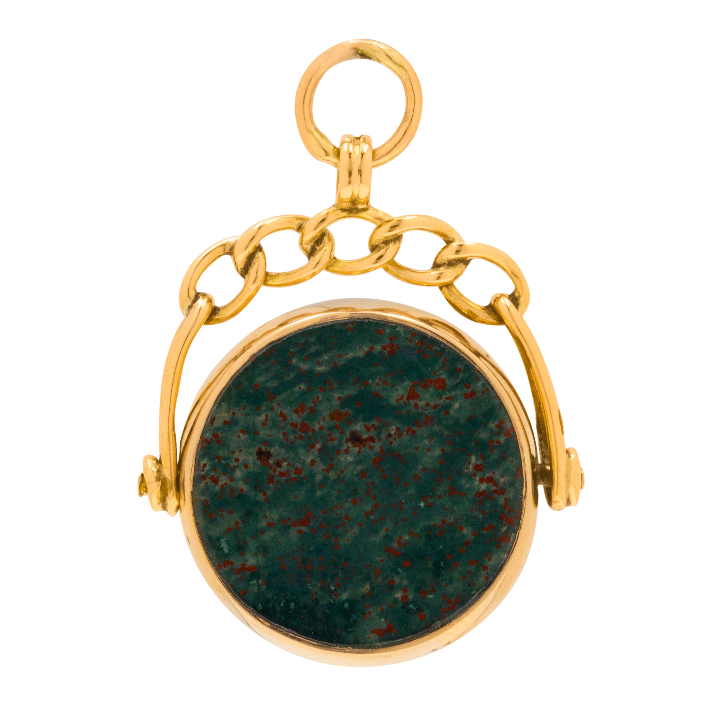 This beautiful Victorian 9ct Gold Carnelian Bloodstone swivel fob pendant is a genuine antique, dating from the late Victorian period. The warm-coloured yellow 9ct Gold setting compliments the deep orangey brown of the Carnelian and the dark, green Bloodstone with red flecks across her surface.