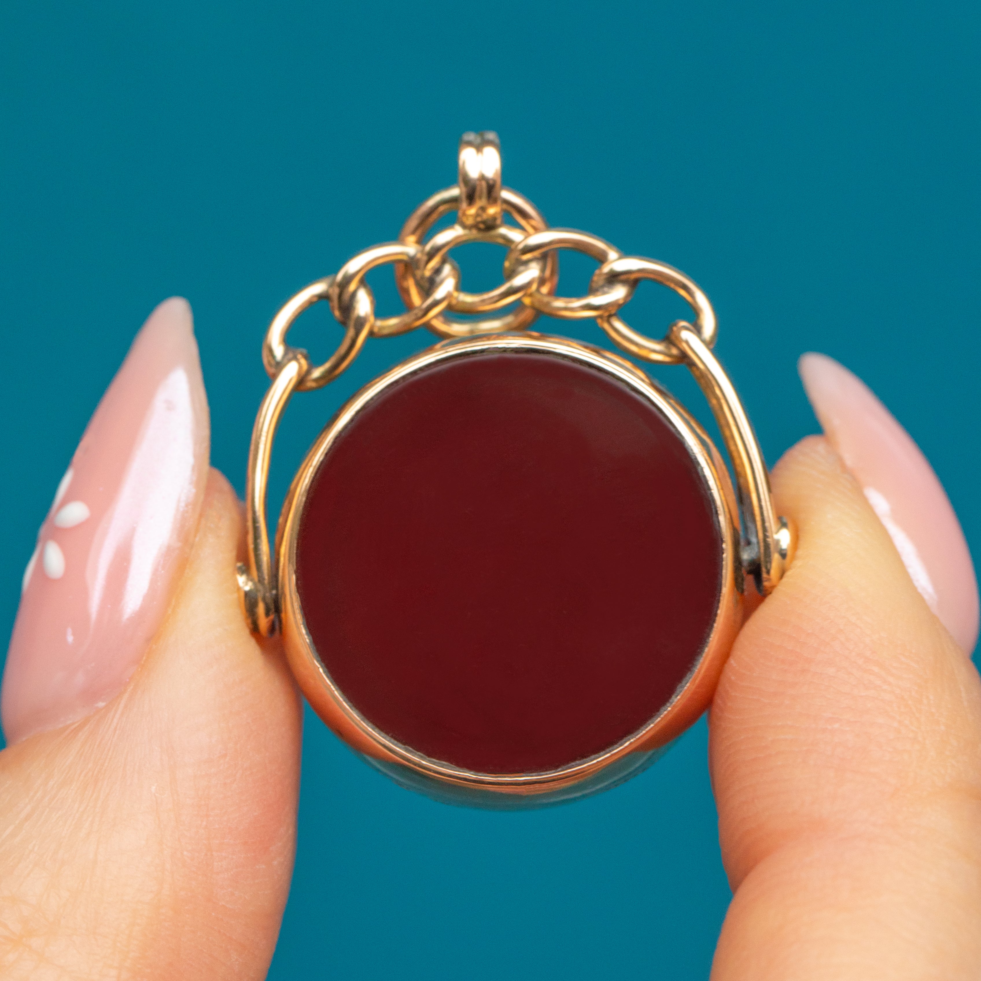 EXCELLENT: This Victorian 9ct Gold Carnelian Bloodstone swivel fob is in excellent condition. The Carnelian has depth and exudes a unique chestnut brown hue. The 9ct Gold setting exhibits minor dents, however, it's not noticeable when worn and it does hold the gemstones securely. The Bloodstone boasts an incredible surface with freckles of crimson - both free from any chips or scratches. Her 9ct Gold is rich and glossy, and her knotted bale adds classic Victorian charm! Complete with a jump ring, suspend her from a Gold chain of your choice for the ultimate antique look!