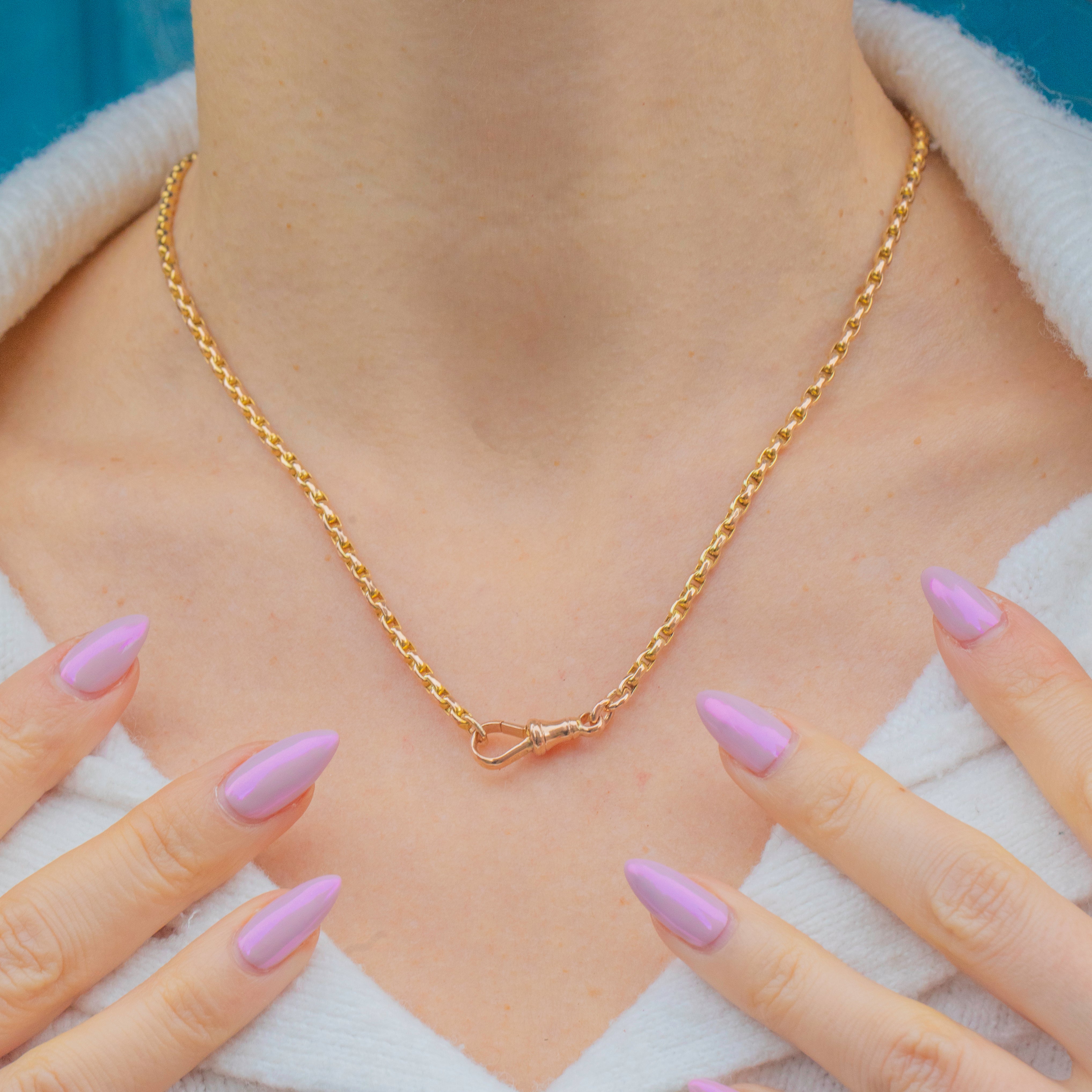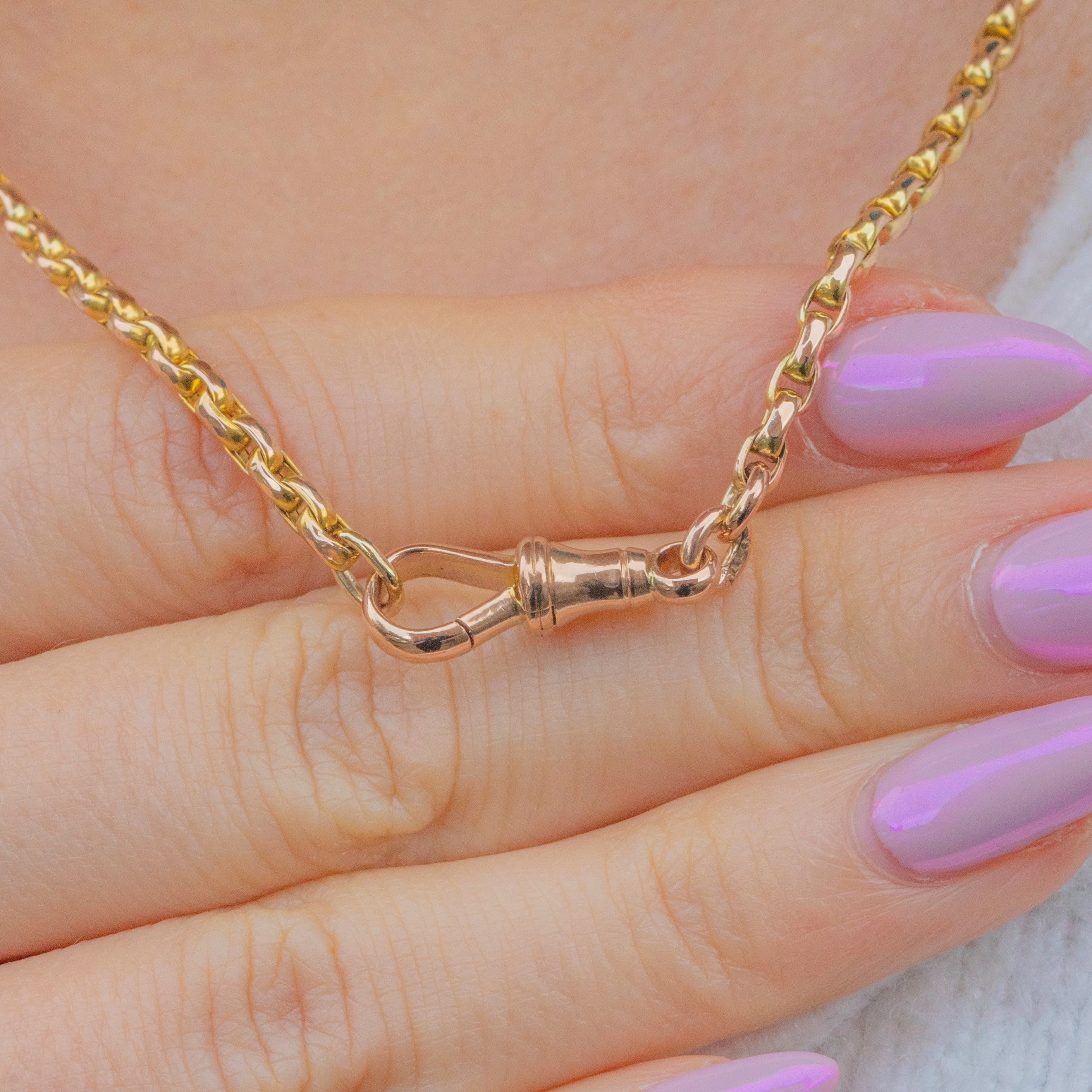 A gorgeous, medium-weight antique Victorian 9ct Gold chain, fitted with a classic dog-clip clasp, perfect for displaying pendants, lockets, or charms. The links are beautifully made with a soft antique glow and a bright polished finish, giving the chain a rich golden hue and satisfying weight.