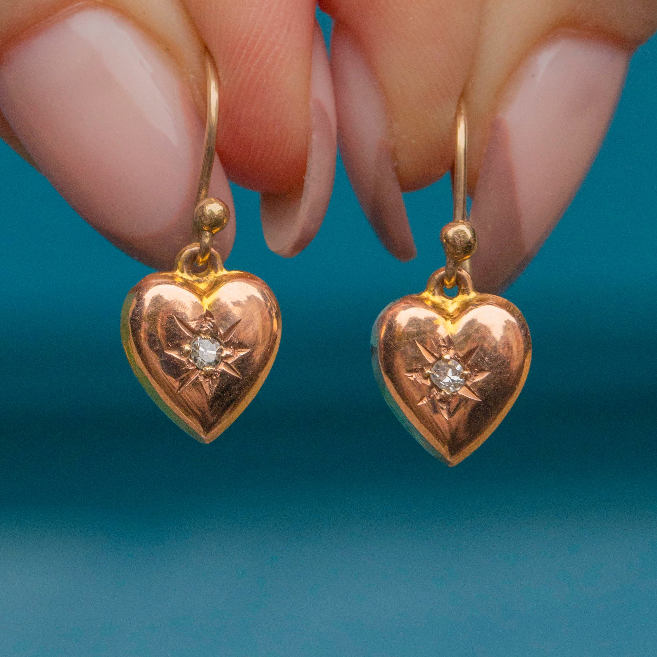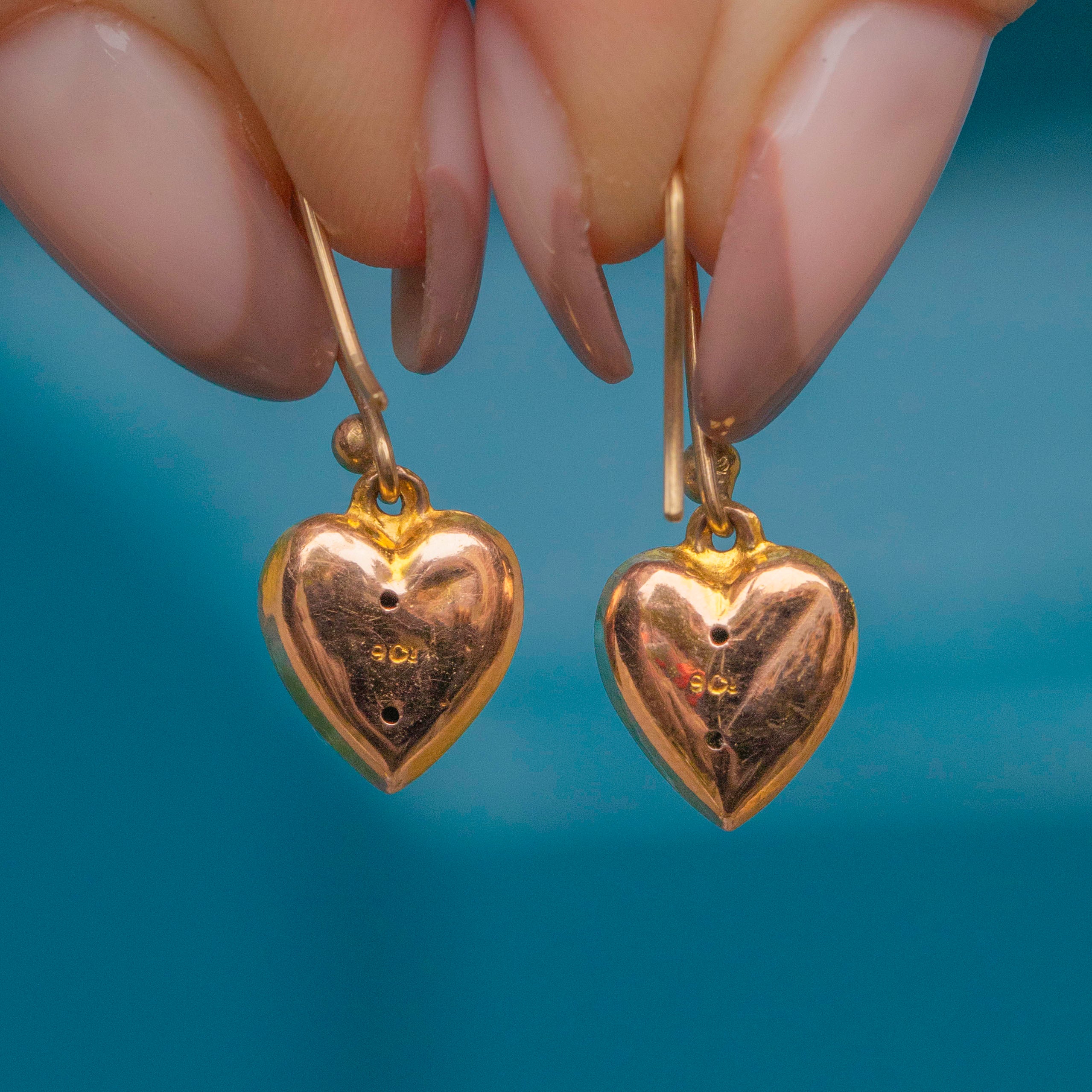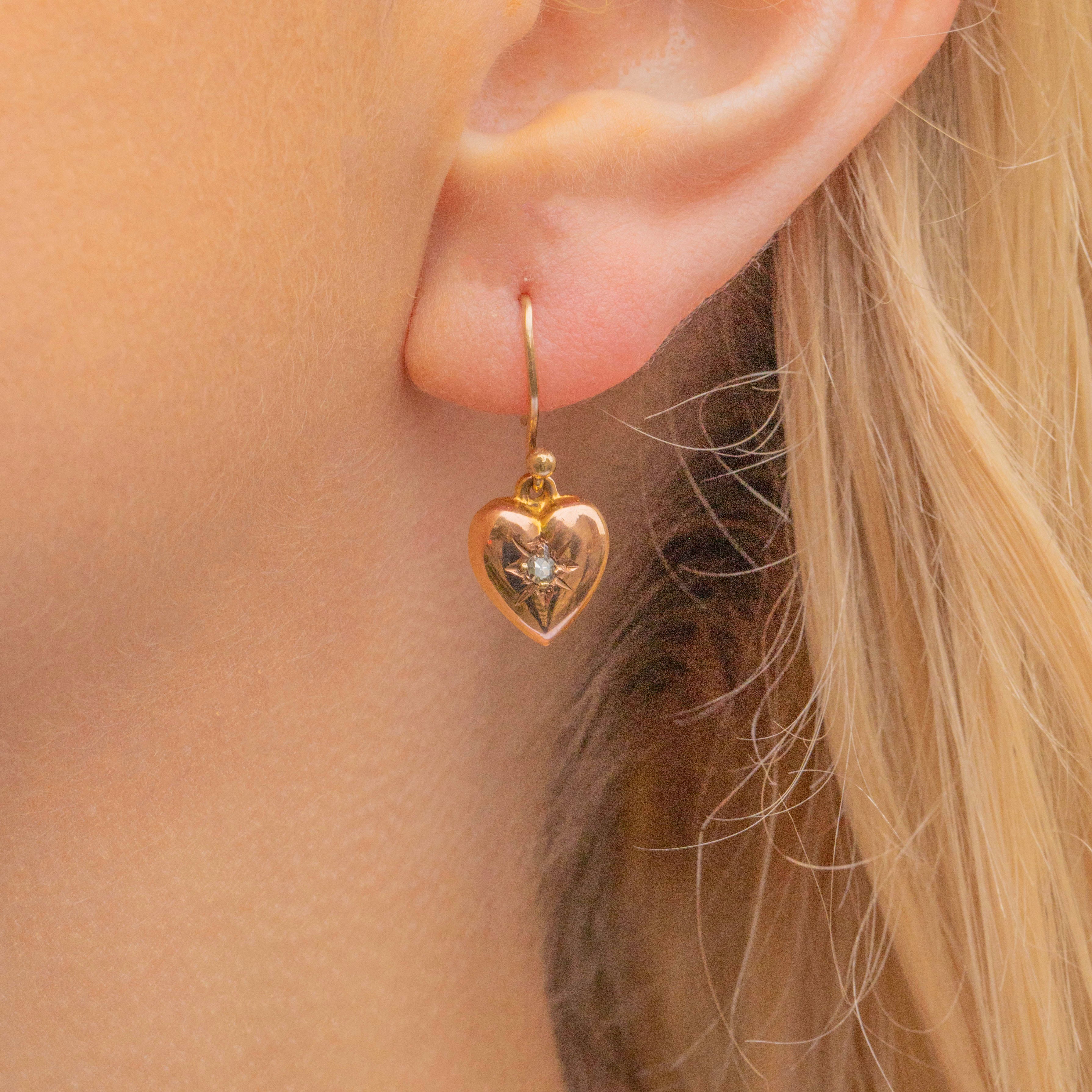 VERY GOOD-EXCELLENT. These Victorian 9ct Gold Diamond set puffy heart earrings are in superb condition. They are crafted beautifully and securely, and their central Diamonds are radiant. There are some minor dings on the back of the earrings commensurate with age, however, this is not noticeable during wear. They are a must-have!