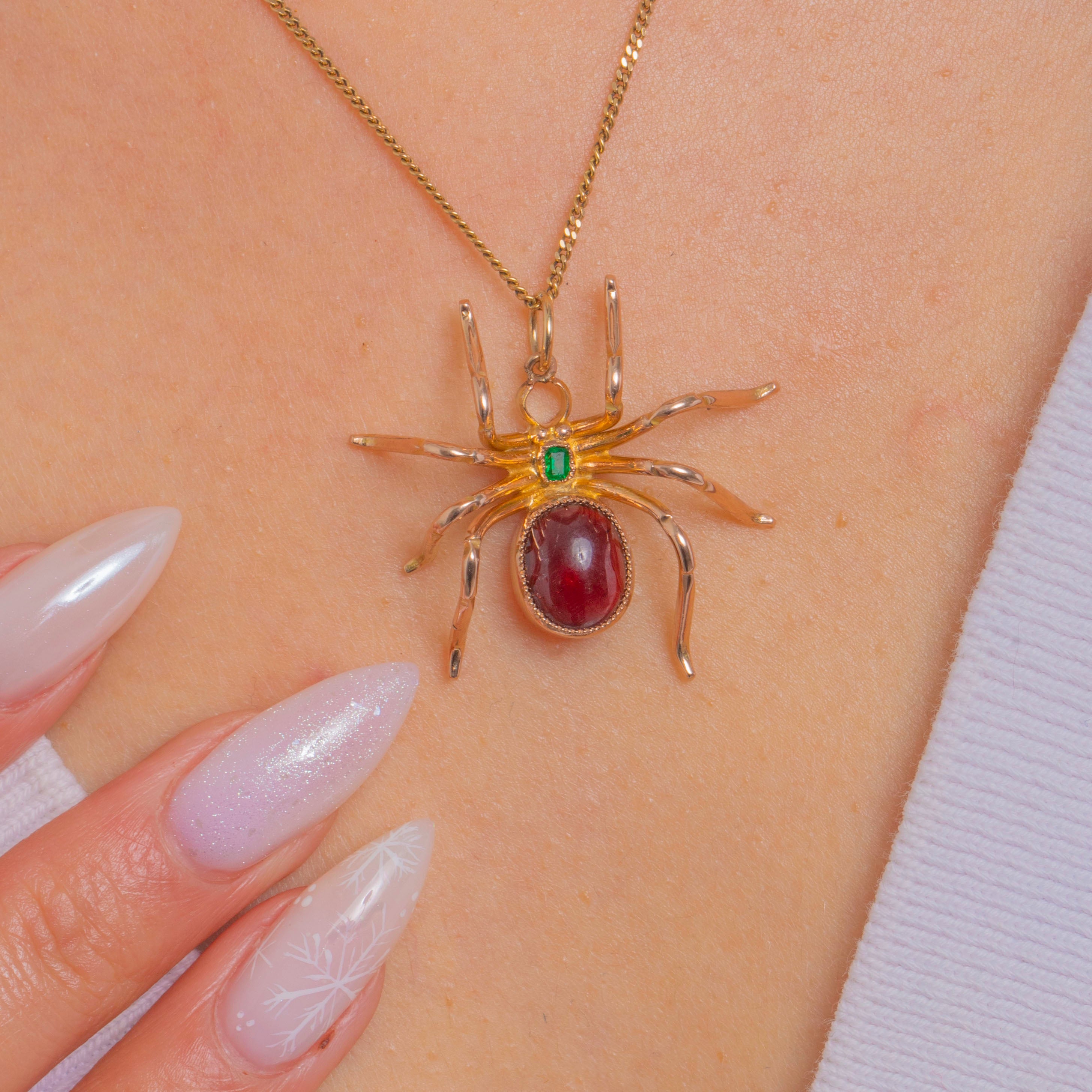 A charismatic Victorian spider pendant, crafted in warm 9ct Gold with a luscious deep-red Garnet cabochon forming the abdomen and a bright step-cut Emerald at the head. The gems sit in neat, textured bezels, while eight slender, curving legs lend a wonderfully naturalistic silhouette with a dash of gothic whimsy.