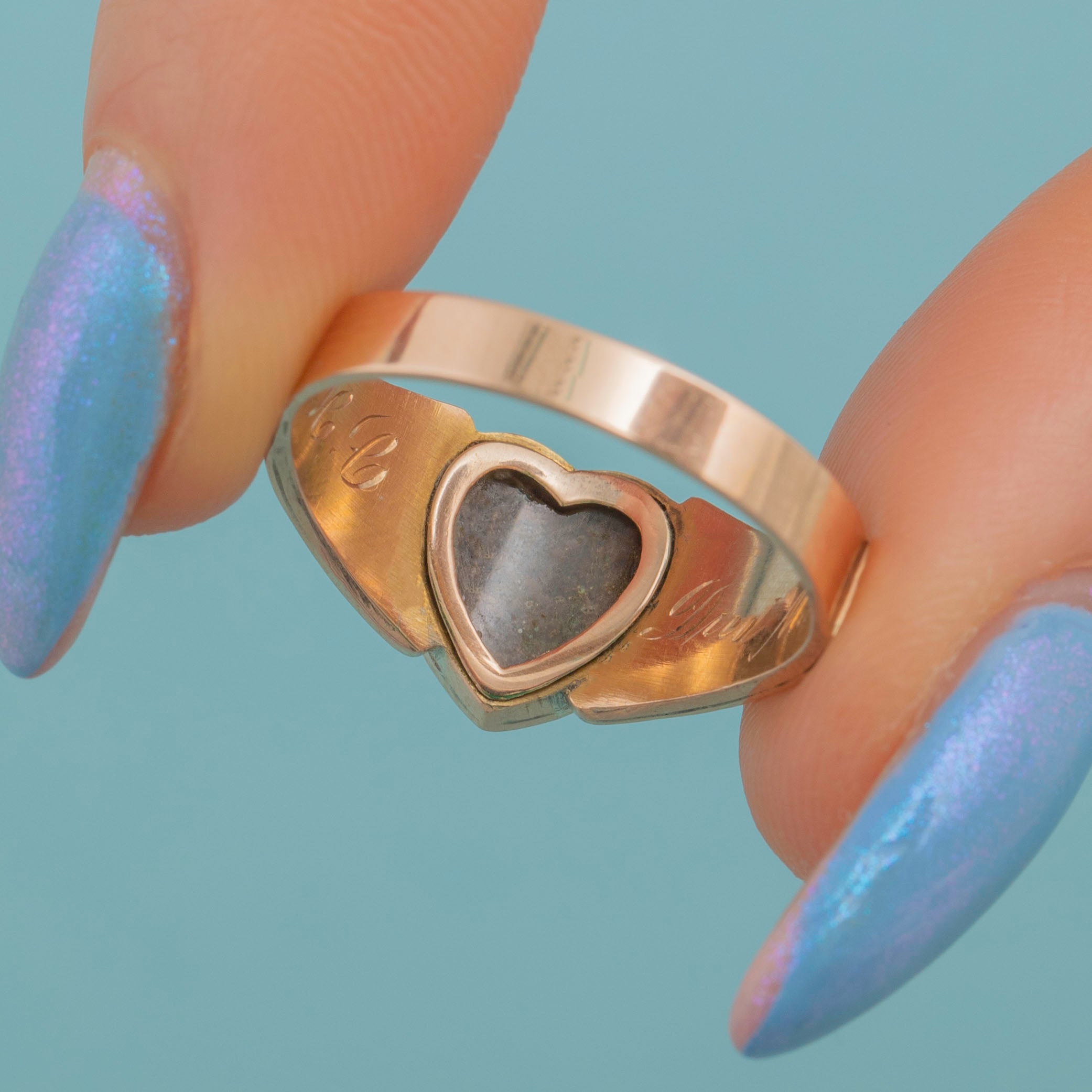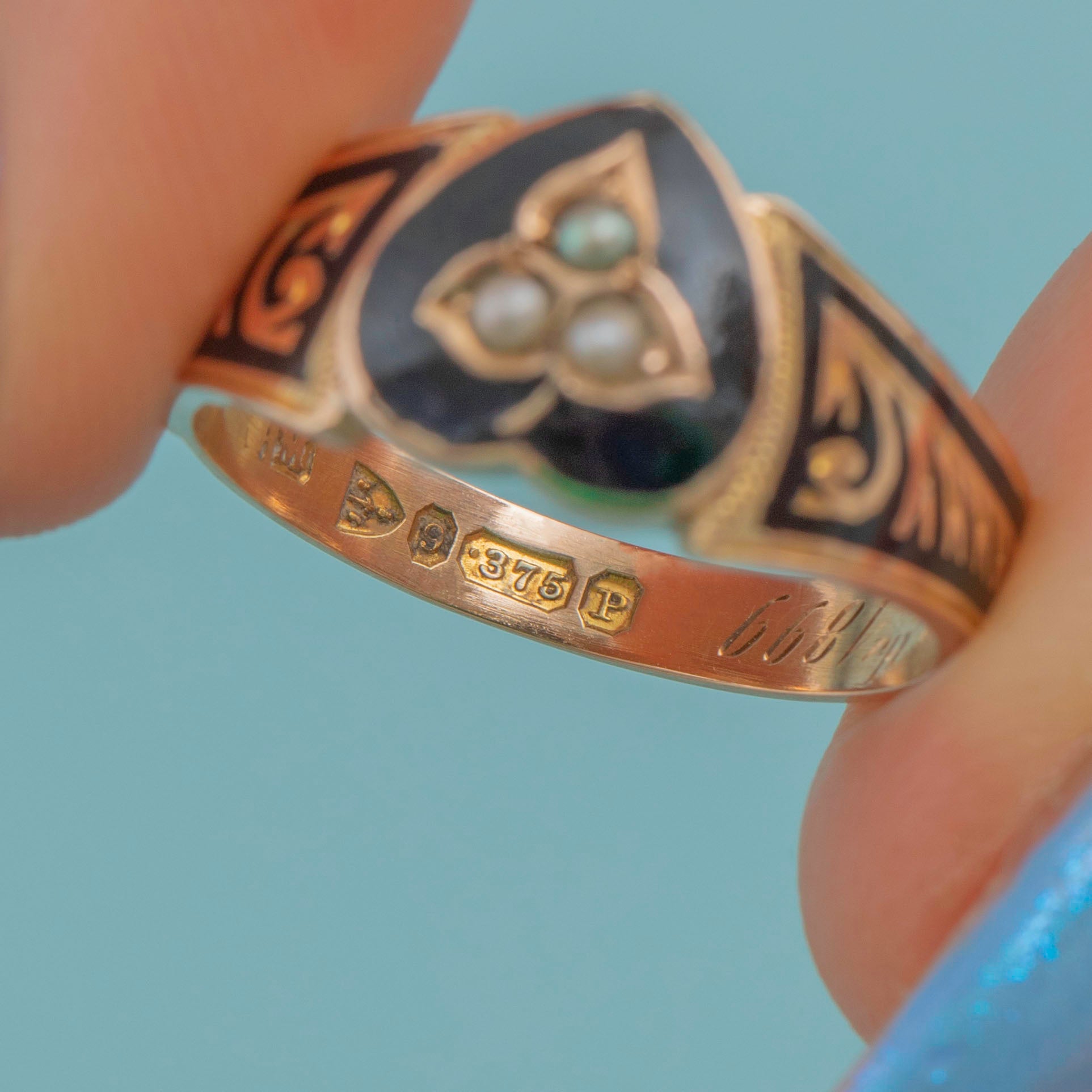 EXCELLENT. This Victorian 9ct Gold Enamel Pearl heart mourning ring is in excellent condition. The ring has been kept beautifully, even more so when you take the age of this ring into consideration. The Enamel work is pristine and the Pearls have remained secure. The hallmarks stamped inside the band are clear allowing us to date this coveted piece of Victorian mourning jewellery to 1898!