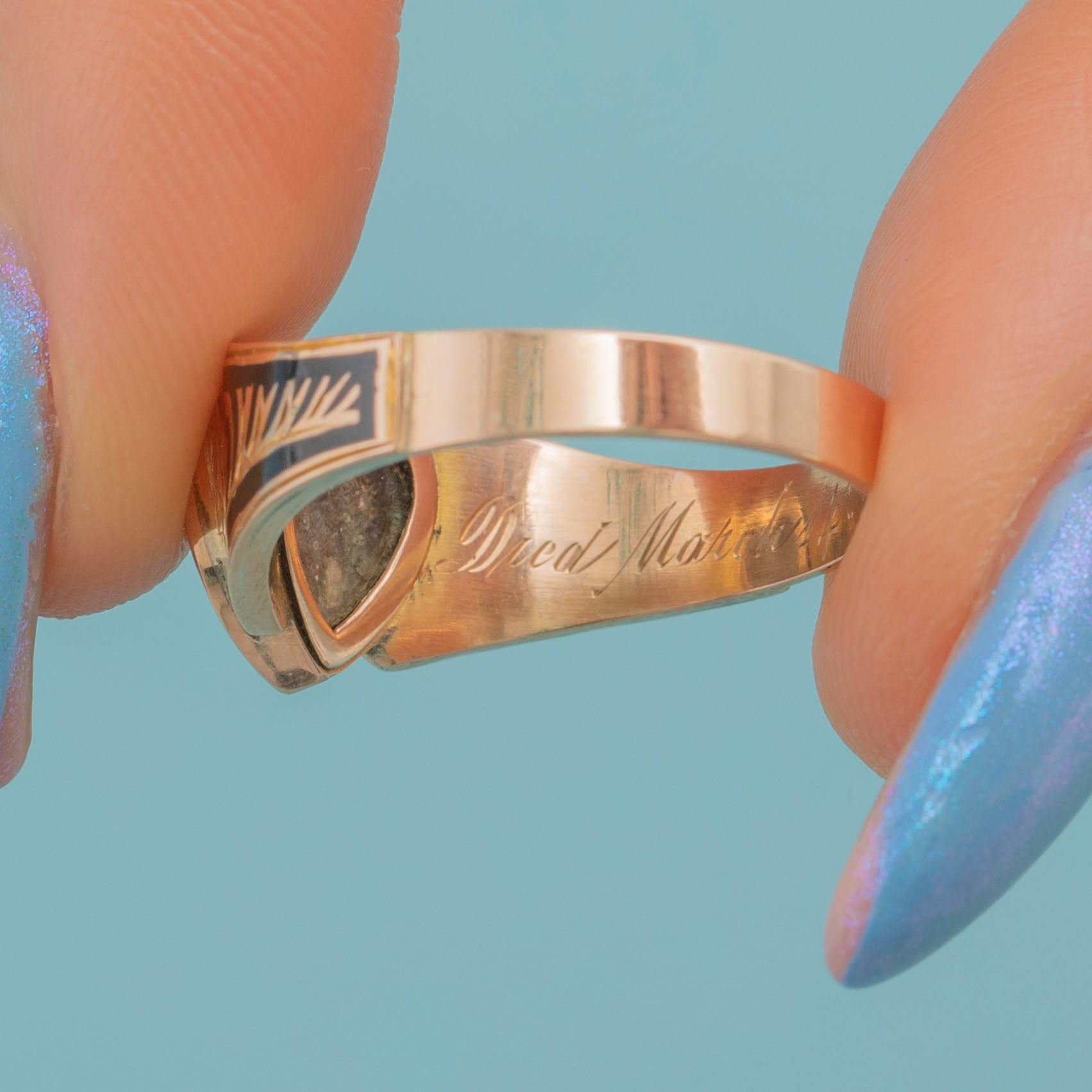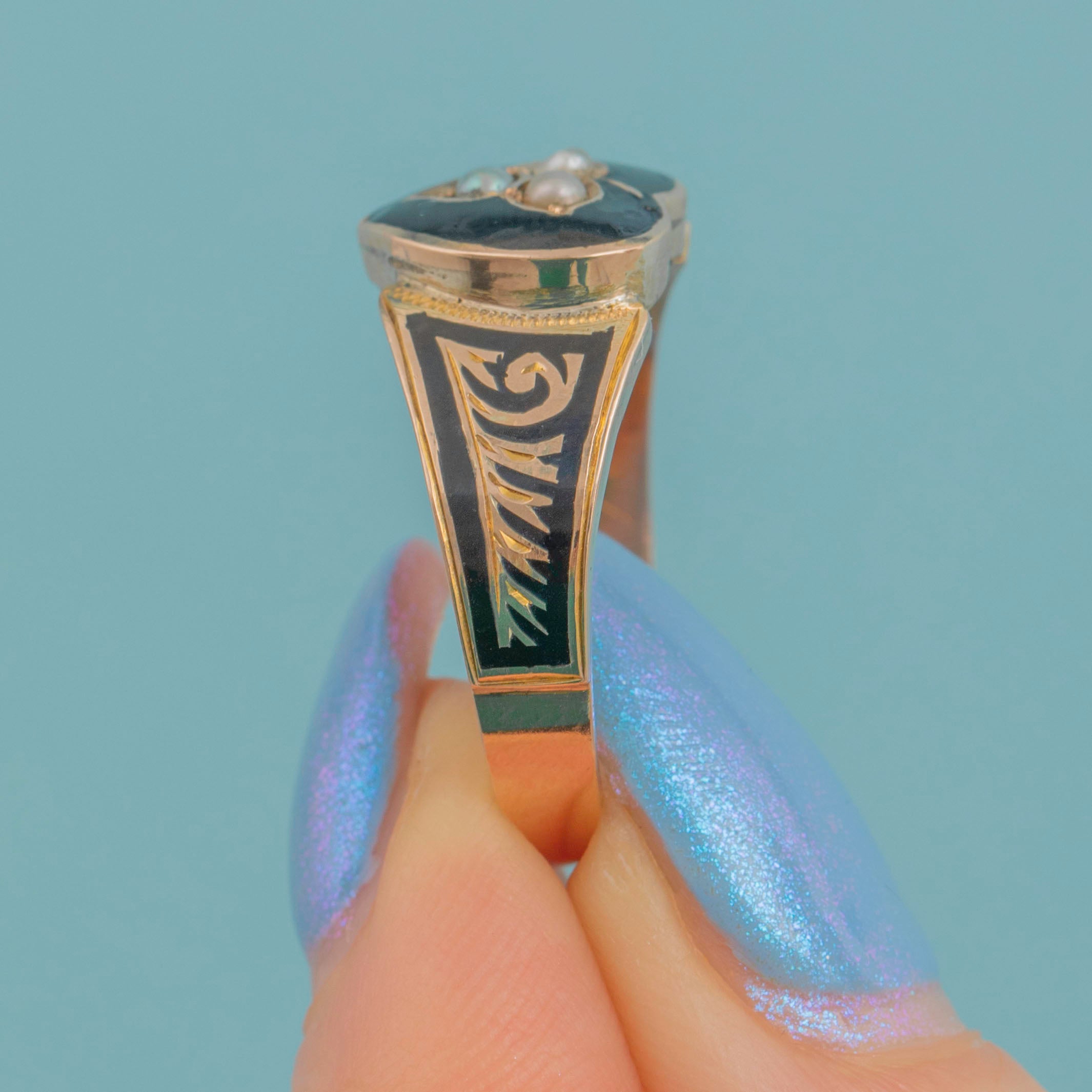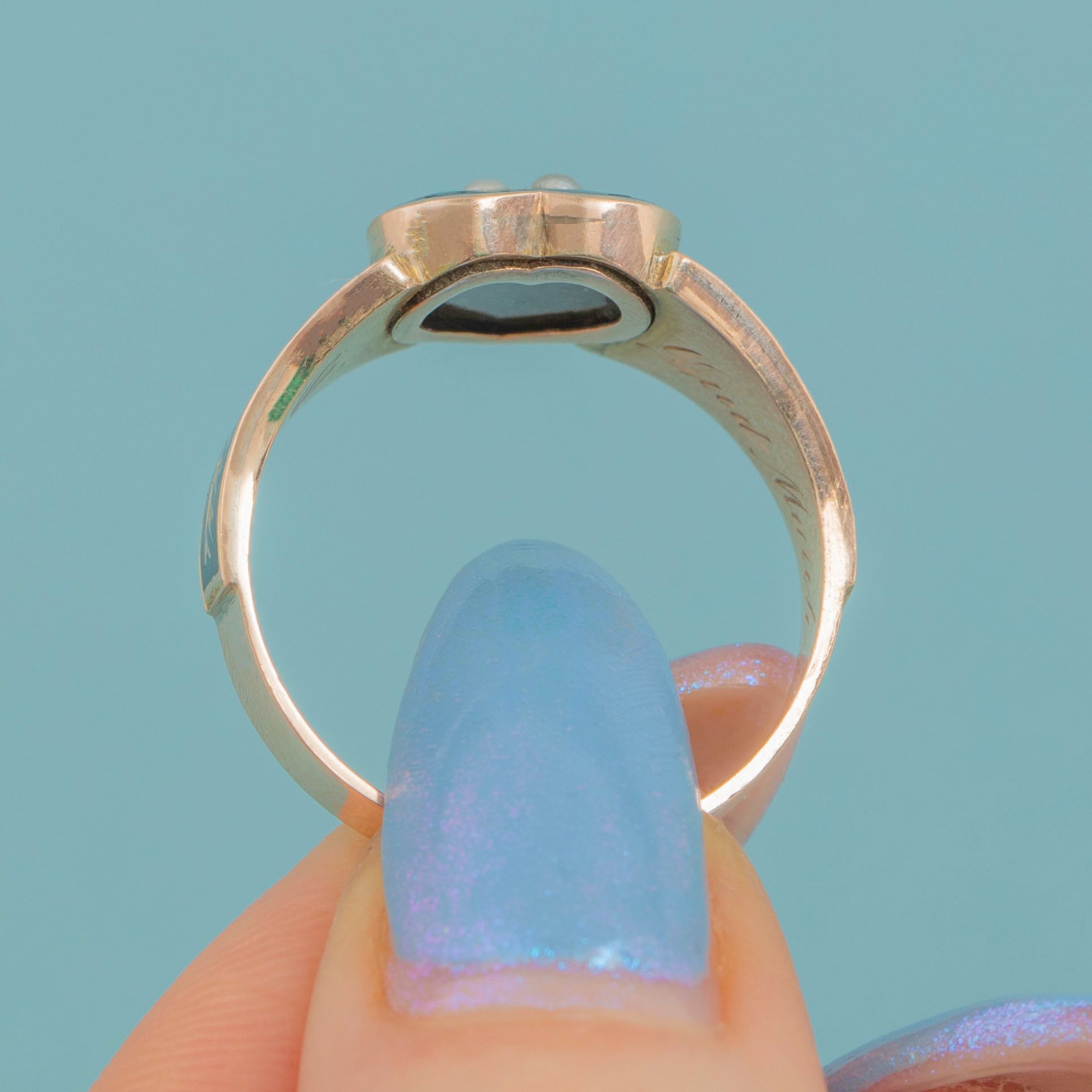 Victorian 9ct Gold Enamel Pearl Heart Mourning Ring, c.1898