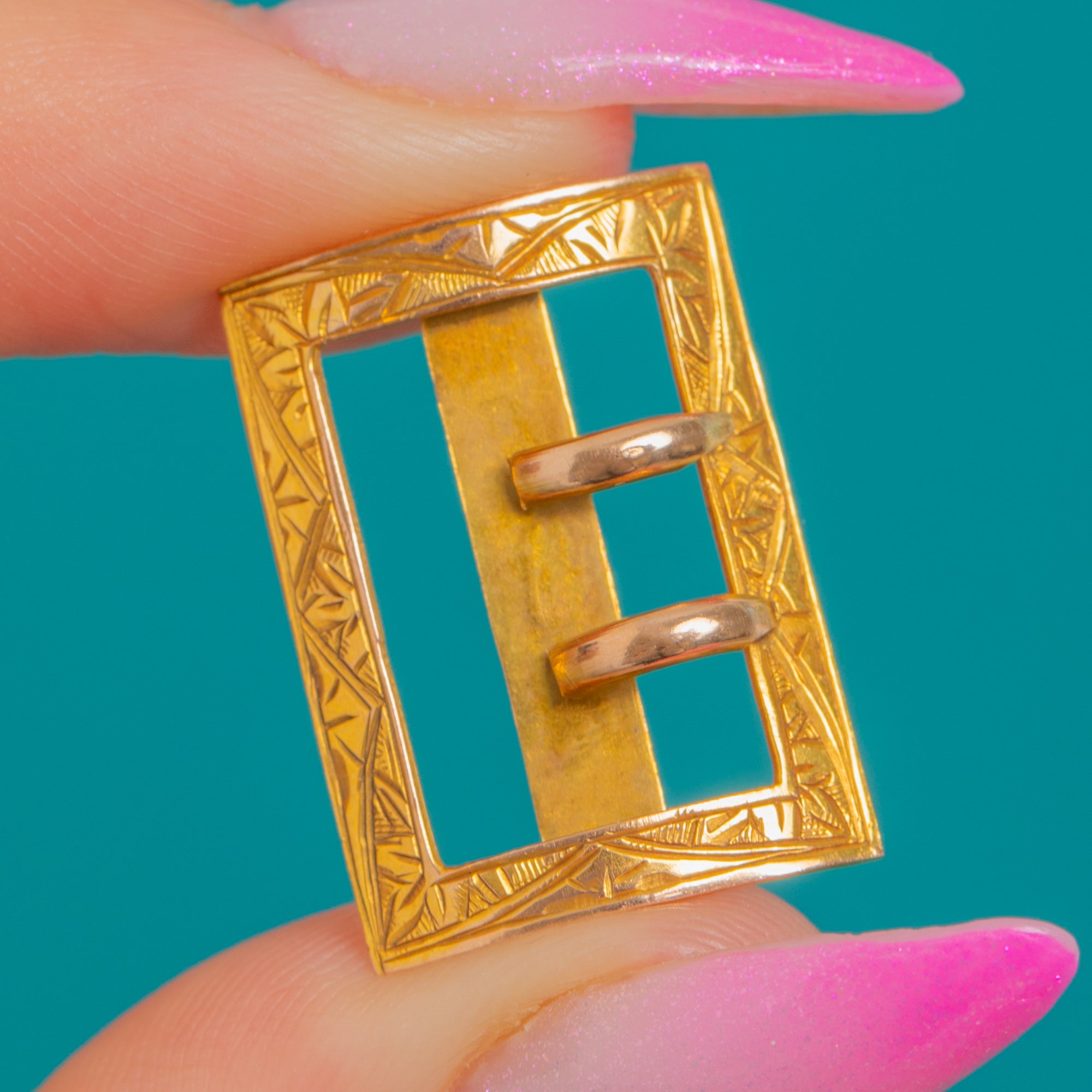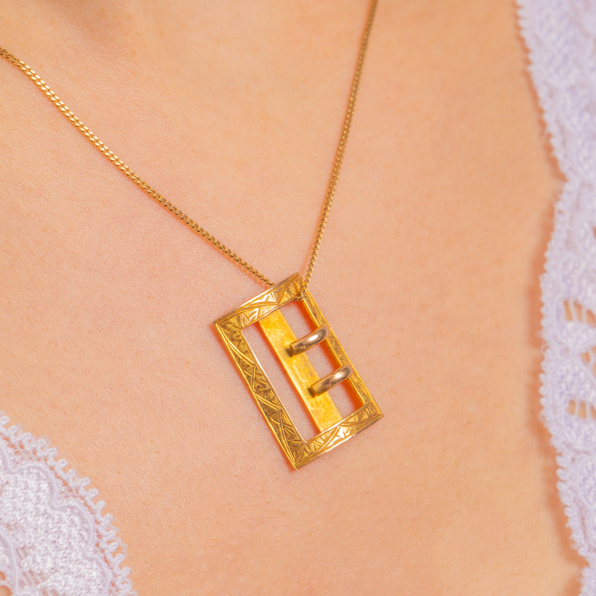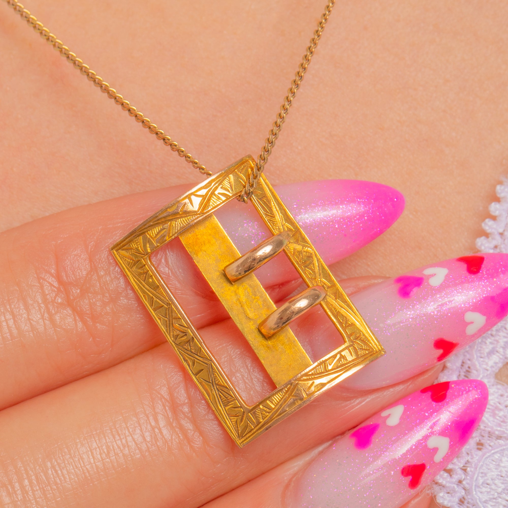 Dainty and distinctive, this Victorian 9ct Gold buckle slider pendant pairs restrained geometry with delicate engraved detail. Its openwork rectangular frame is punctuated by an applied central bar crossed by two short looped bars, all bordered by fine geometric and foliate engraving for a refined finish.