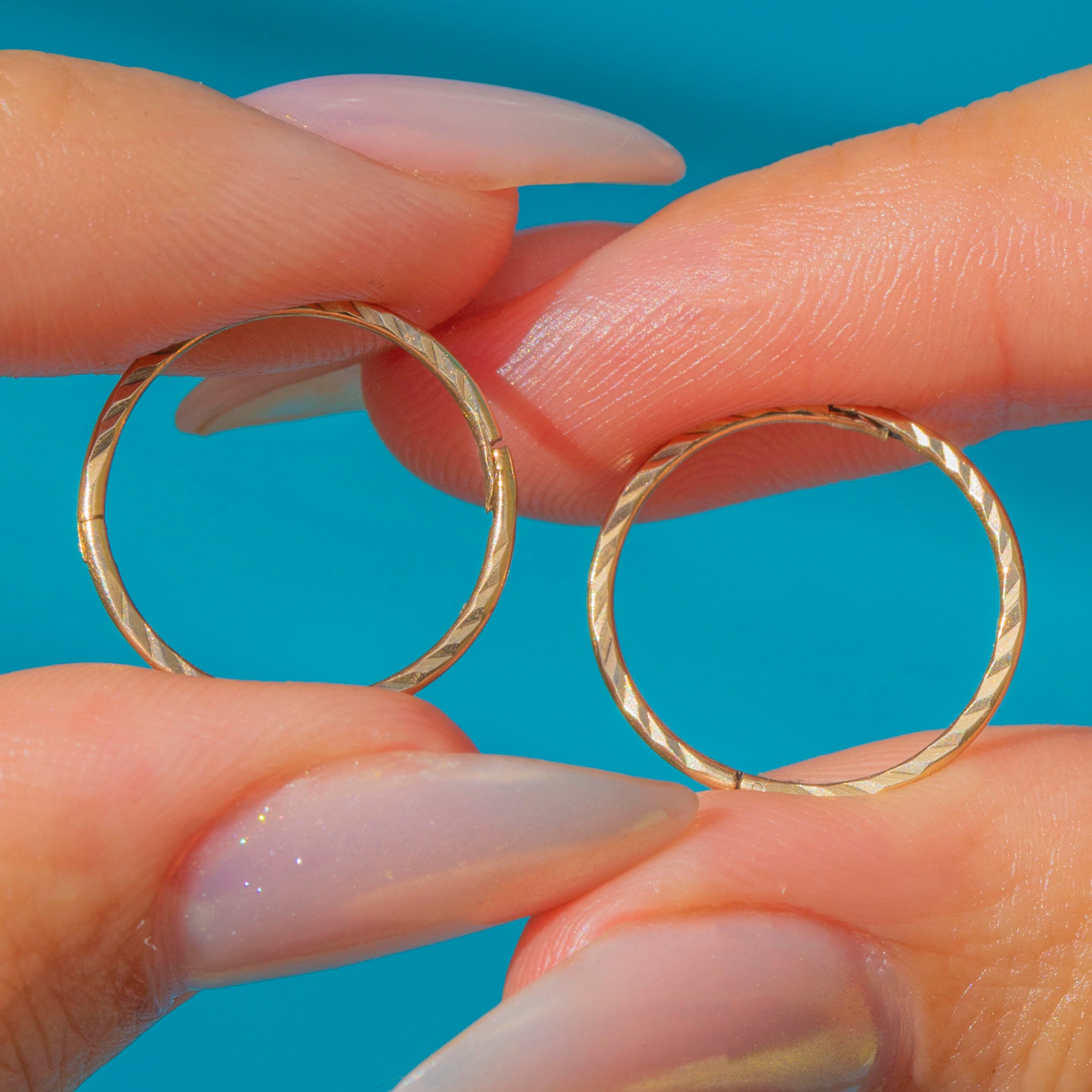 A fine pair of Antique Victorian sleeper hoop earrings, crafted in 9ct Gold. These pretty hoops measure 16mm in diameter, snug and comfortable for everyday wear. The Gold has a soft antique hue, enriched with subtle faceting that gives the surface a gentle sparkle.