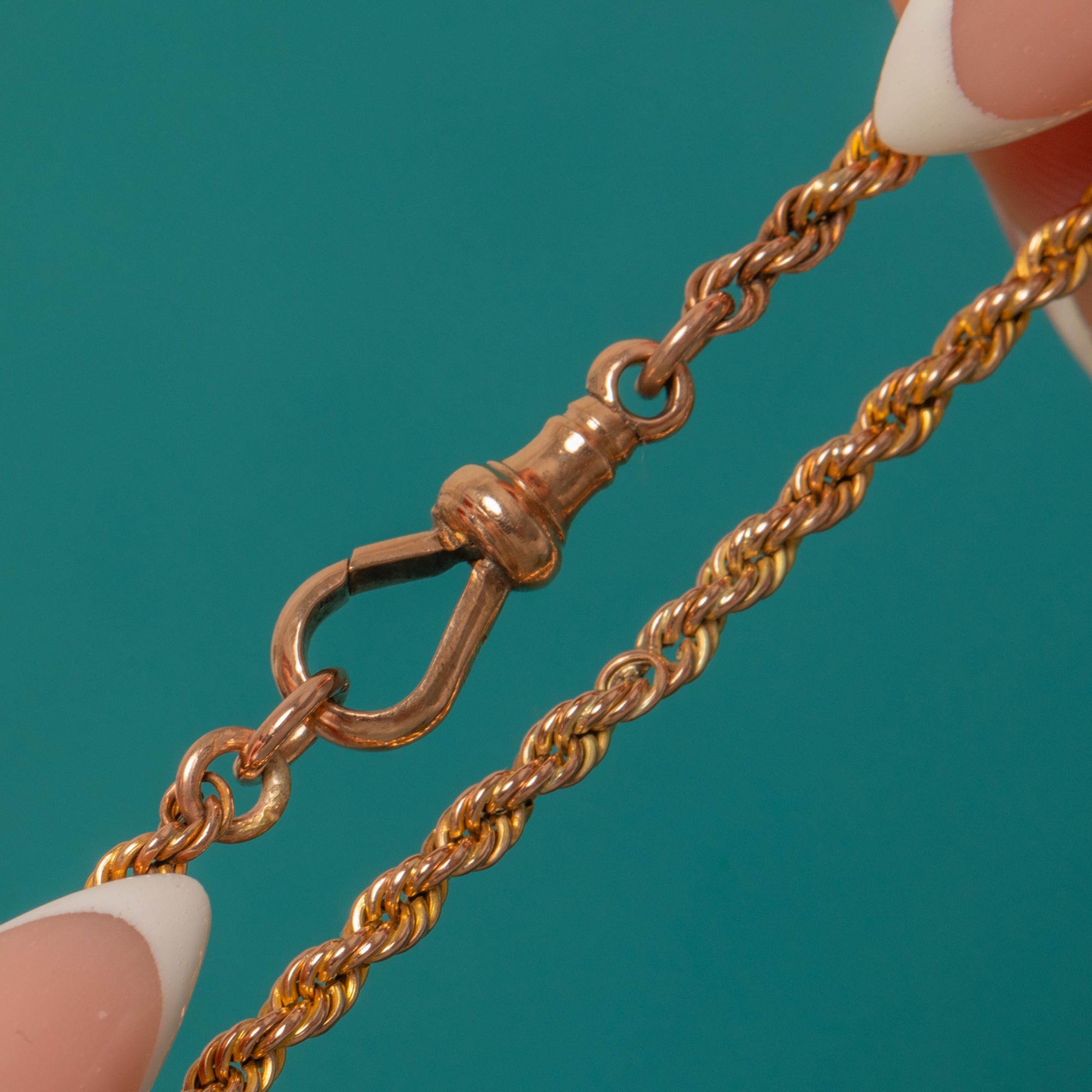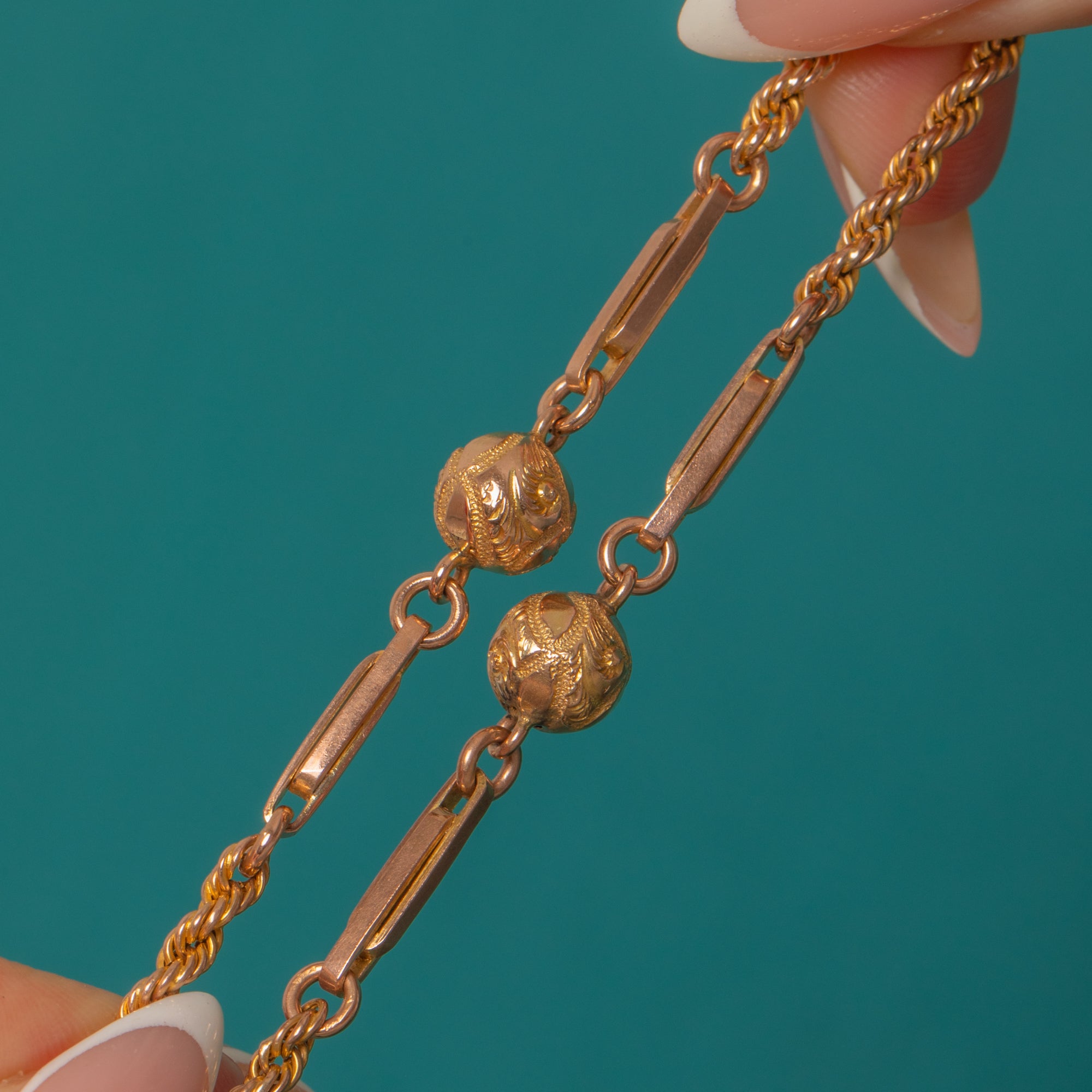 An elegant Victorian fancy link chain in glowing 9ct Gold. This long beauty flows with twisted rope links with ball and fetter sections formed of chased beads flanked by chunky paperclip links. The interplay of textures and the subtle rosy‑to‑yellow hues give it that unmistakable antique allure—ornate yet refined, with a graceful drape.
