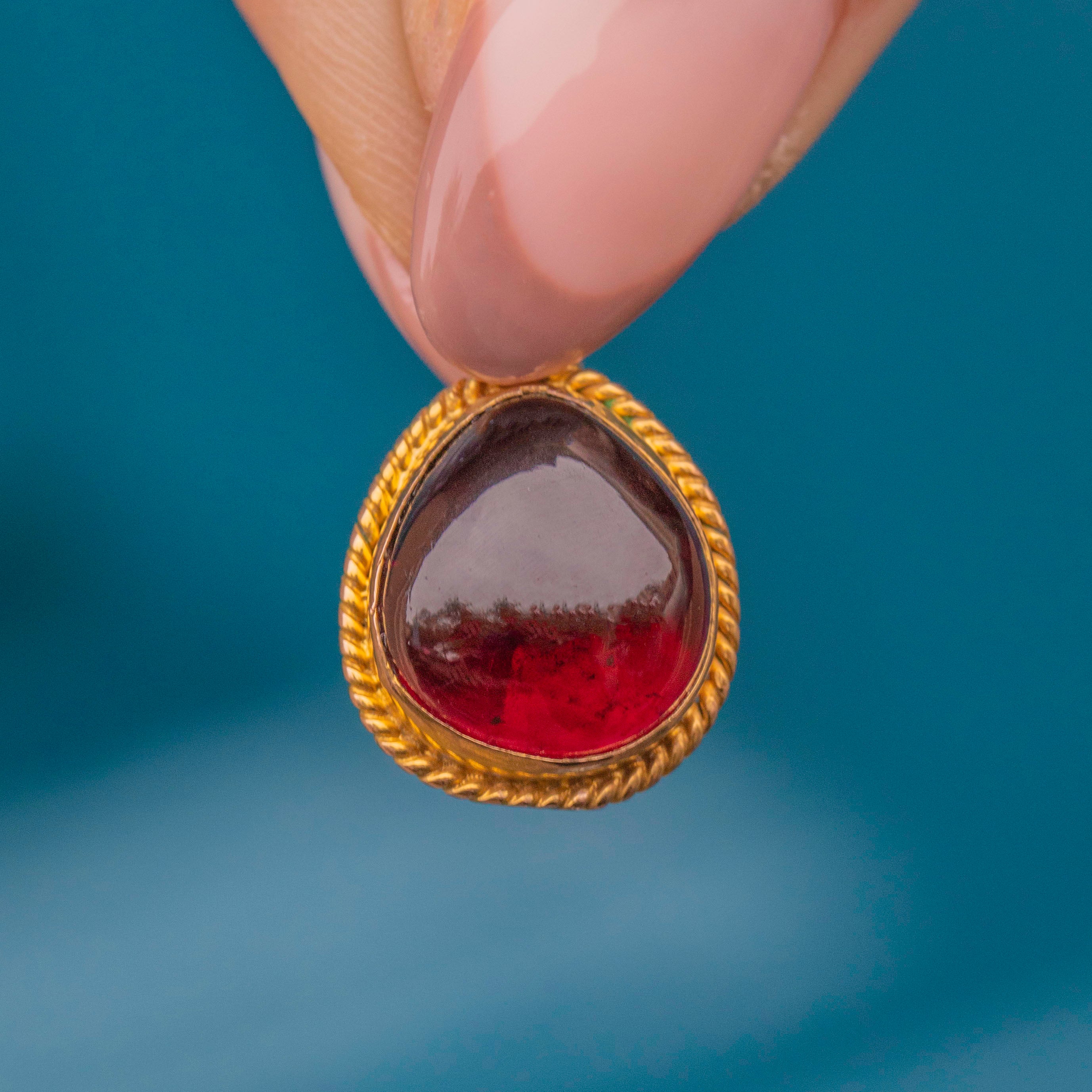 Add a drop of seduction to your décolletage with this sumptuous Victorian 9ct Gold Garnet cabochon charm! As the smoothly domed 8.17ct Garnet moves in the light, you will become mesmerised by the flashes of crimson emitting from its juicy core.