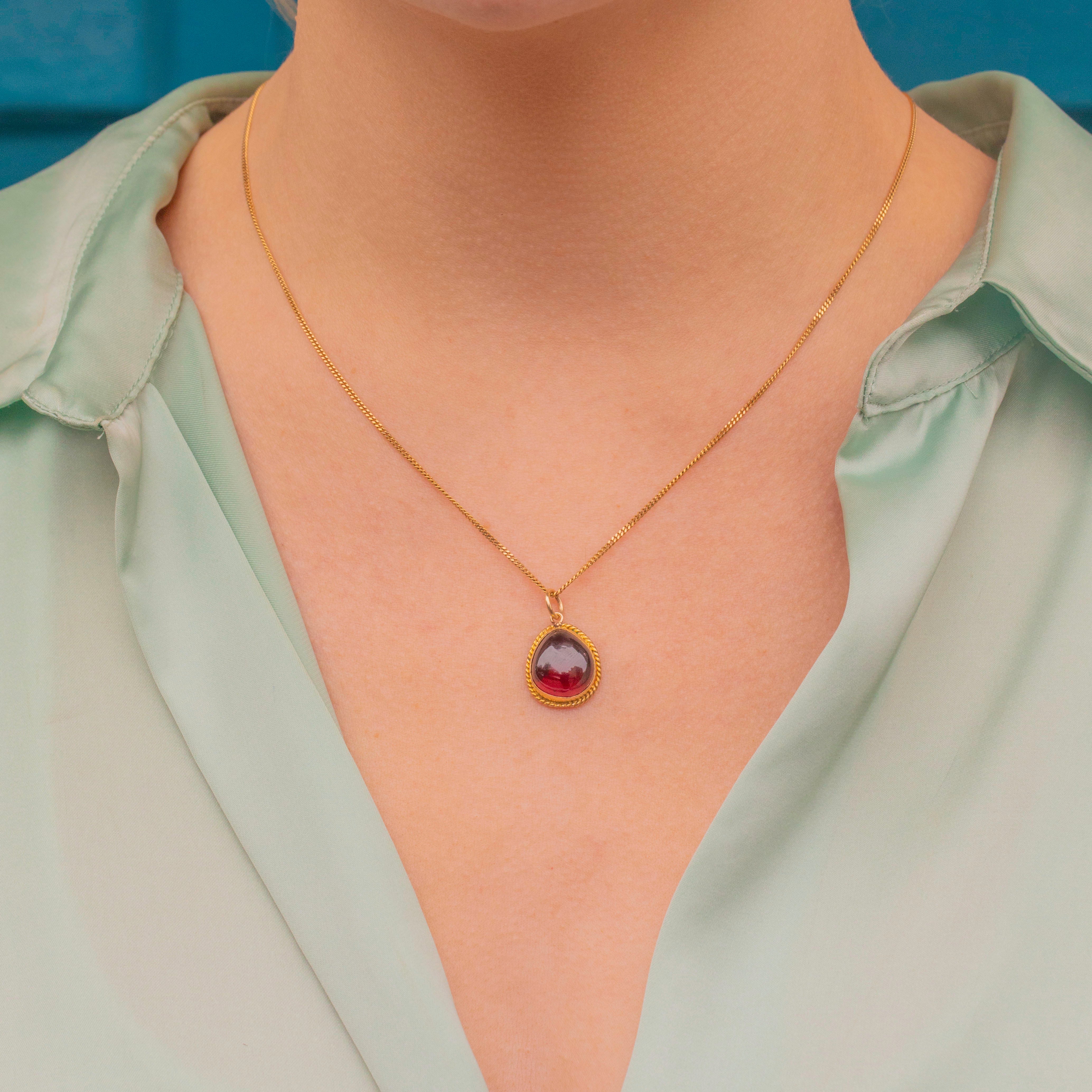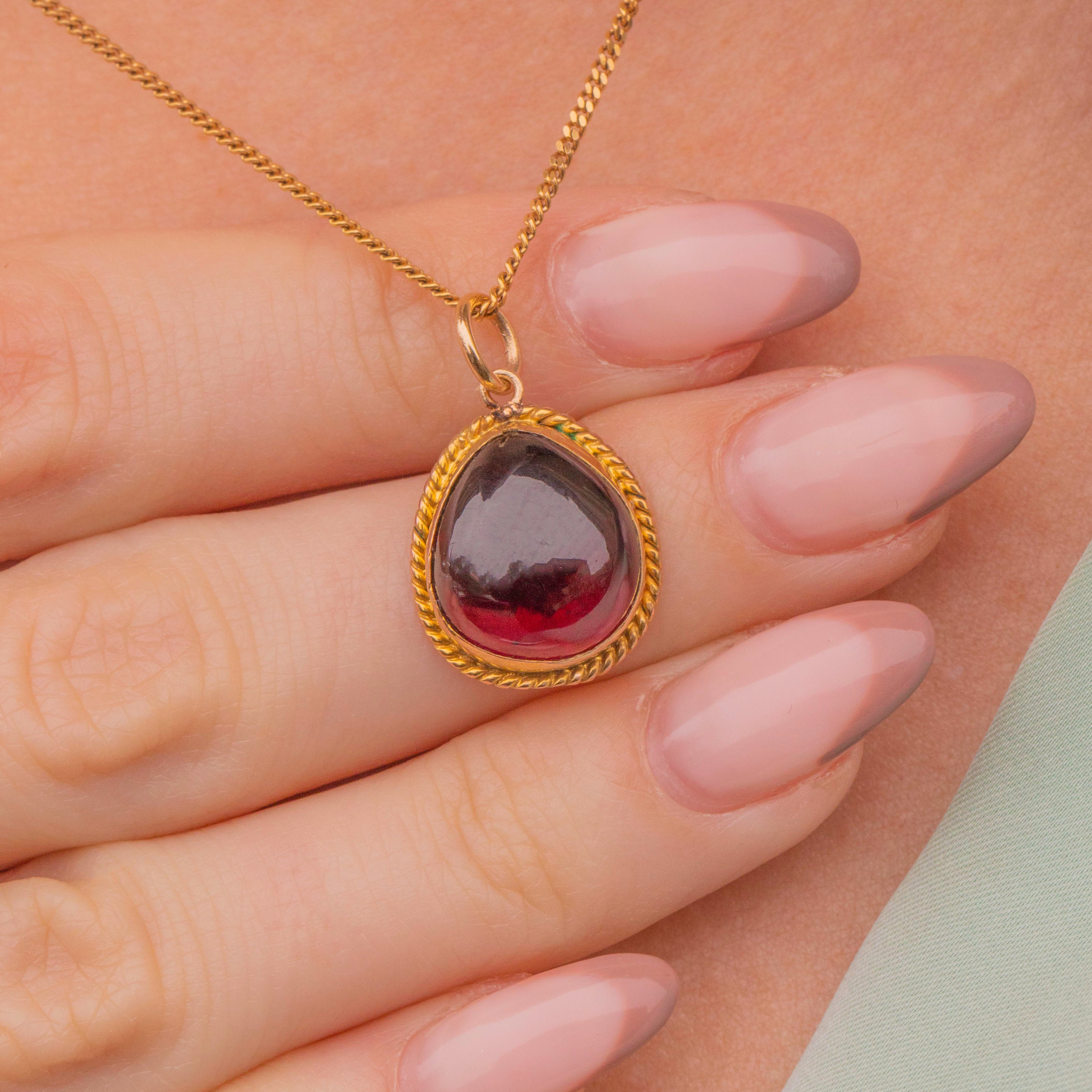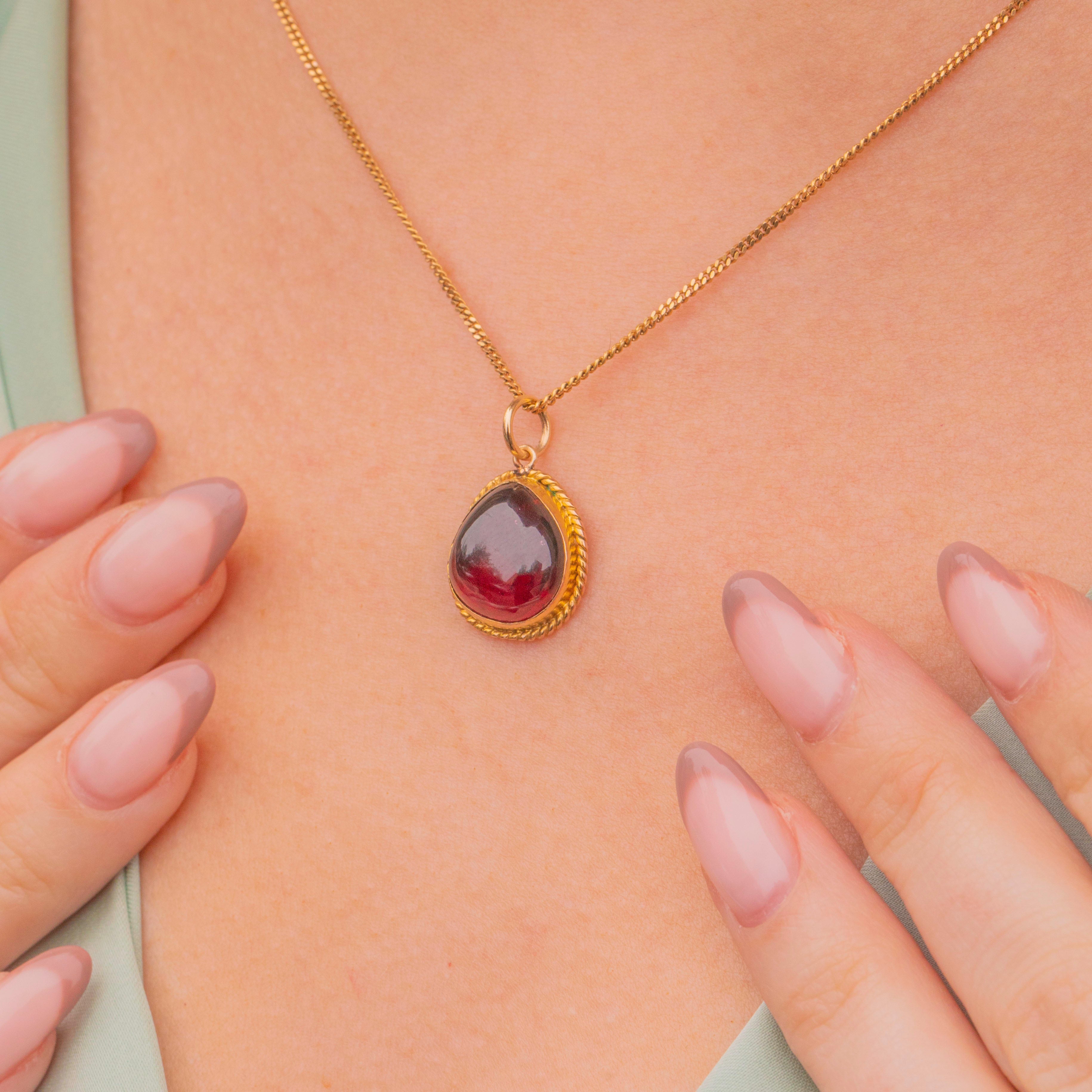 VERY GOOD. This Victorian 9ct Gold Garnet cabochon charm is in very good condition. The Garnet is plump with delicious berry red hues, with only minor surface wear noticeable under close inspection. Starting life as a brooch, this piece has been expertly converted into this highly wearable pendant, and there is some evidence of this on the back, but the finish is smooth and it wears comfortably against the skin. The Gold is buttery throughout and the rope detail is firmly affixed, with the bezel still holding the Garnet securely in place.