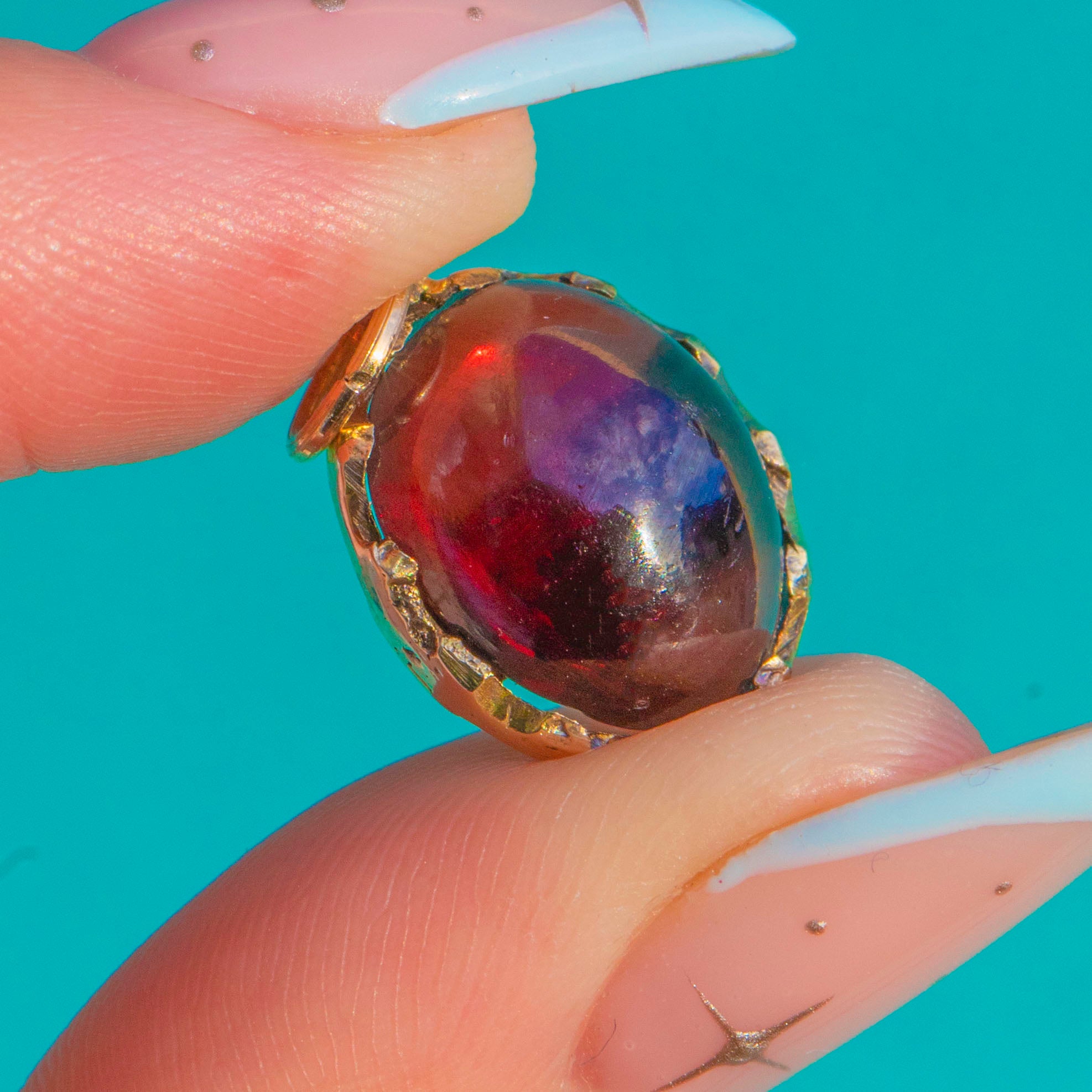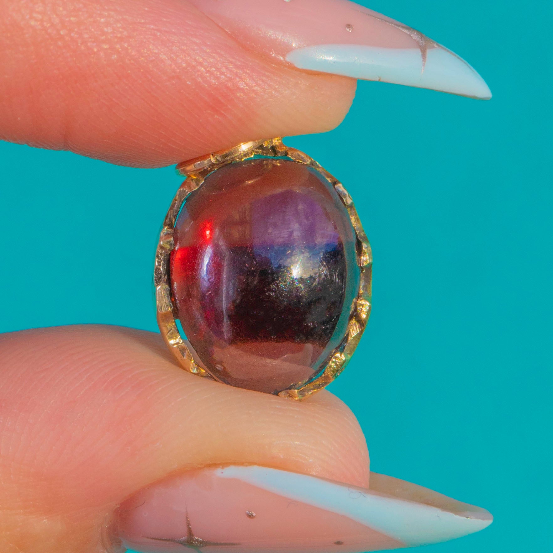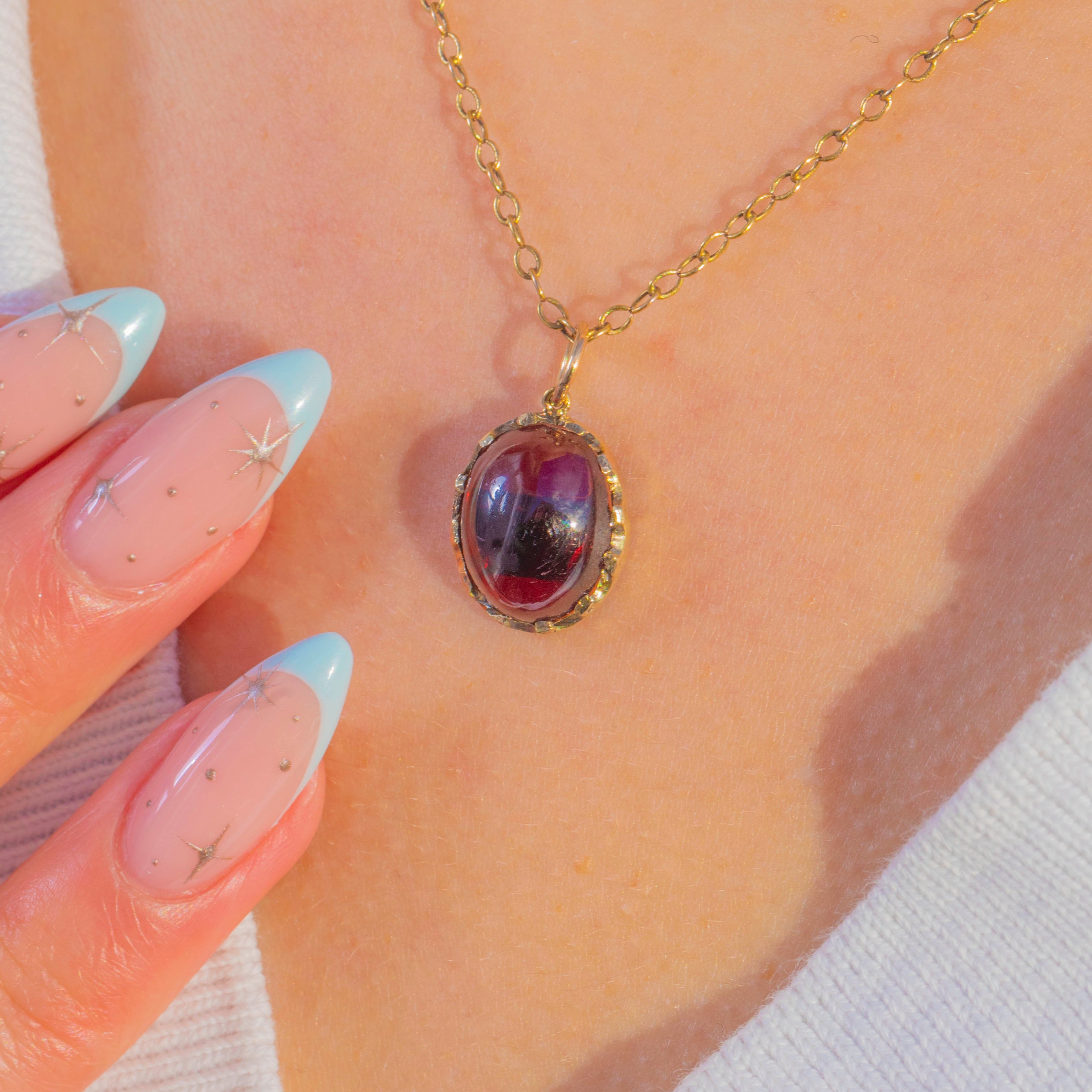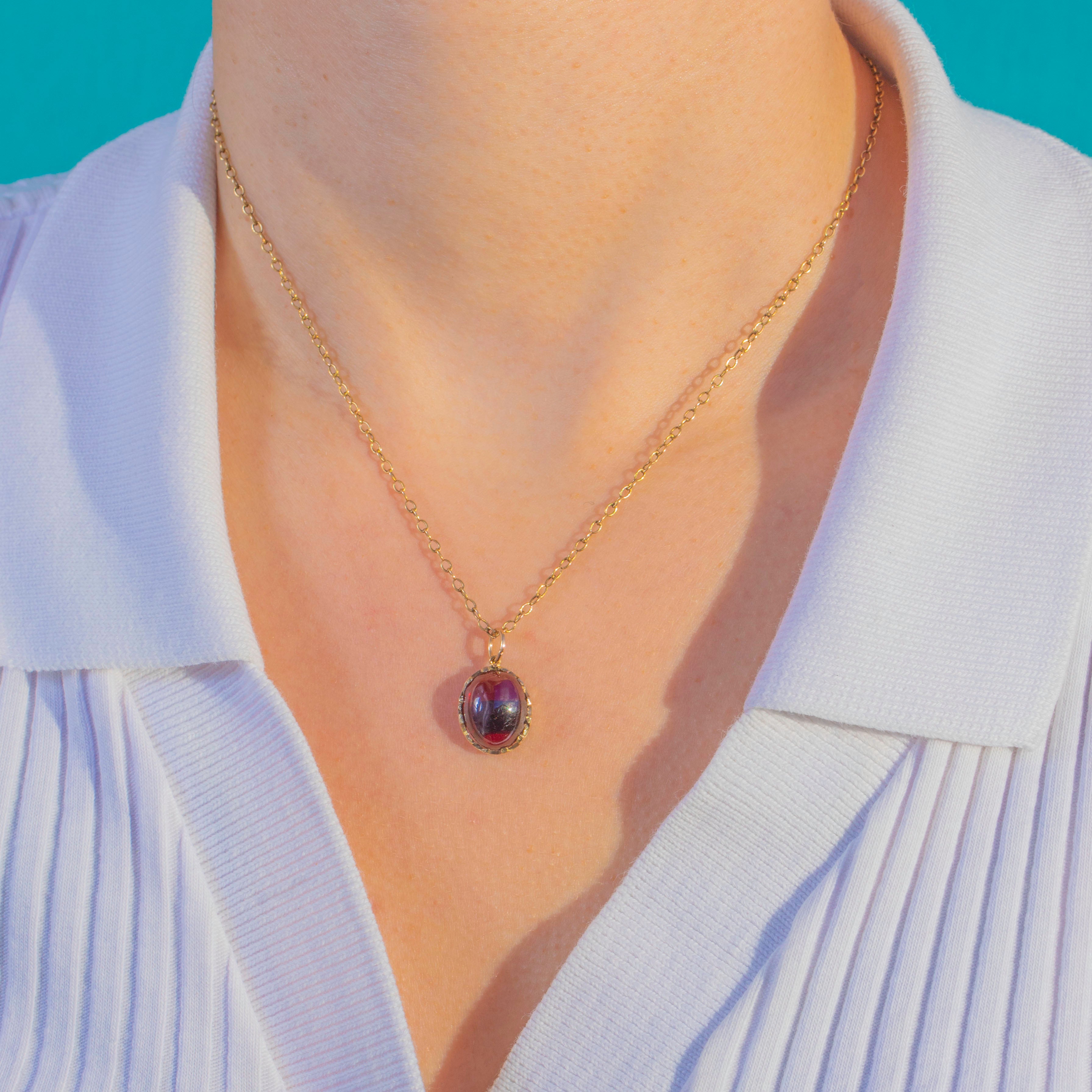 A petite Victorian treasure, this charming Garnet pendant showcases a rich claret-red cabochon displayed in a textured setting of buttery 15ct Gold. The high-domed 9.27ct Garnet catches the light beautifully, its glossy surface and deep wine tones offering a romantic glow that feels timeless and elegant.