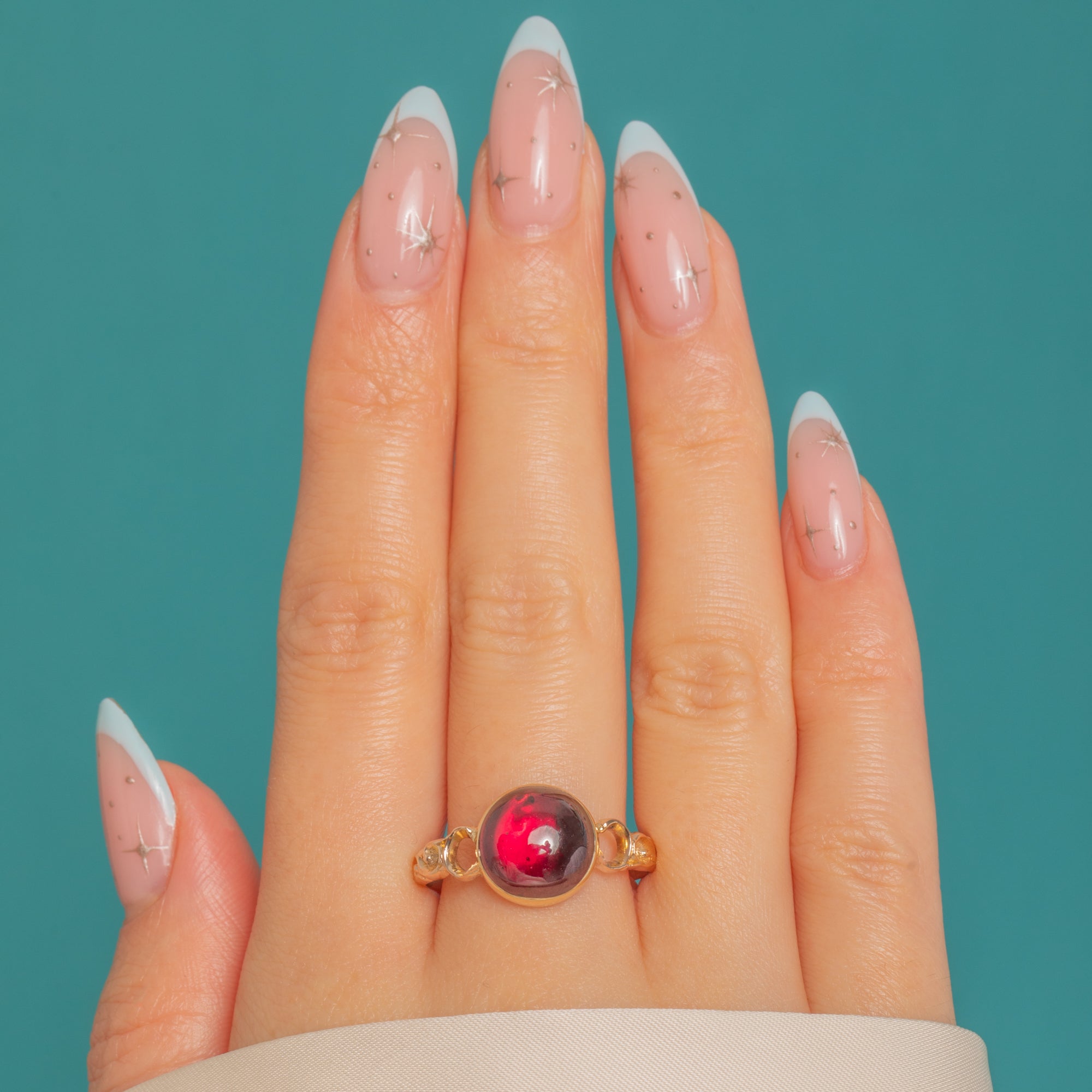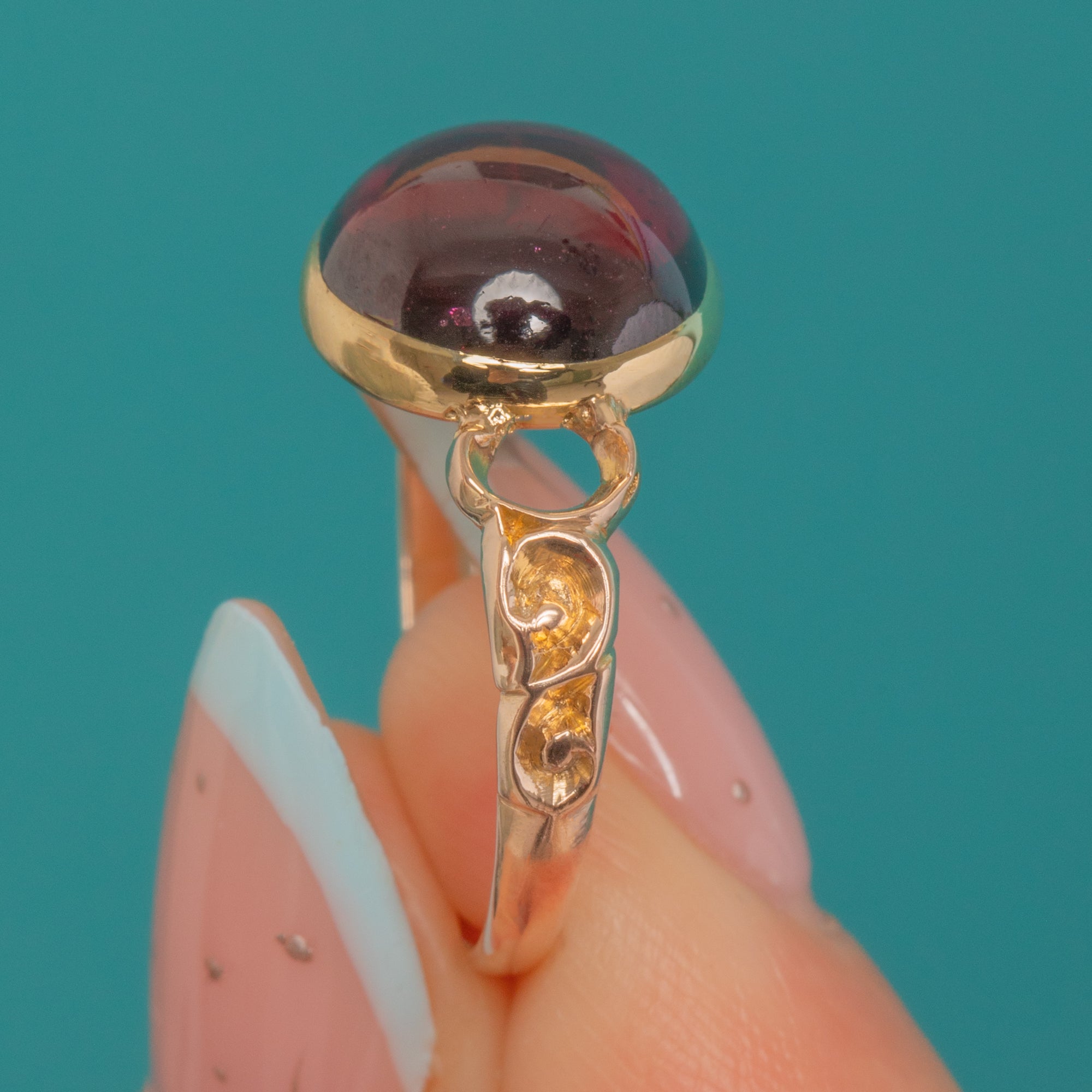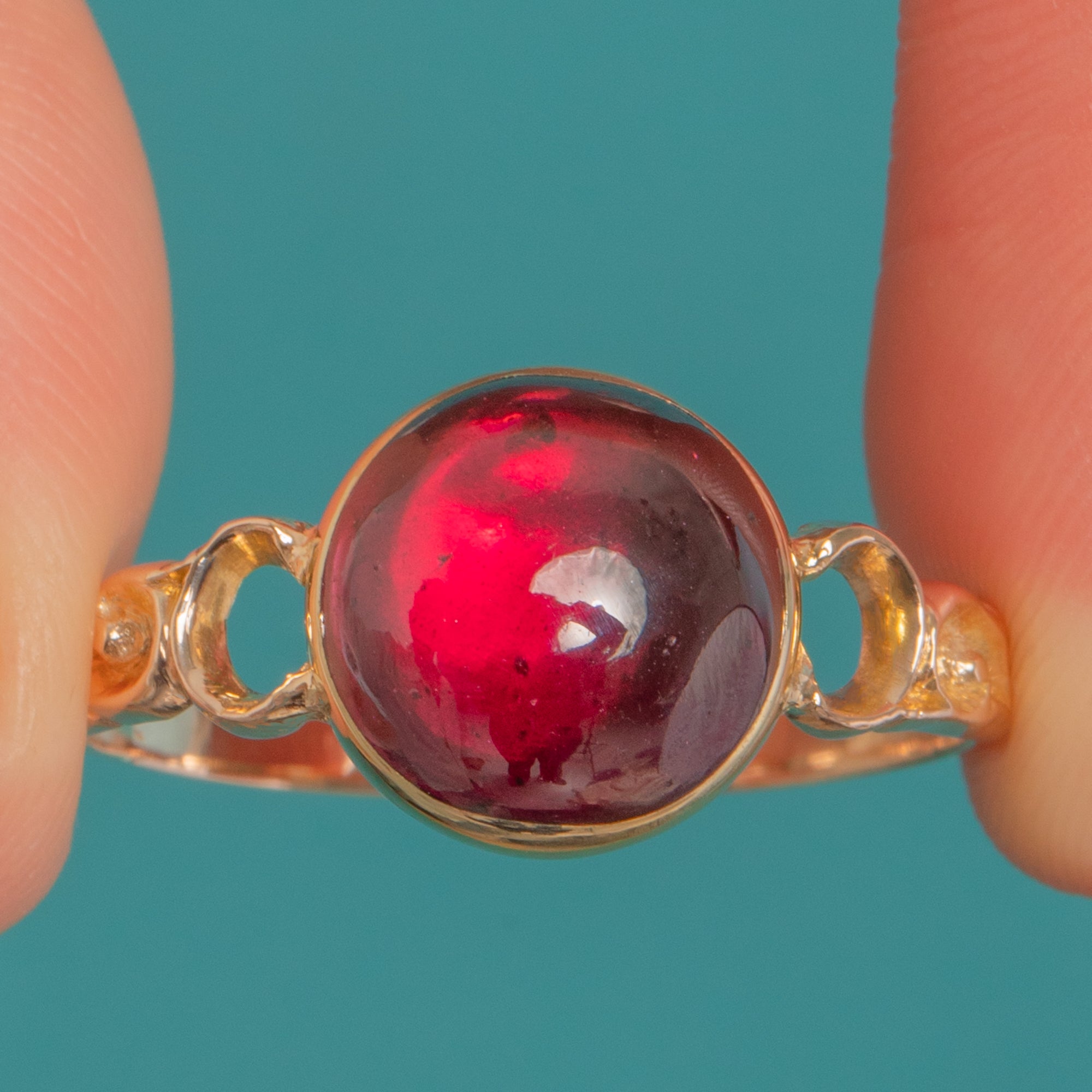 Bold and beautiful, this Victorian 9ct Gold ring spotlights a luscious round Garnet cabochon in a smooth rub-over bezel. The high, gem-forward dome glows a deep red to reddish-purple with natural internal inclusions, giving that moody, romantic allure we love in period Garnet.