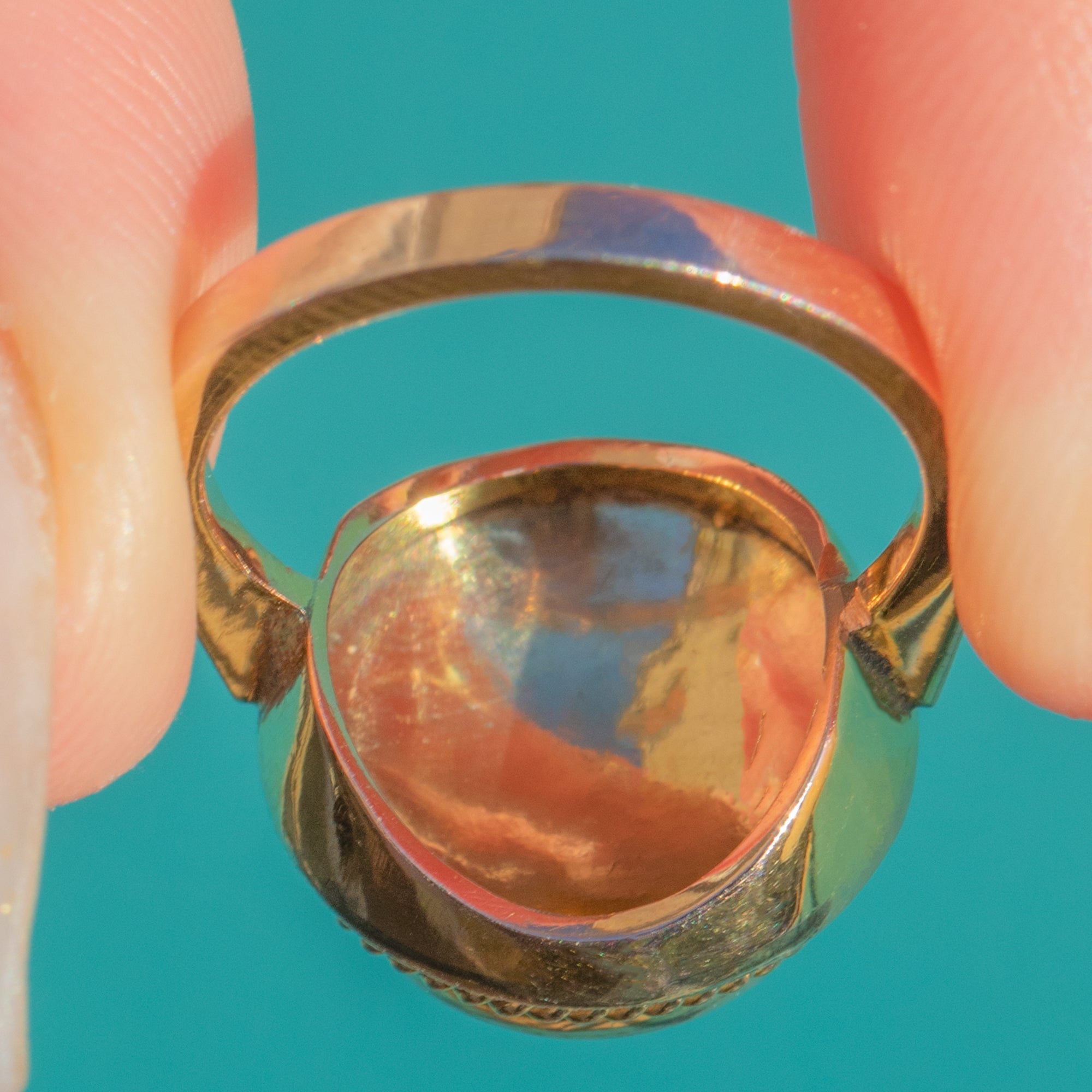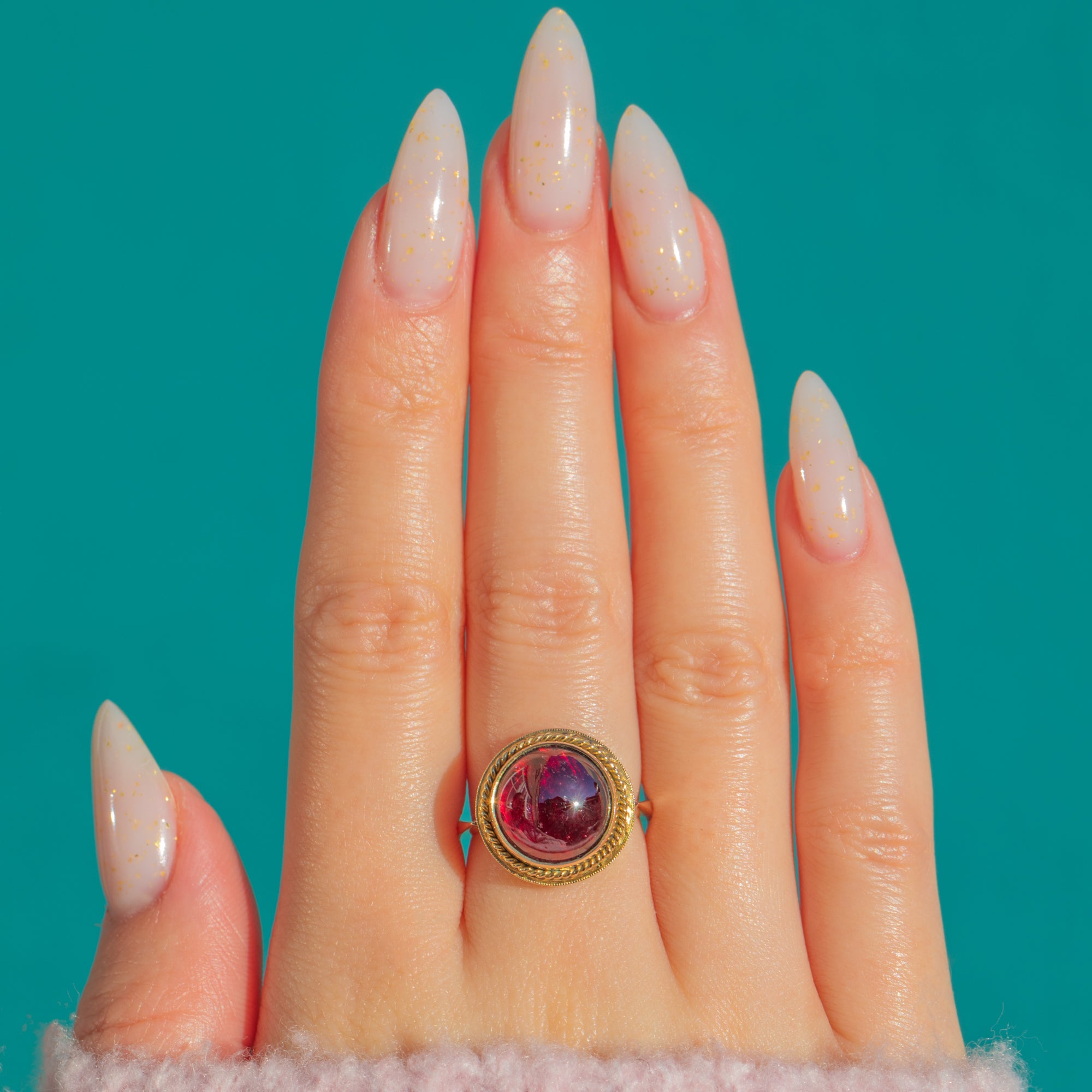 A striking Victorian Garnet solitaire, this luscious cabochon glows a deep wine-red from a bold, sculptural setting in bright yellow 9ct Gold. The round, high-domed 4.75ct Garnet is cradled in a tall bezel atop a circular platform, its edge framed with classical rope‑twist for beautiful texture and definition.