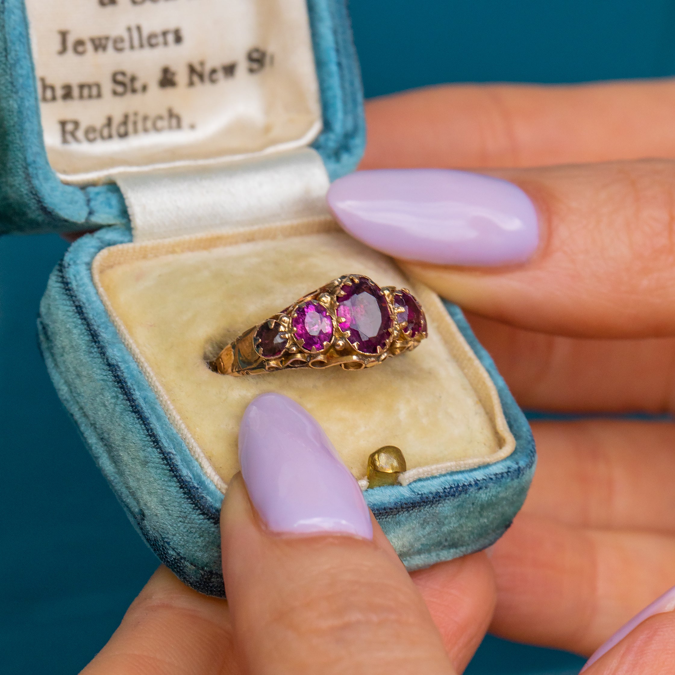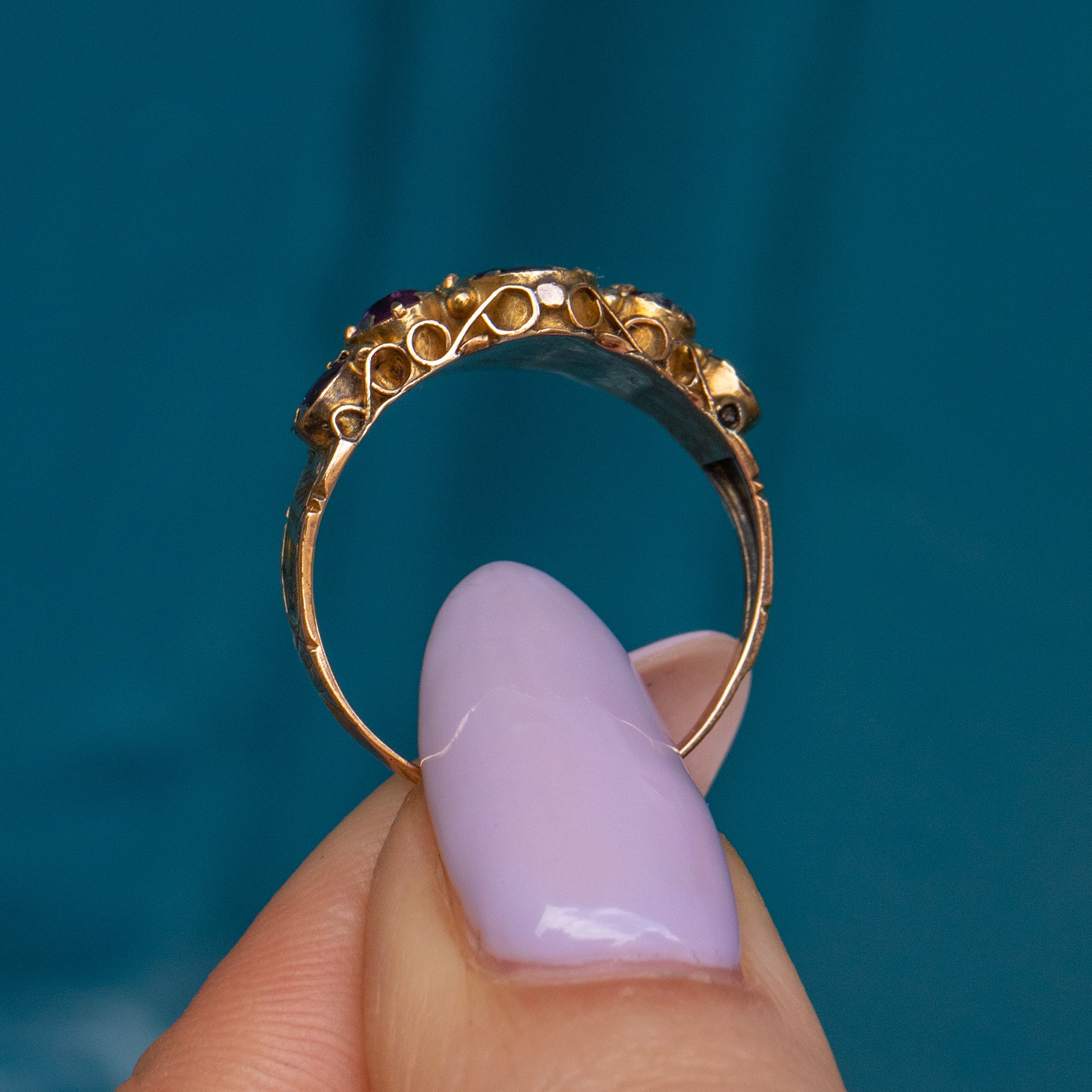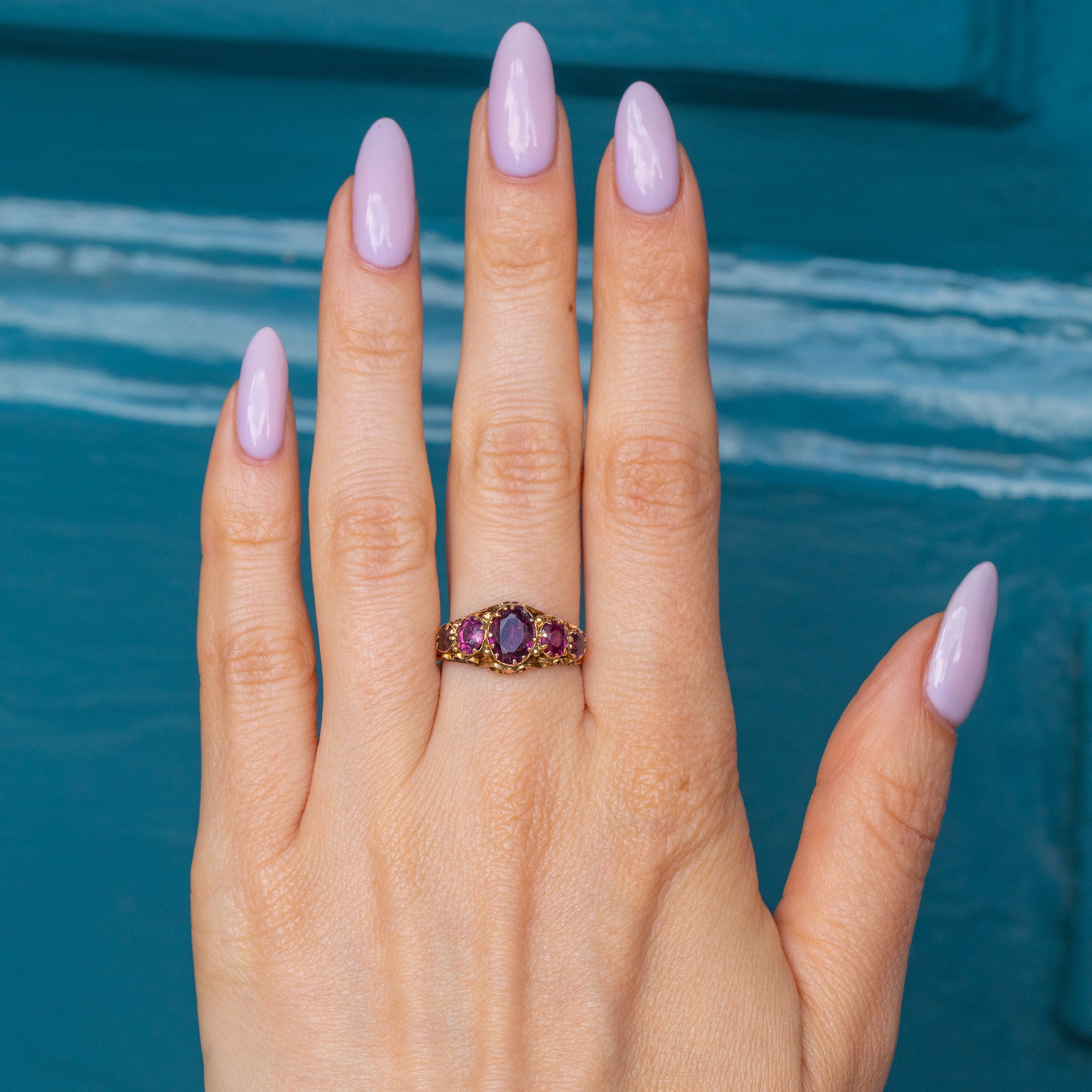 This Victorian 9ct Gold Garnet five stone ring is an antique collector's dream! Bursting with intricate craftsmanship, this antique ring homes five Garnets with punchy purple hues that glisten beneath the light.