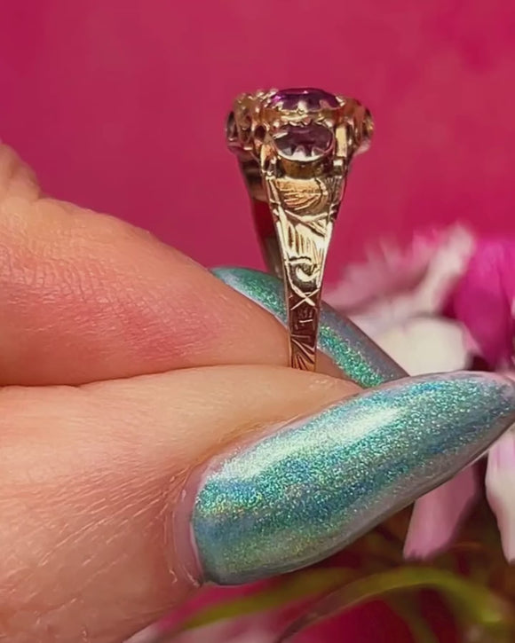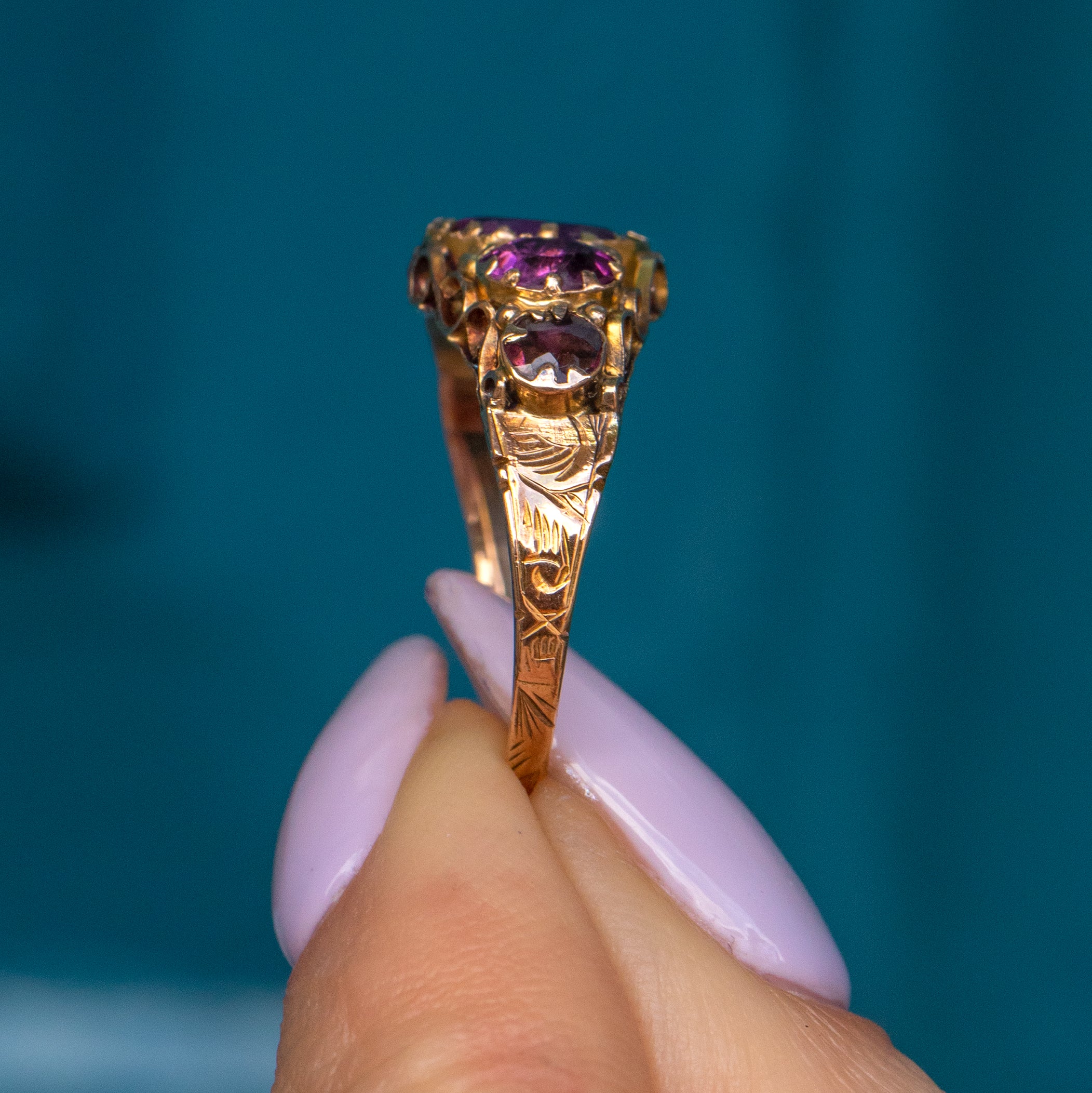 Each plum infused Garnet is hugged by claw settings poised atop a gallery of scrollwork crafted entirely from sun-kissed 9ct Gold. With her shank inlaid with delicate engravings, her beauty can be appreciated from all angles. You will never tire of looking at this Victorian Garnet ring!