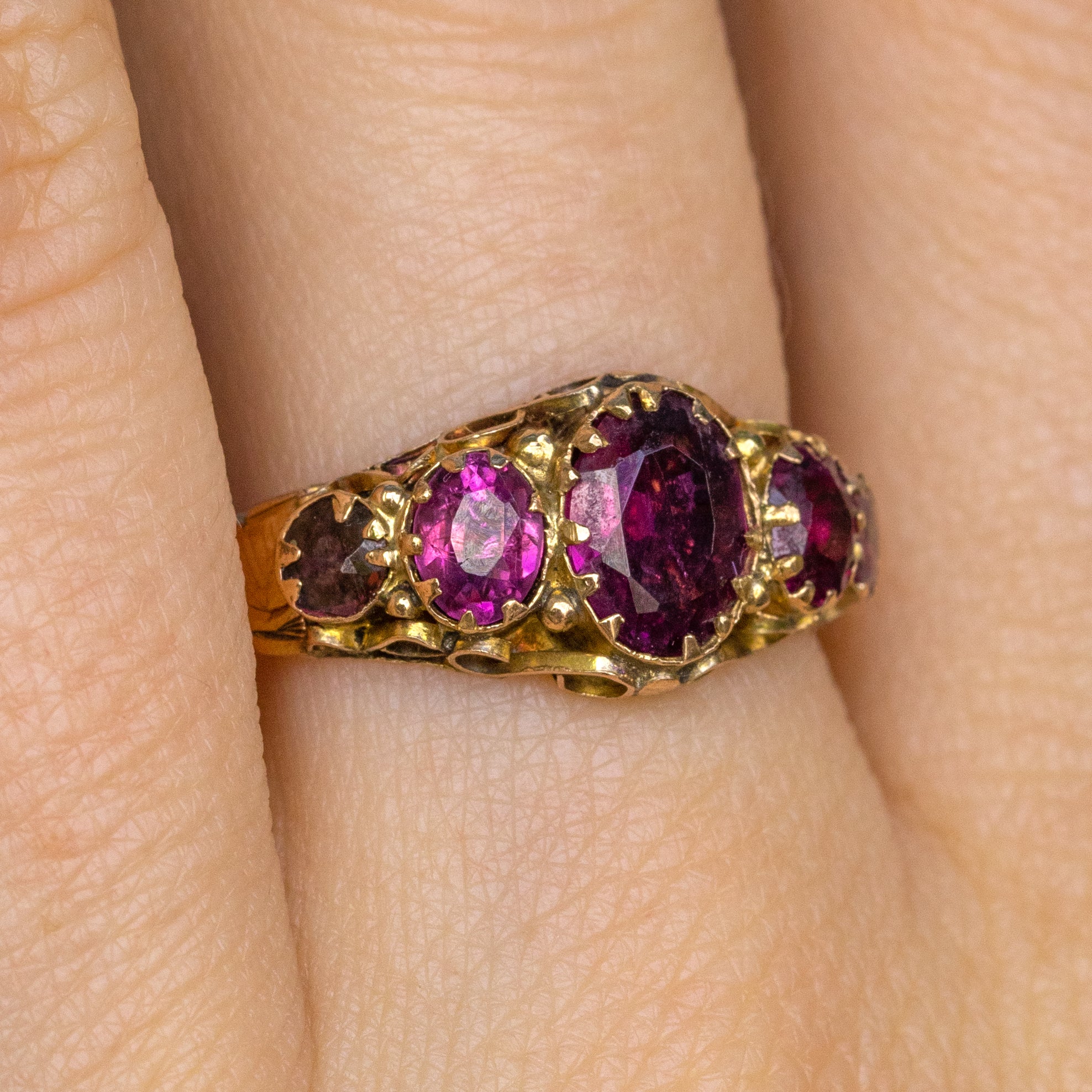 VERY GOOD. This Victorian 9ct Gold Garnet five stone ring is in very good condition. The Garnets are all secure, with no damage to note, and offer a rare rich grape hue. The Goldwork surrounding is all securely soldered and in great condition. To the inside of the band there is subtle wear throughout but this does not affect her comfortability. A gorgeous find, we can't imagine she will be in our possession for long!