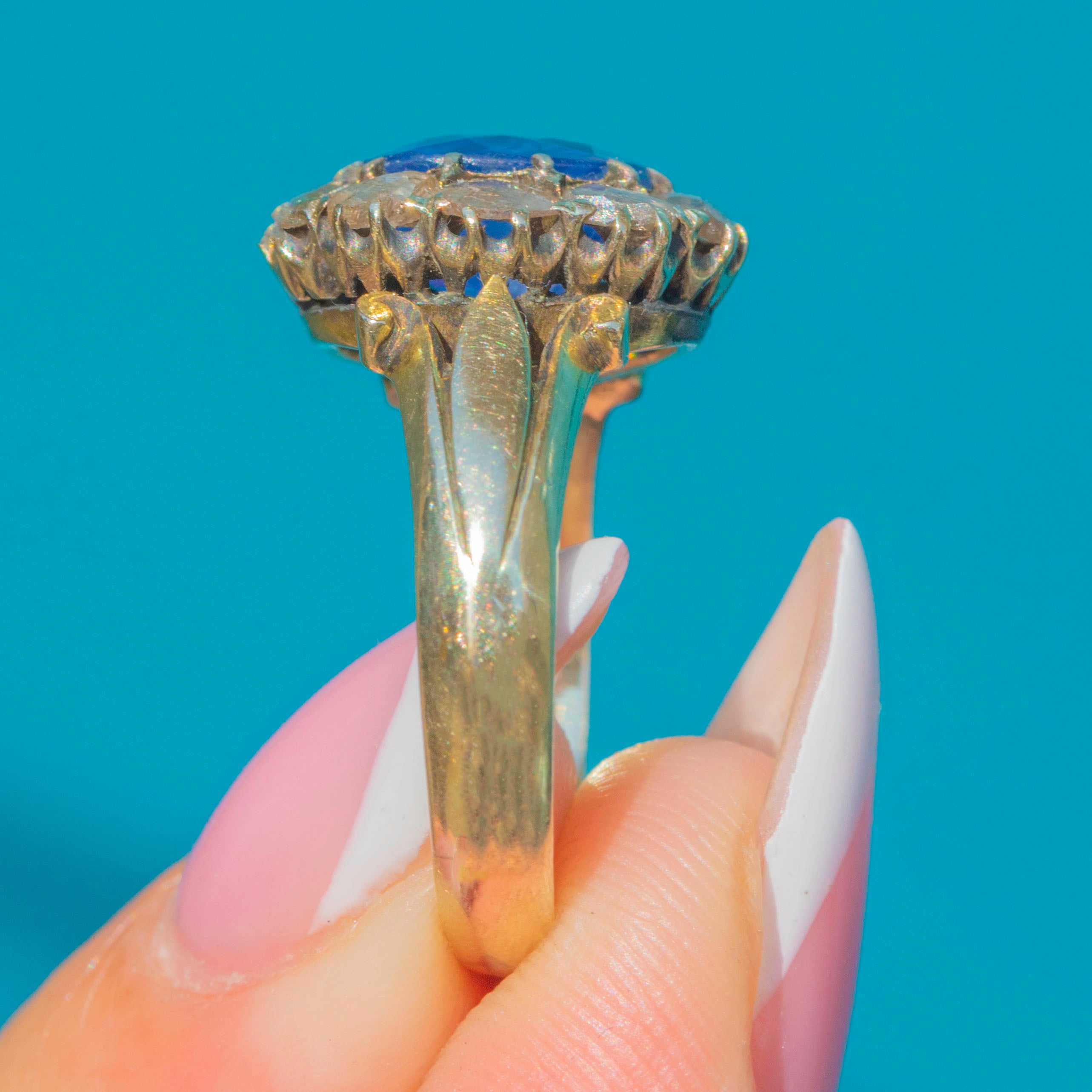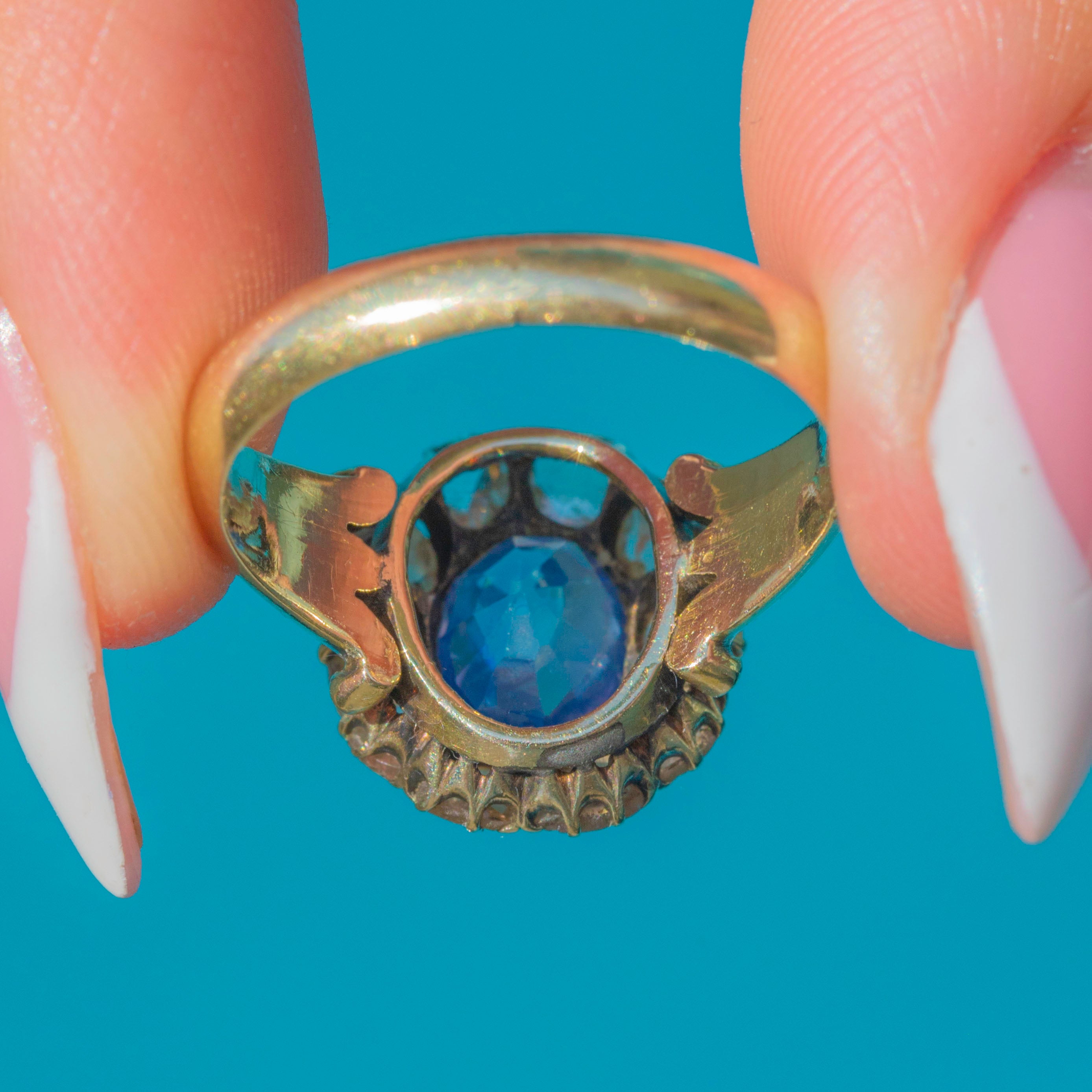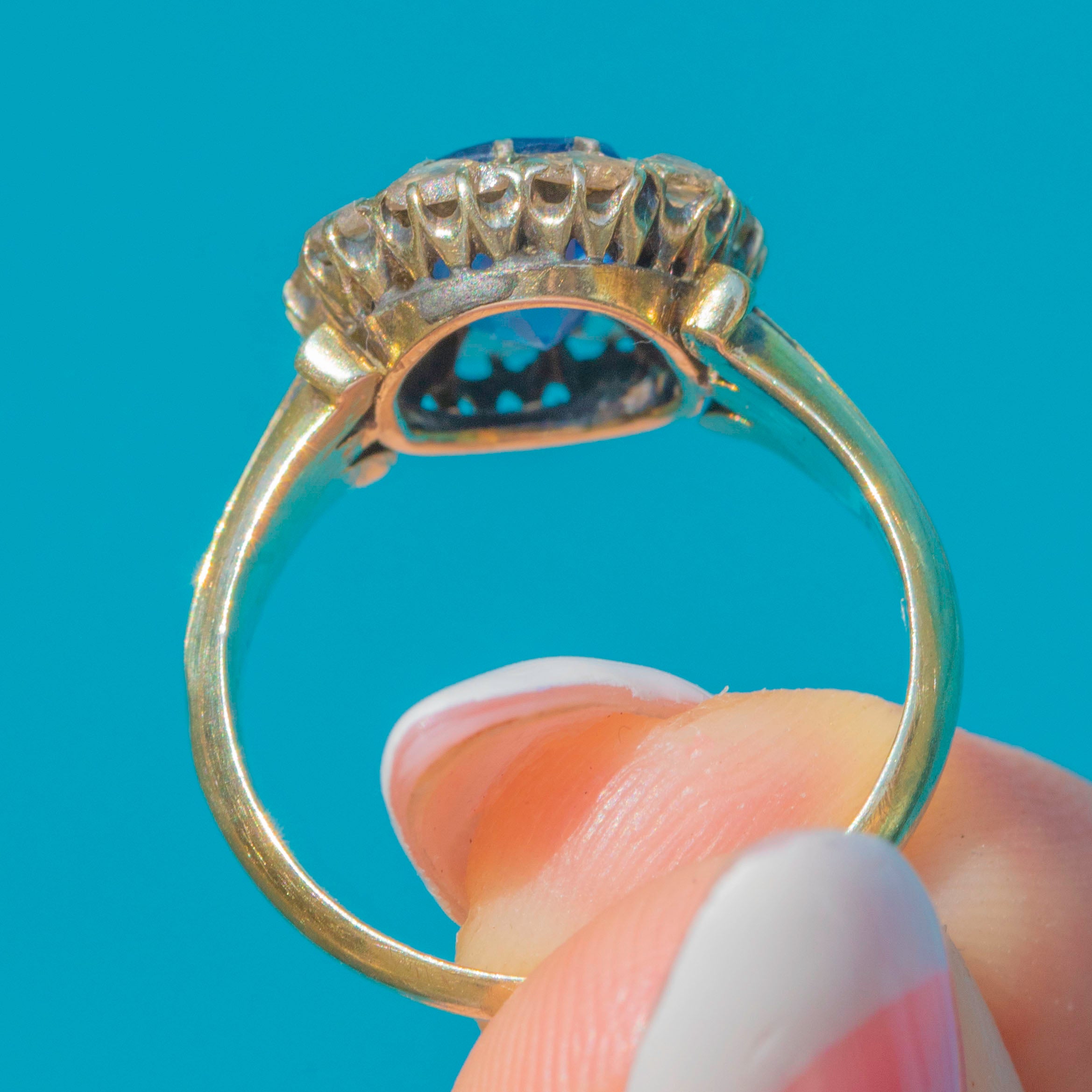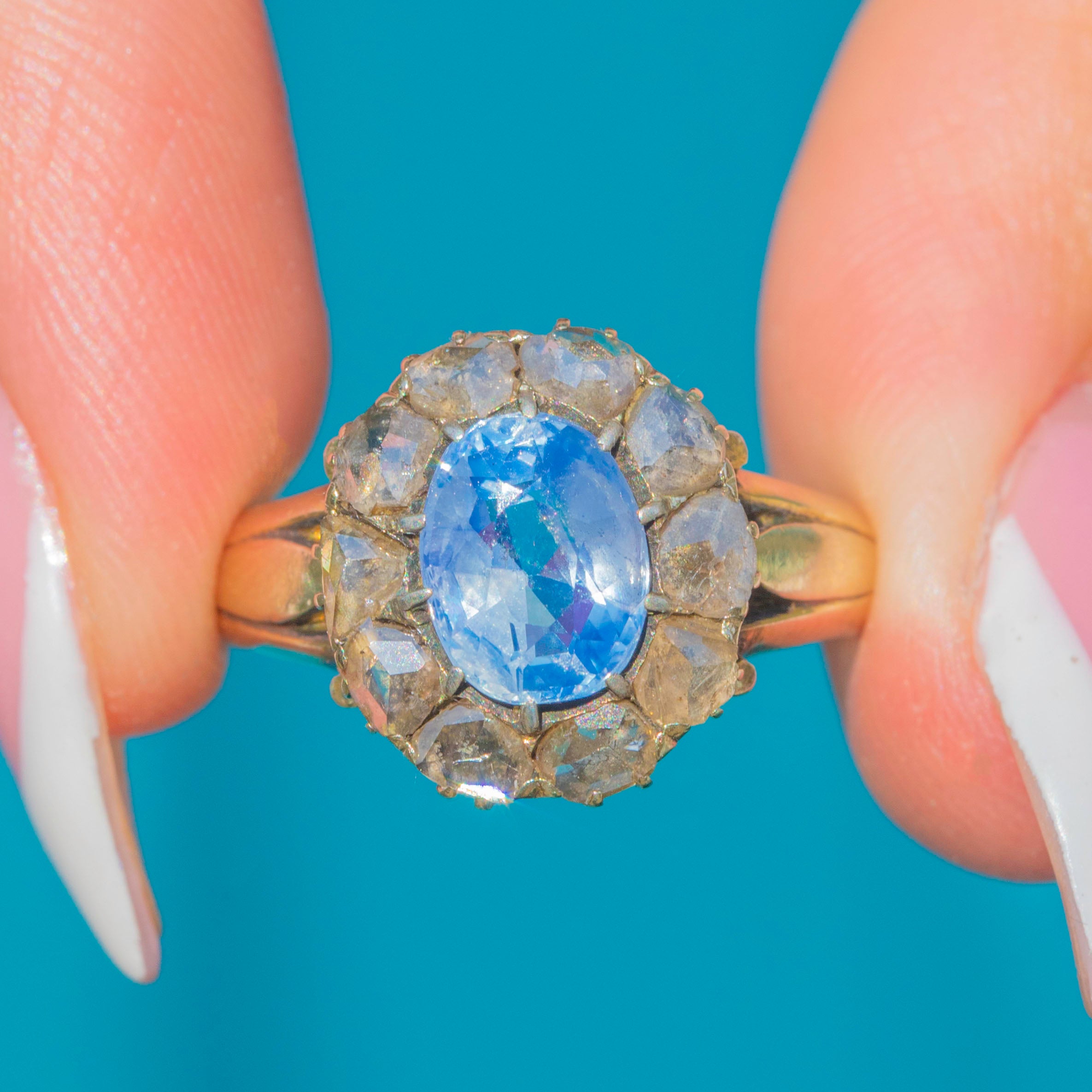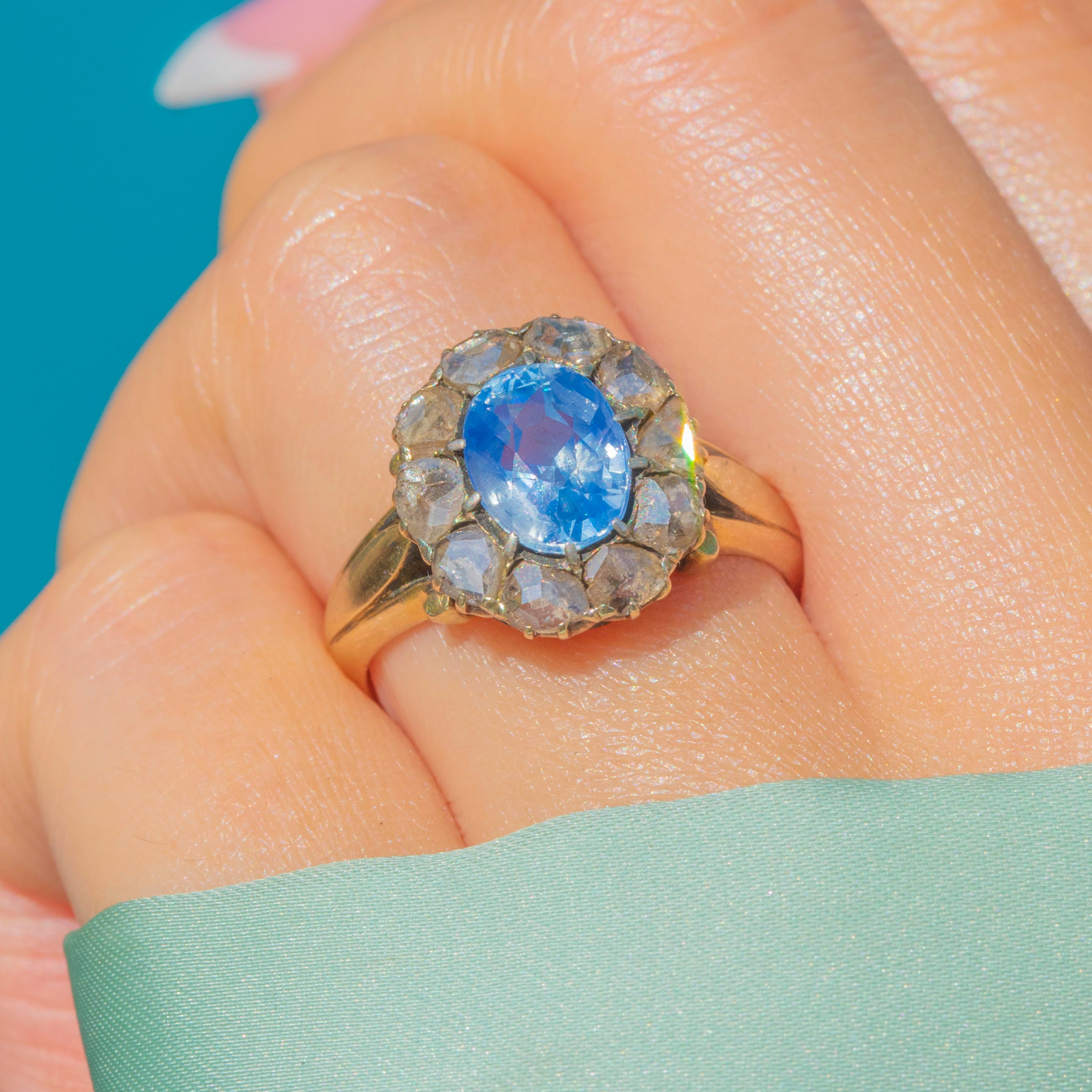 This Victorian ring features a rich Natural Sapphire at its centre, complemented by delicate Rose Cut Diamonds set in 9ct Gold.
