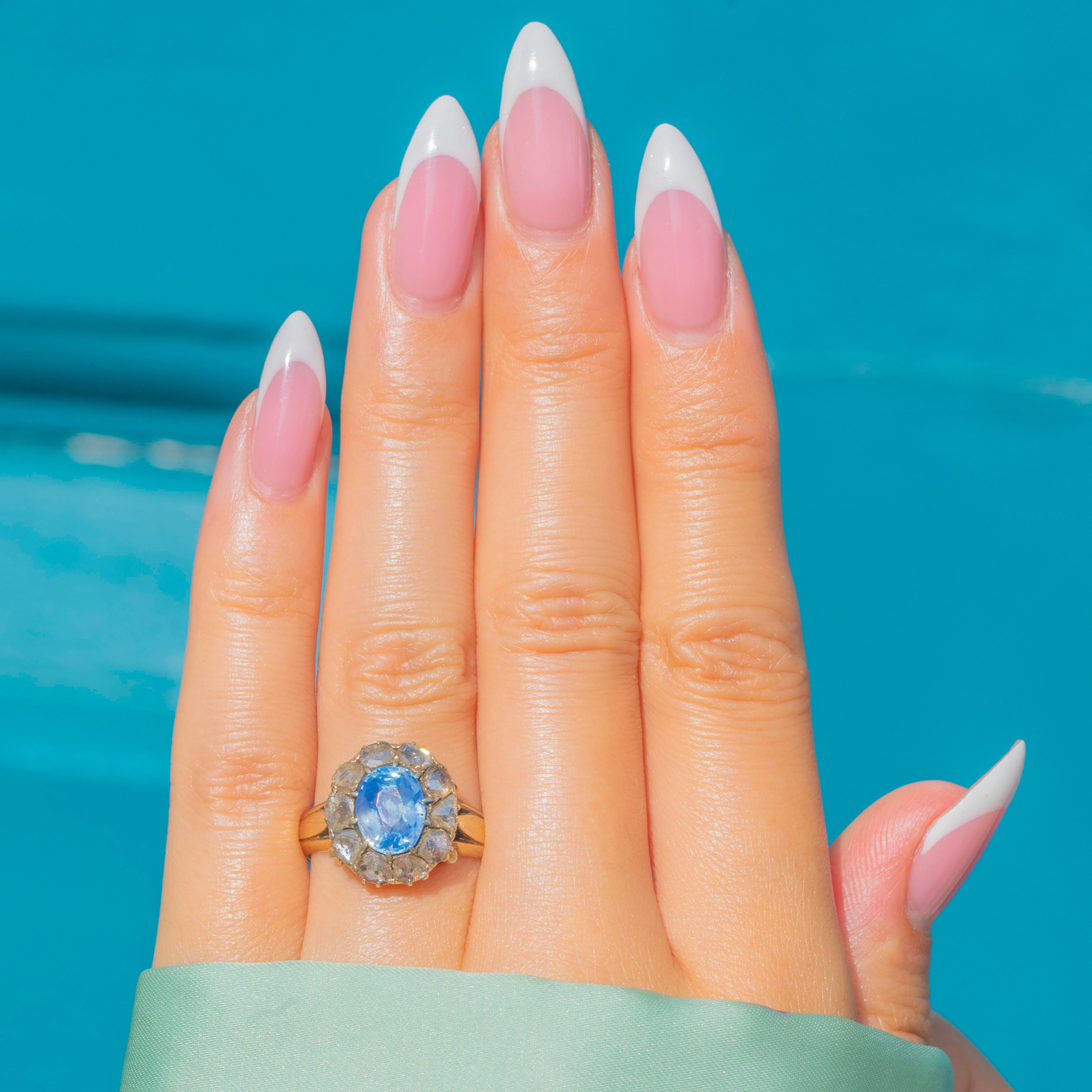 EXCELLENT: The Sapphire and Rose Cut Diamonds are free from chips or scratches, and the claws remain strong with no wear. There is visible resizing to the rear of the band, but overall the ring has been very well cared for.