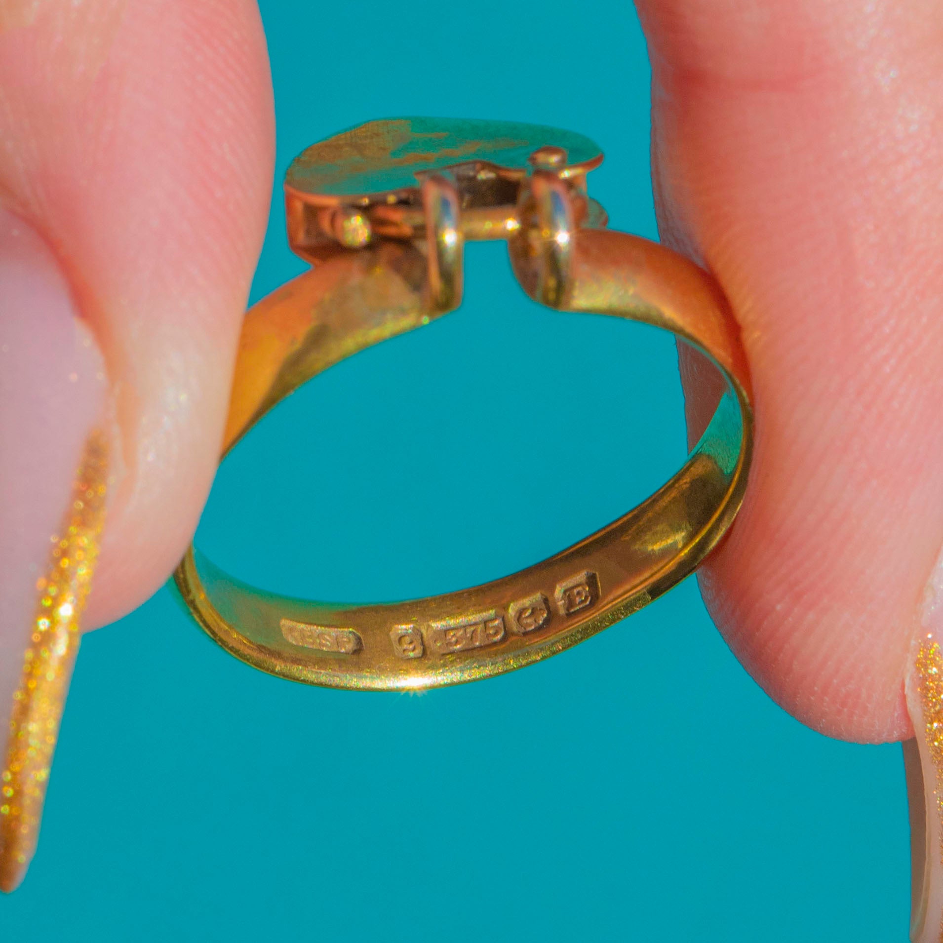 This charming Victorian 9ct Gold padlock ring is brimming with 19th-century sentiment. Fully hallmarked for Birmingham 1853, it features a solid Gold band and a sweet padlock motif at the front, evoking themes of love, loyalty and “locking in” a bond.