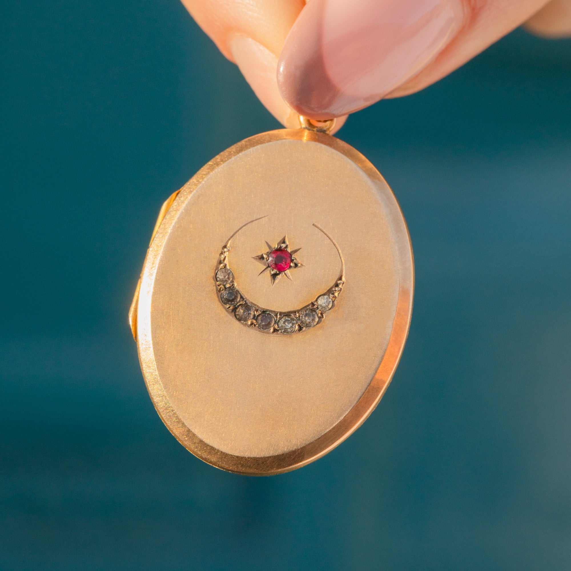 This Victorian 9ct Gold Paste crescent moon & star locket will make a striking addition to your antique jewellery collection! The front of the locket is inlaid with a Ruby Paste within a star setting, accented by a Diamond Paste encrusted crescent, each one exquisitely cut to catch the light.