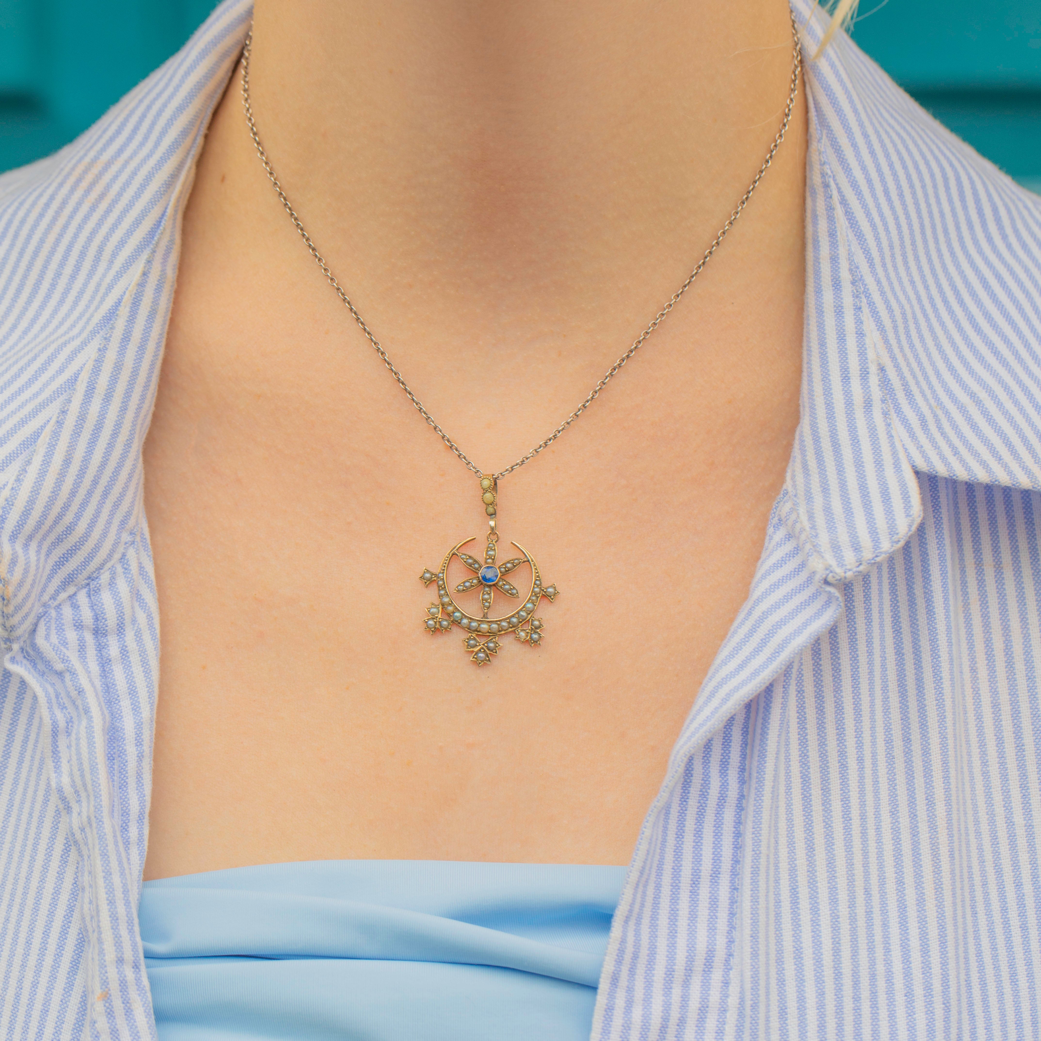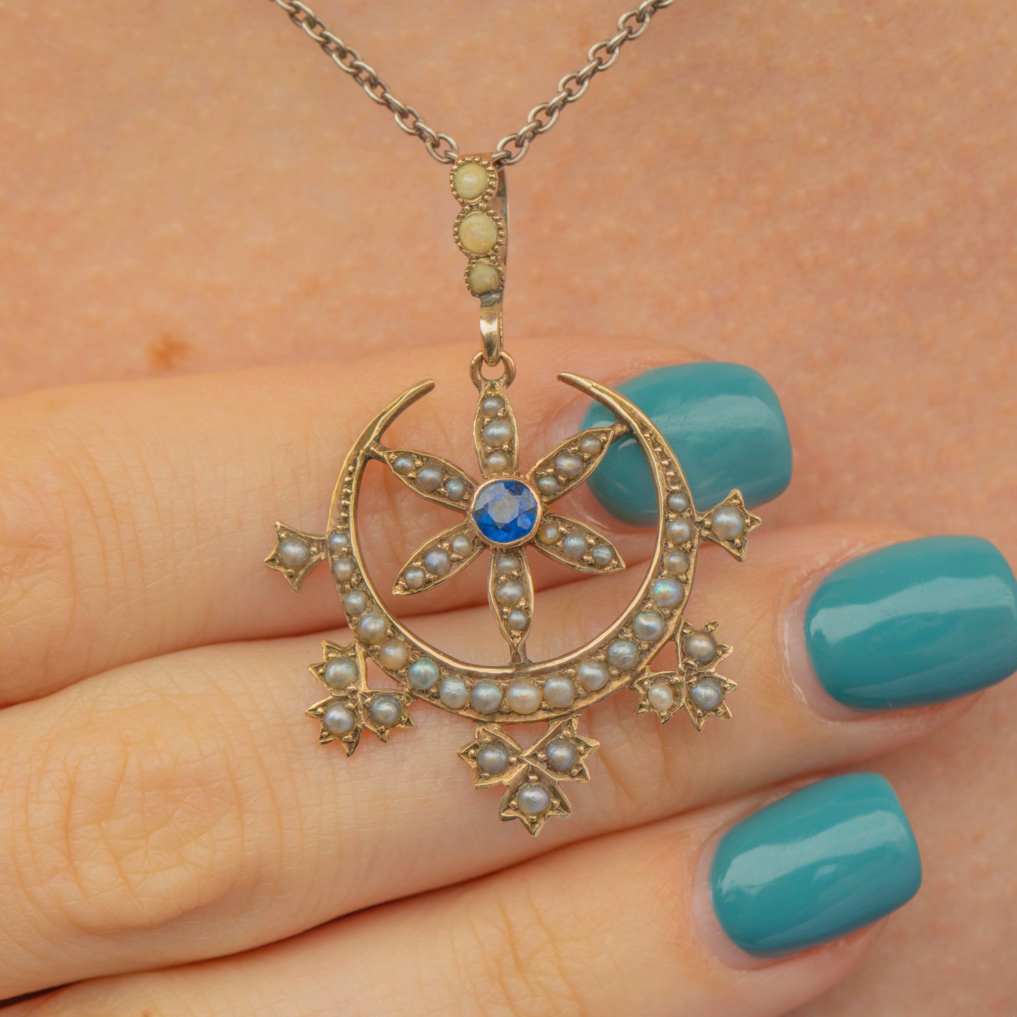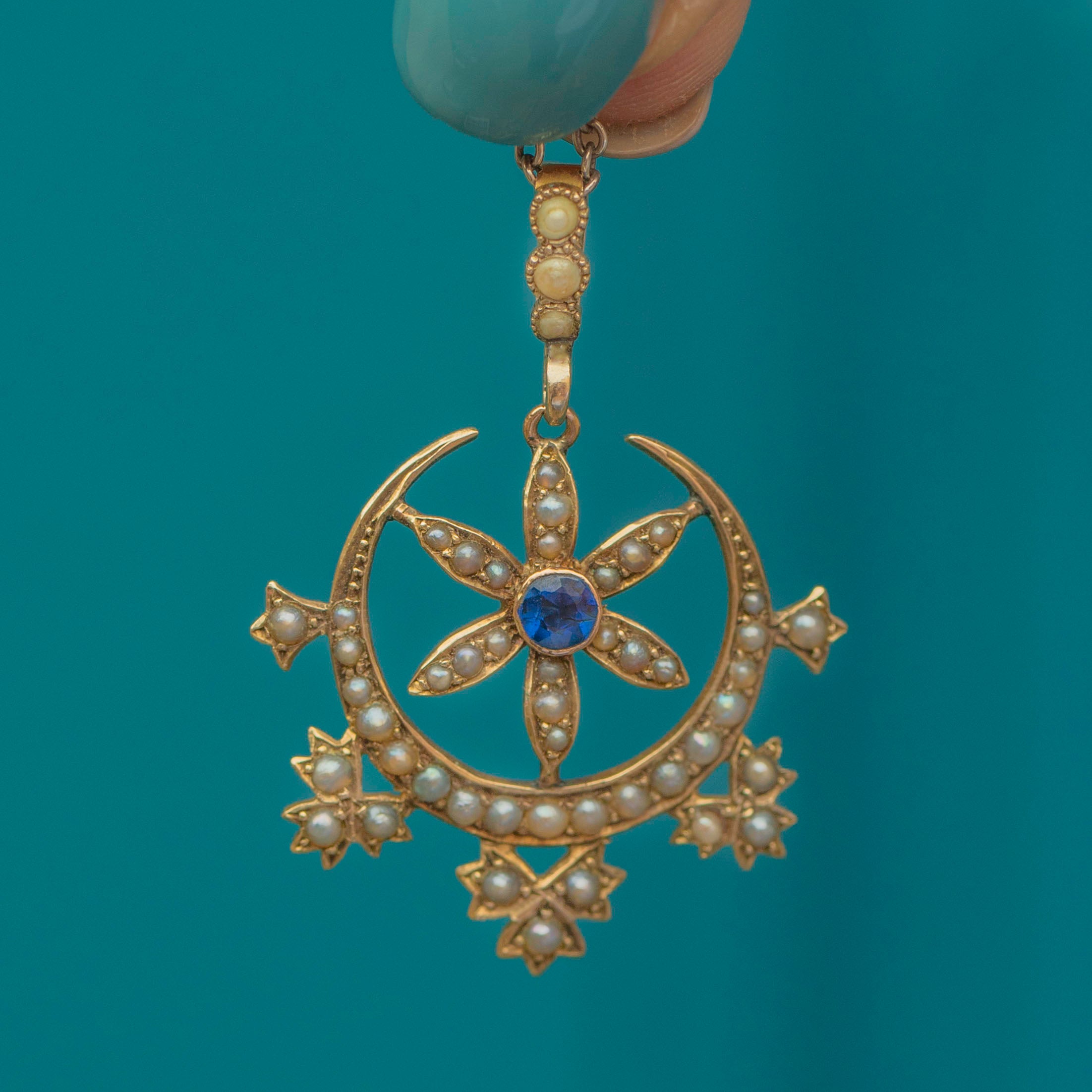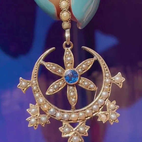 This Victorian 9ct Gold Pearl Crescent Moon & Star Pendant is simply beautiful Sprinkled with a generous helping of lustrous Pearls and a deep blue Paste gemstone centre stage, this luxurious treasure is also steeped in symbolism!