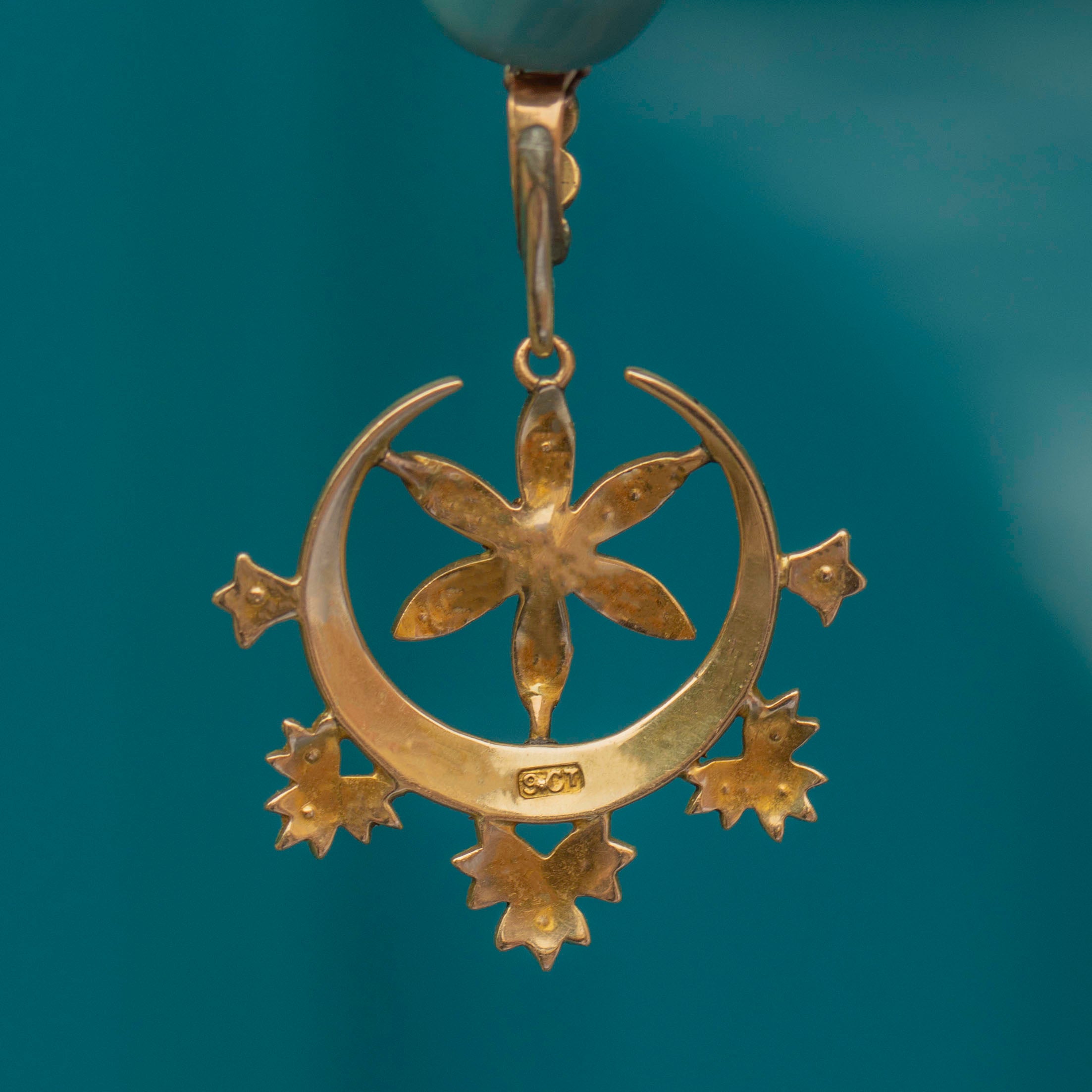 Victorian 9ct Gold Pearl Crescent Moon & Star Pendant