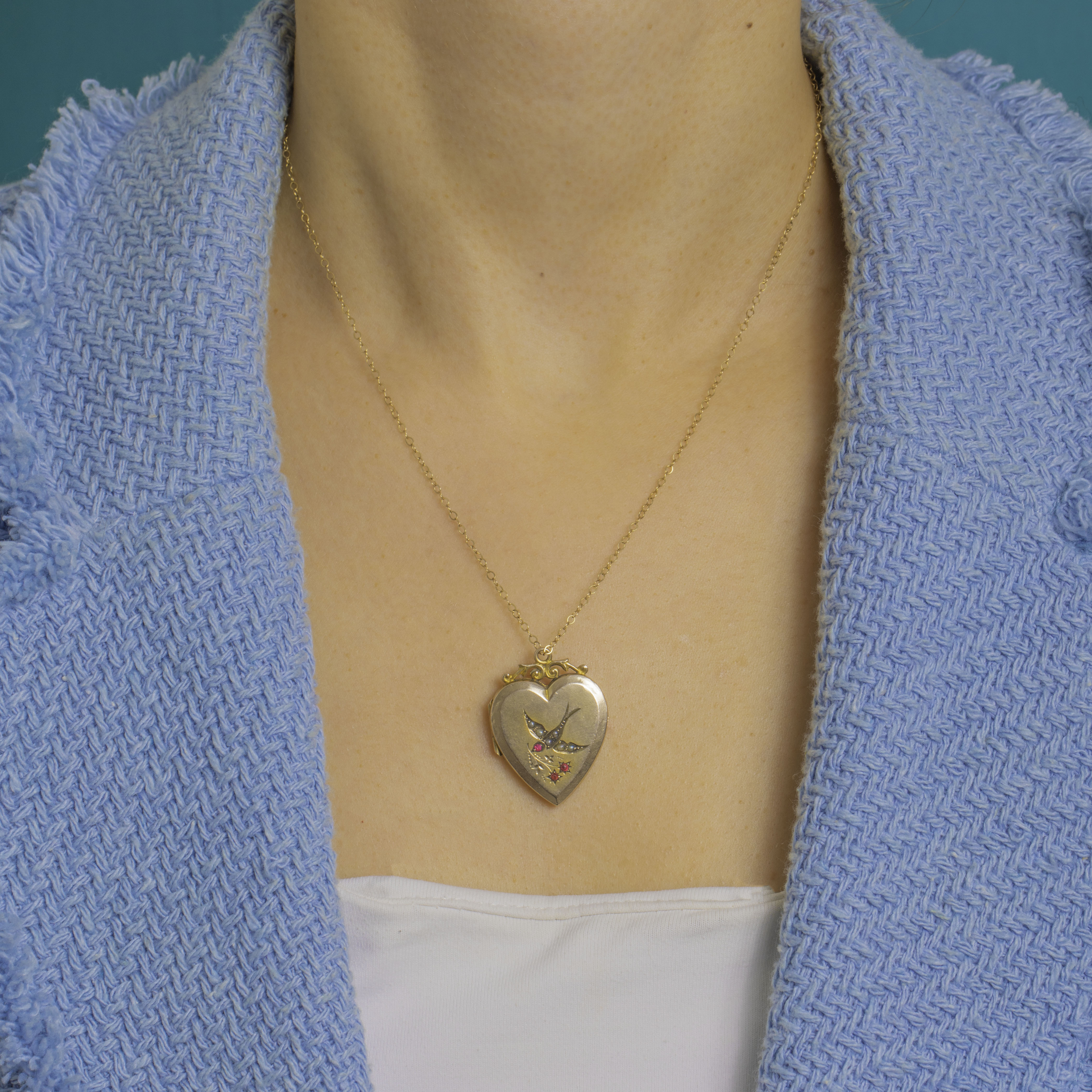 Victorian 9ct Gold Pearl Paste Swallow Heart Locket with 20" Gold Chain