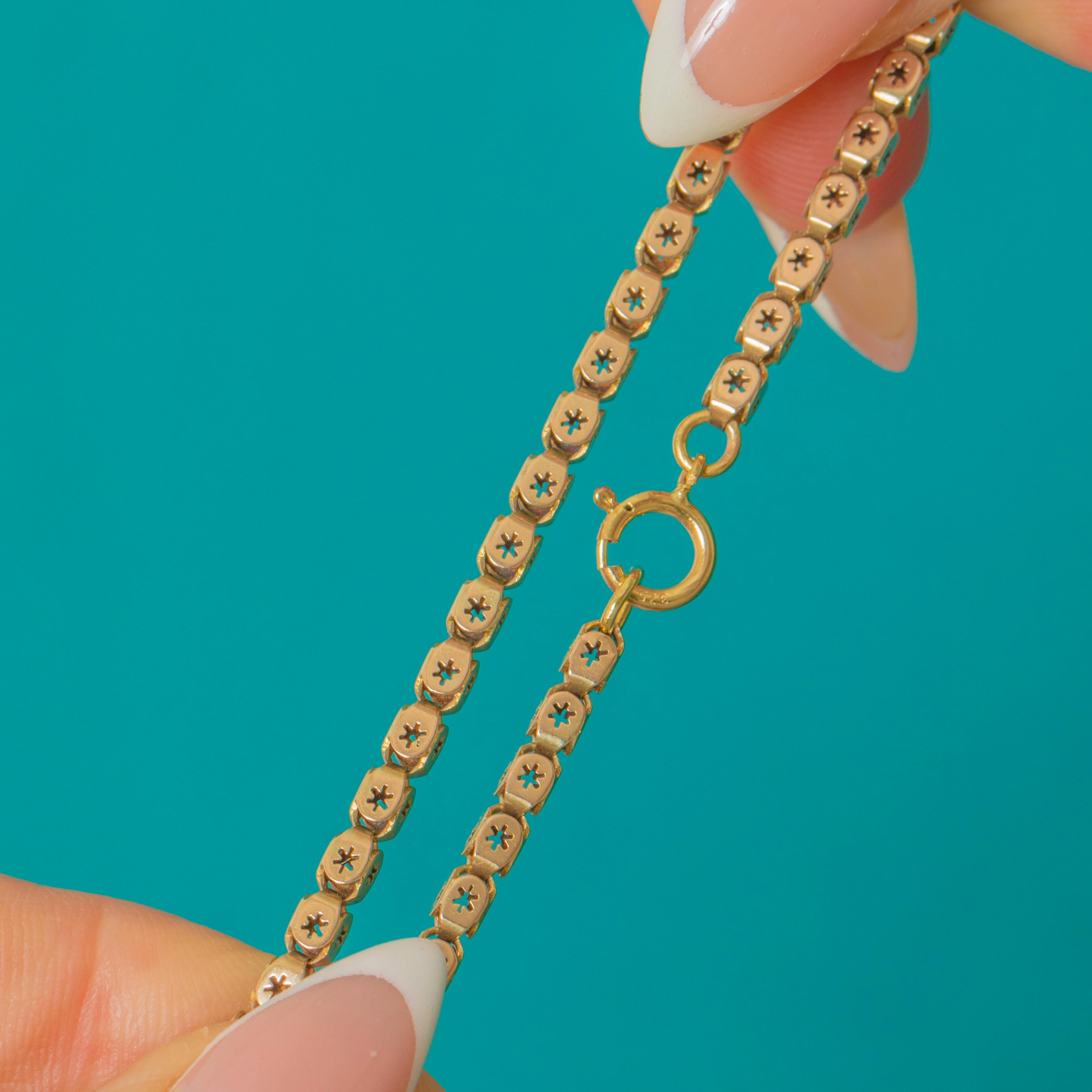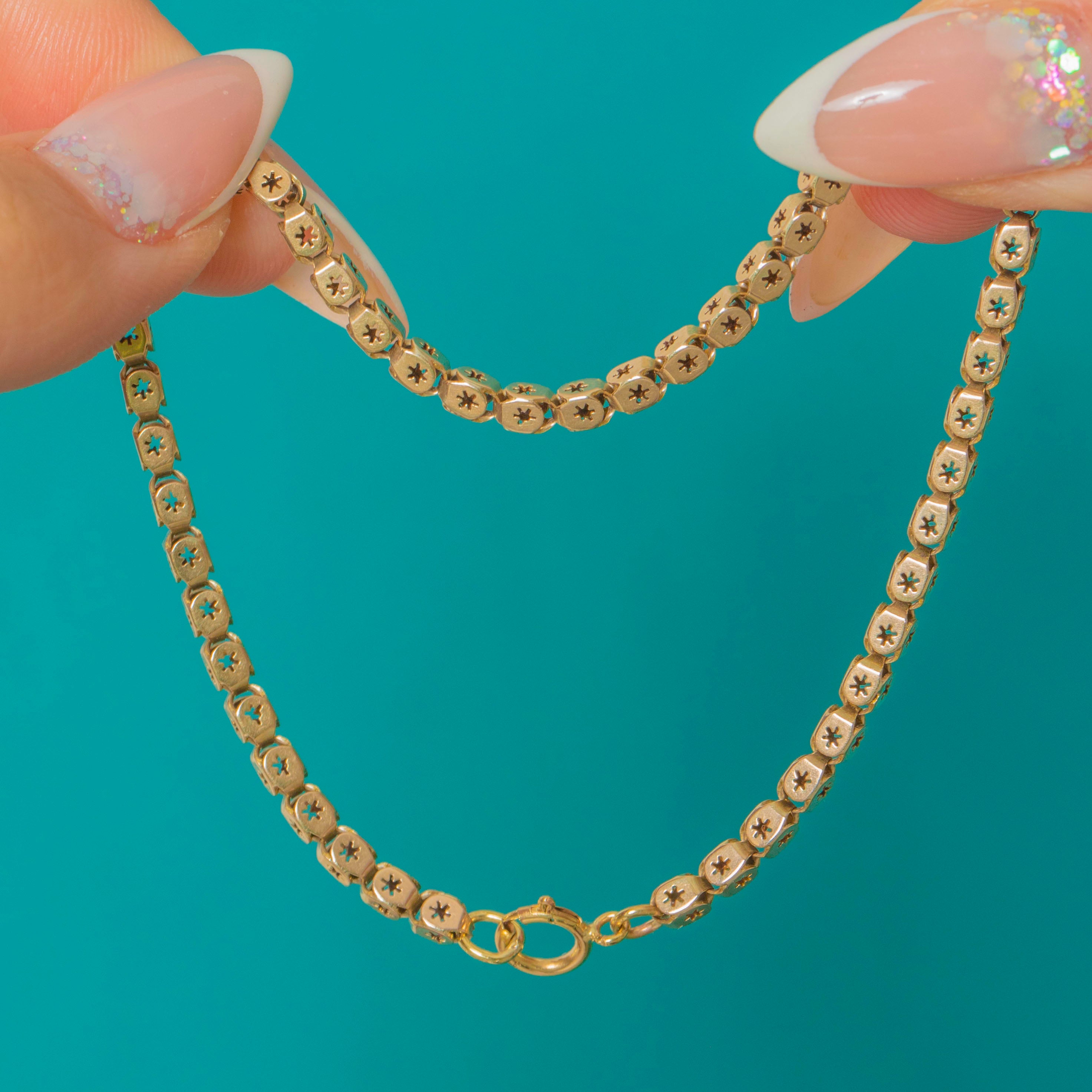 Delicate and deliciously detailed, this Victorian 9ct Gold bracelet is fashioned from a fine run of articulated plaques, each crisply pierced with an eight-point star. Together they create a slender, shimmering ribbon that sits low and sleek against the wrist.