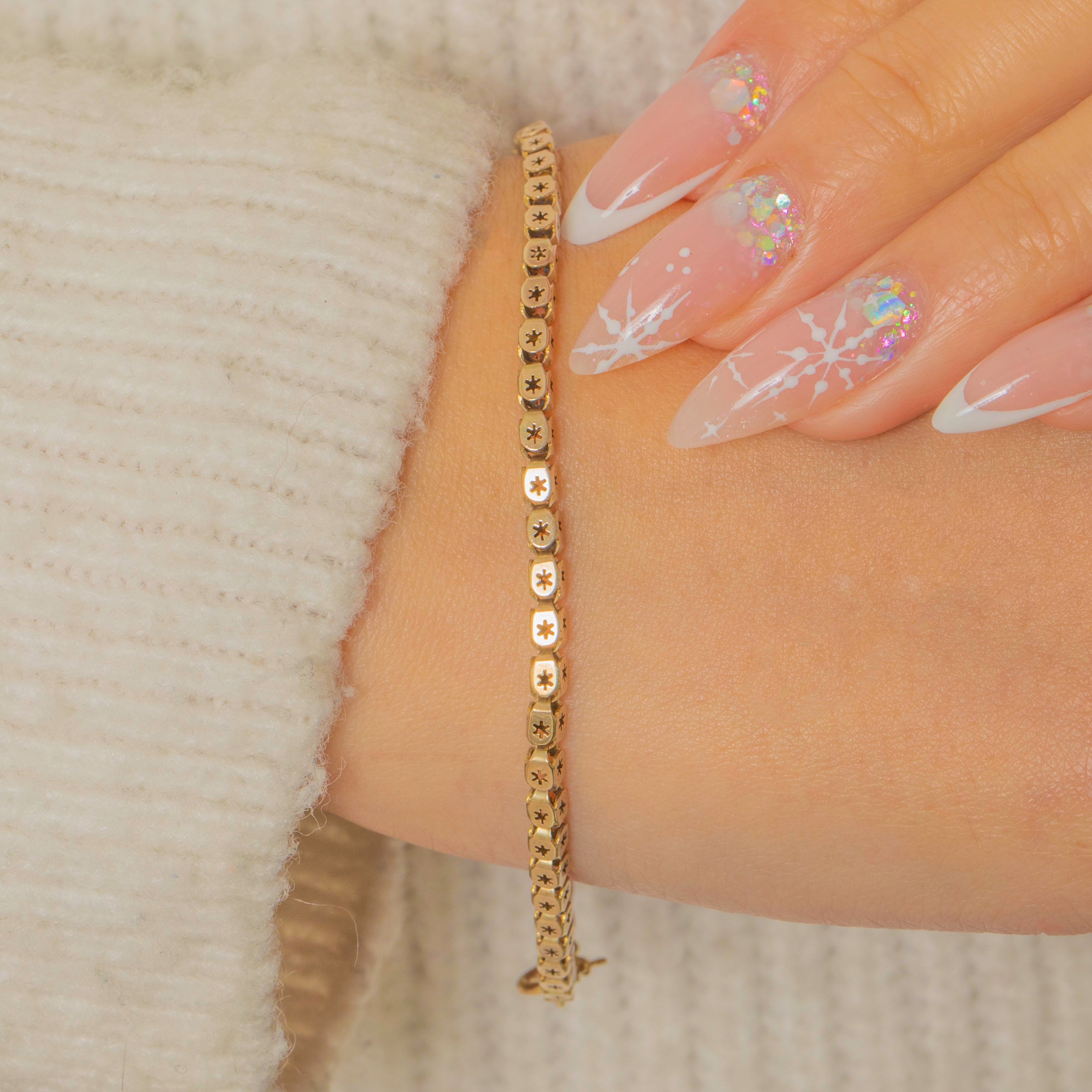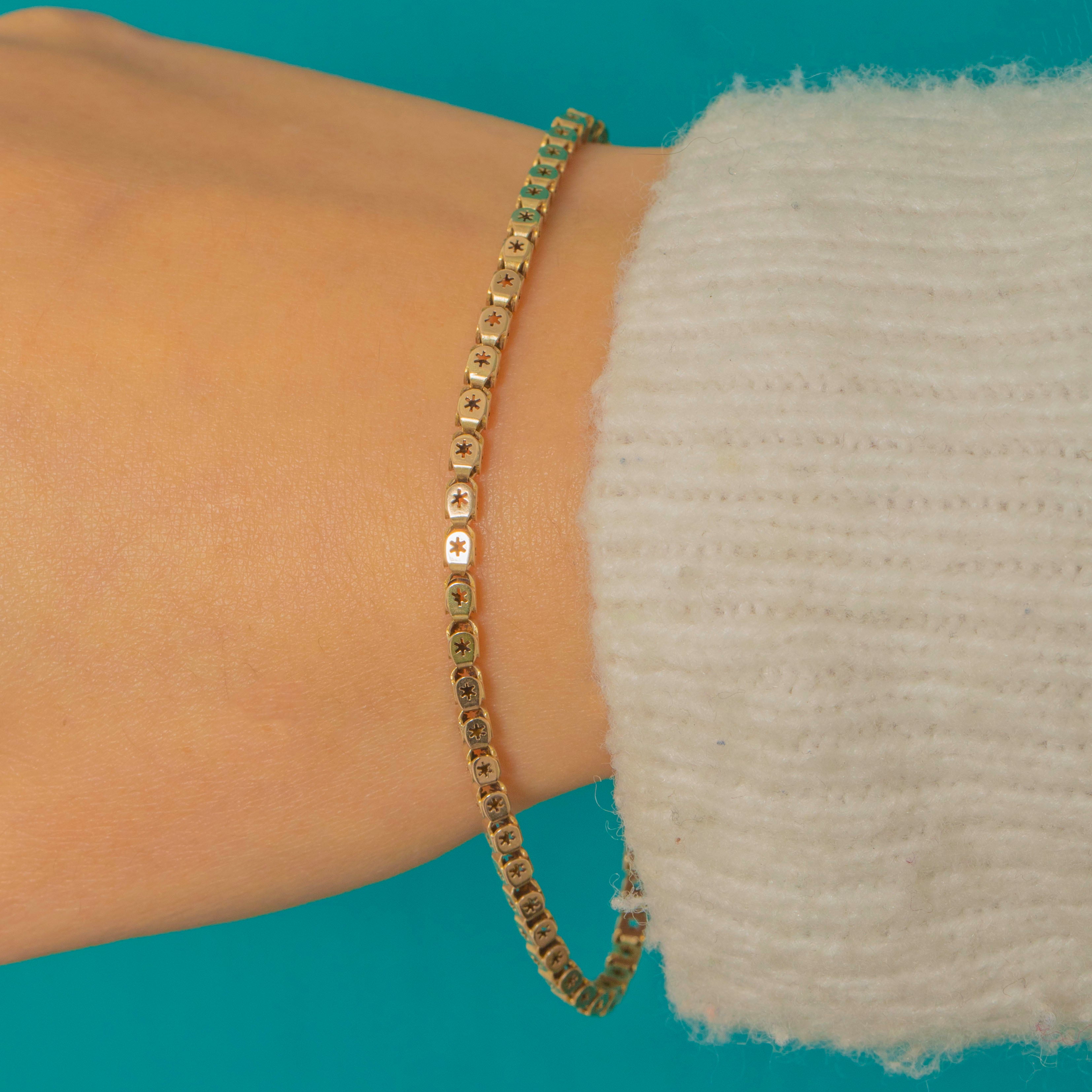 The classic book-link style gives beautiful fluidity and a refined, geometric rhythm, while the soft patina and bright surfaces highlight the craftsmanship of the starburst motif. A timeless layer with antique poise, effortless alone or stacked.