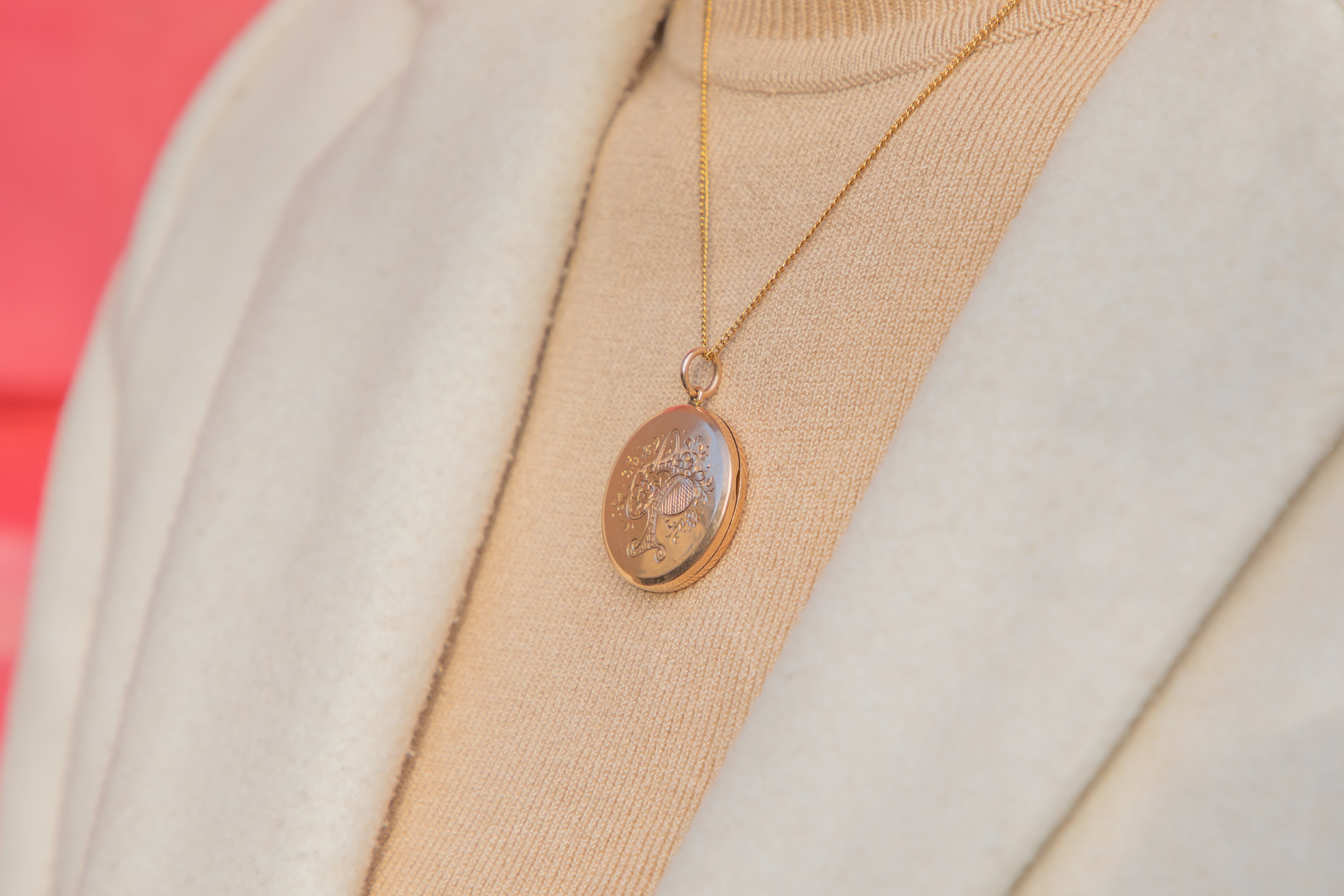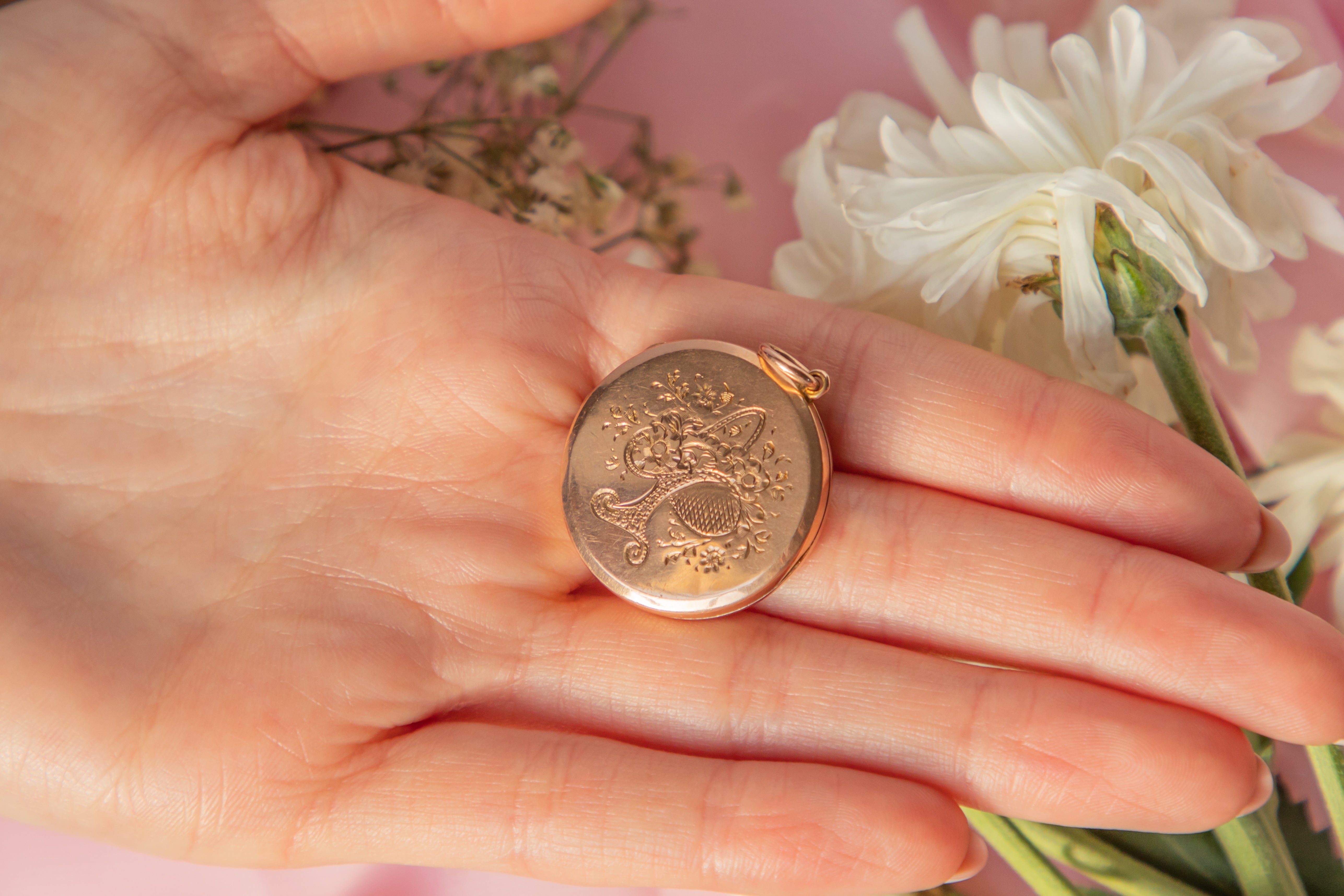 The most charming Victorian 9ct Gold round 'bouquet of flowers' locket. Beautifully engraved with sweet florals and swooping swallows, this perfectly round locket will instantly put a spring in your step.