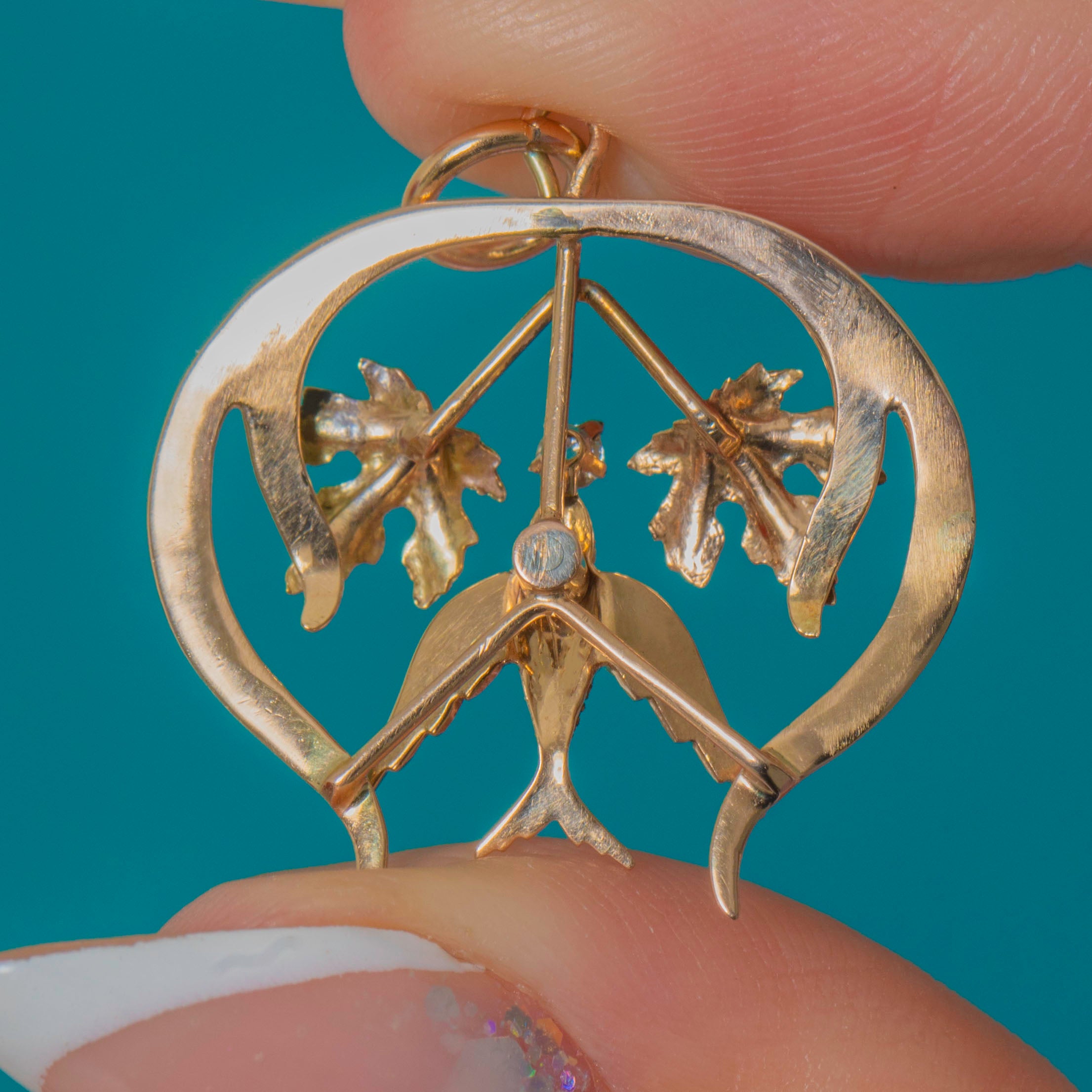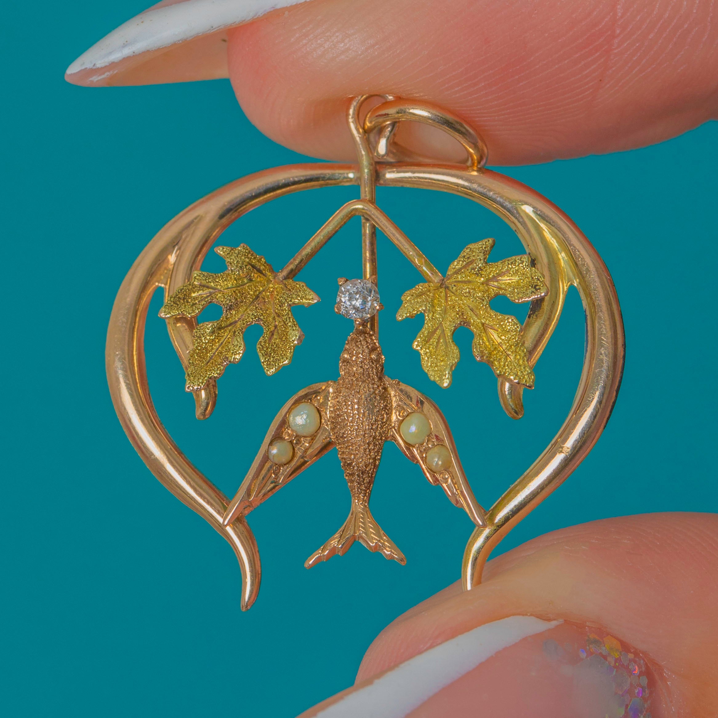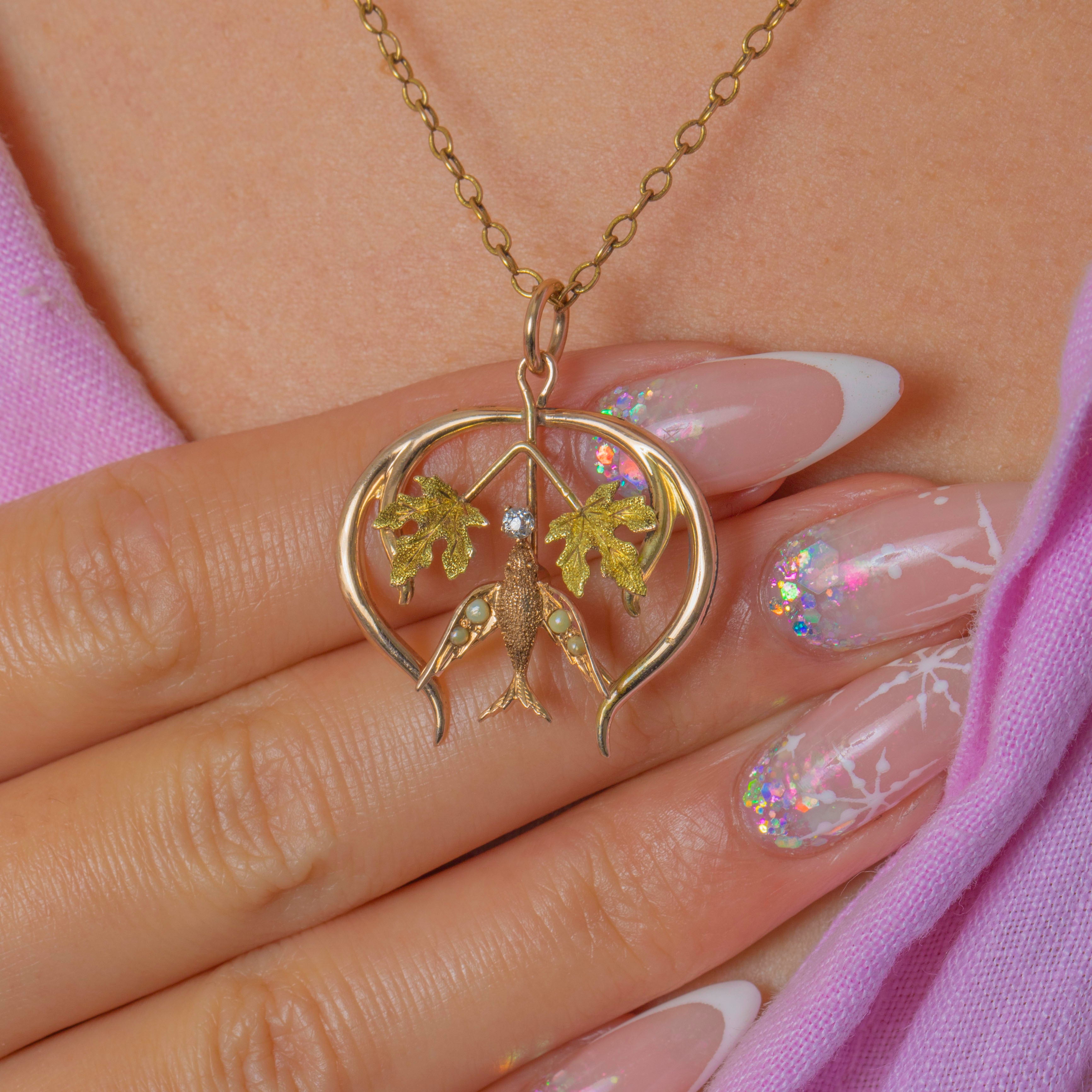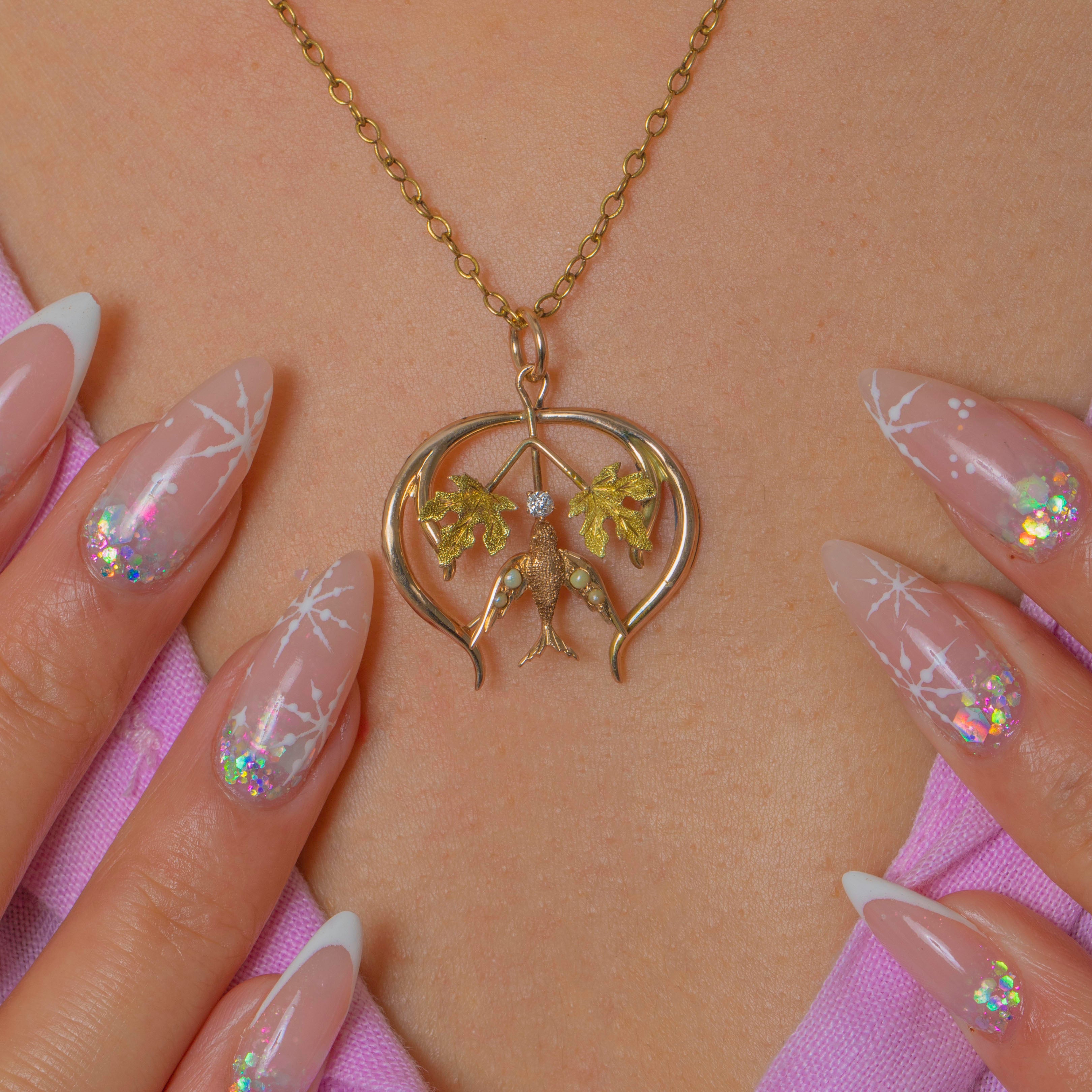 The pendant features a sparkling Diamond at the centre, and a graceful Swallow embellished with graduating seed Pearls. Light, expressive and beautifully made, it captures the romantic artistry of the era.