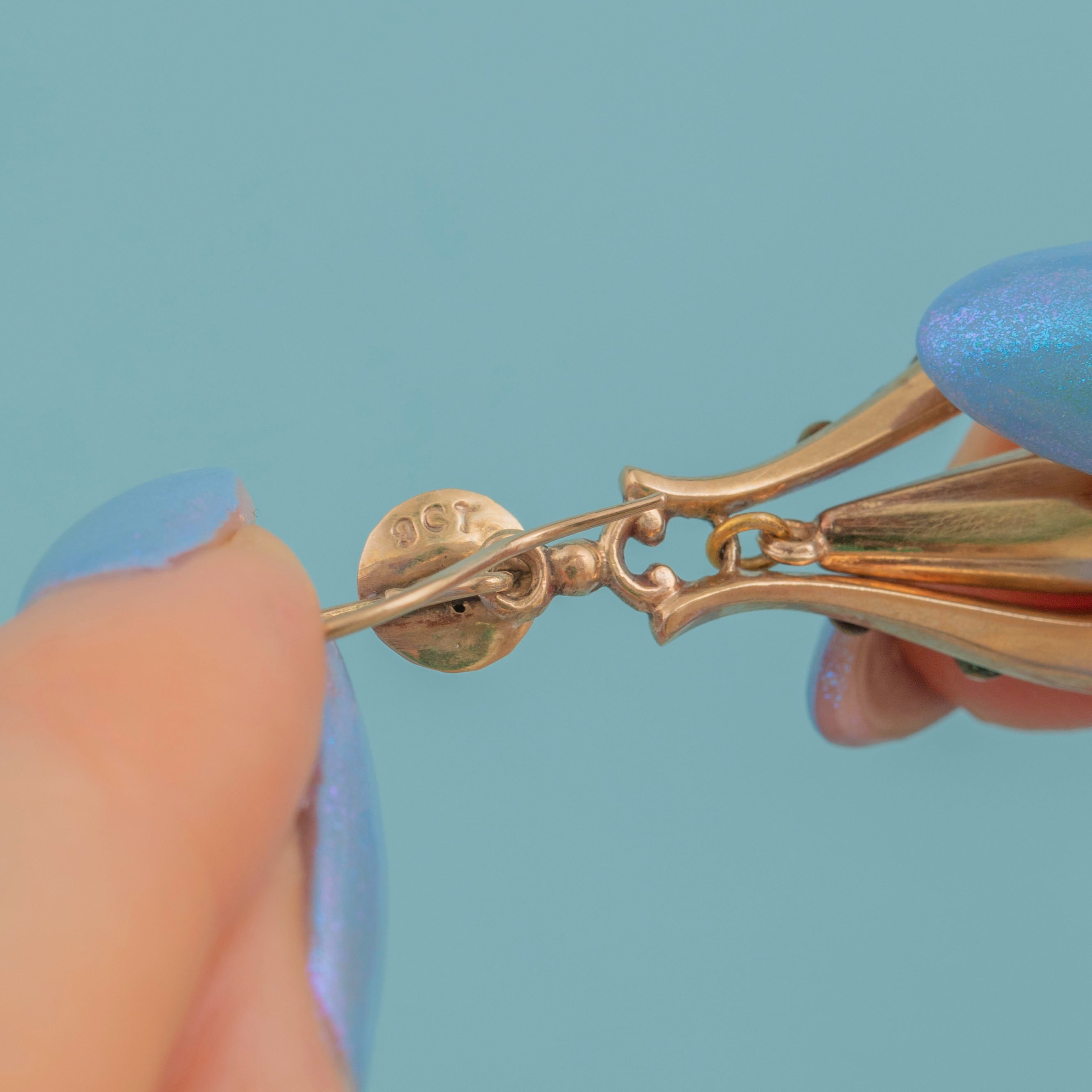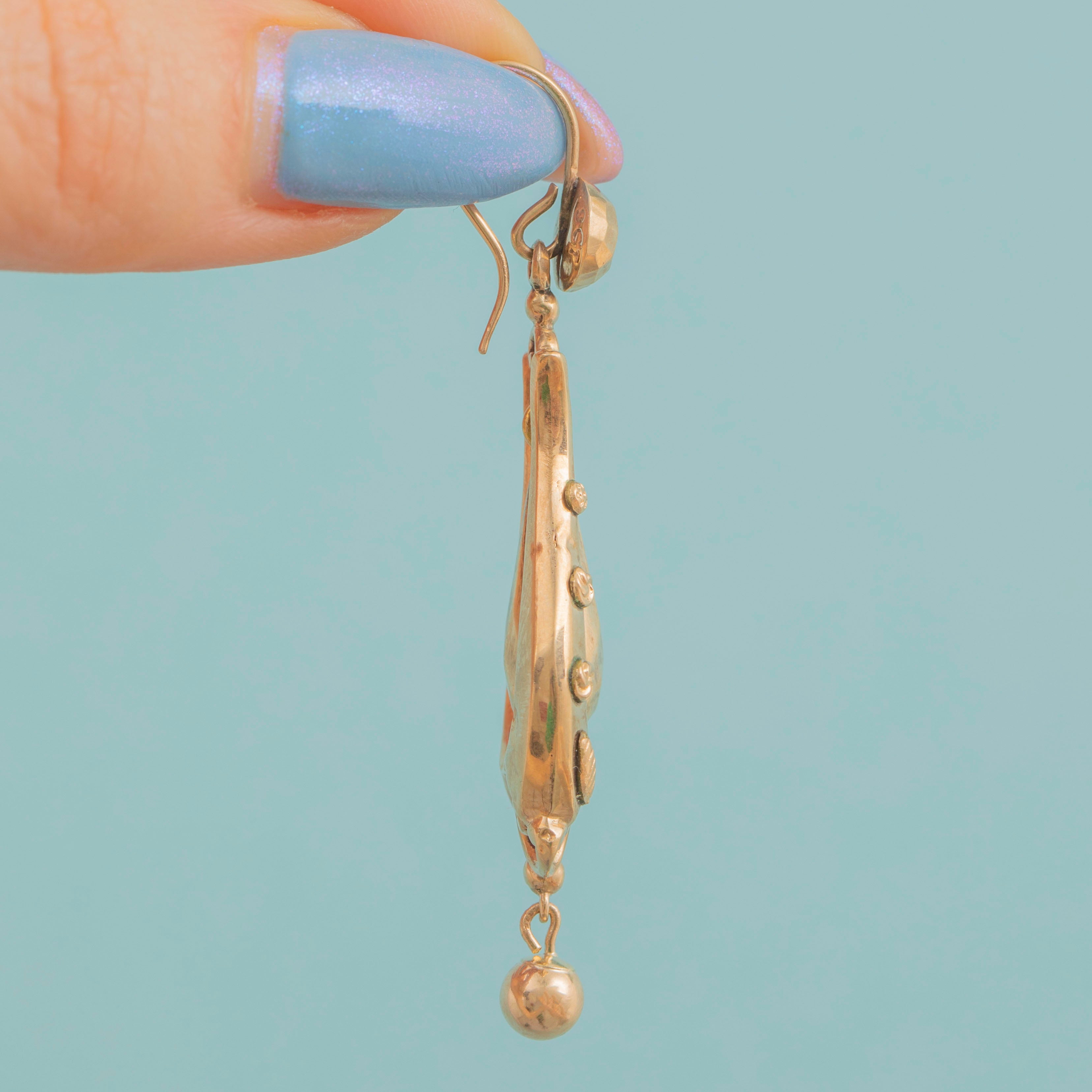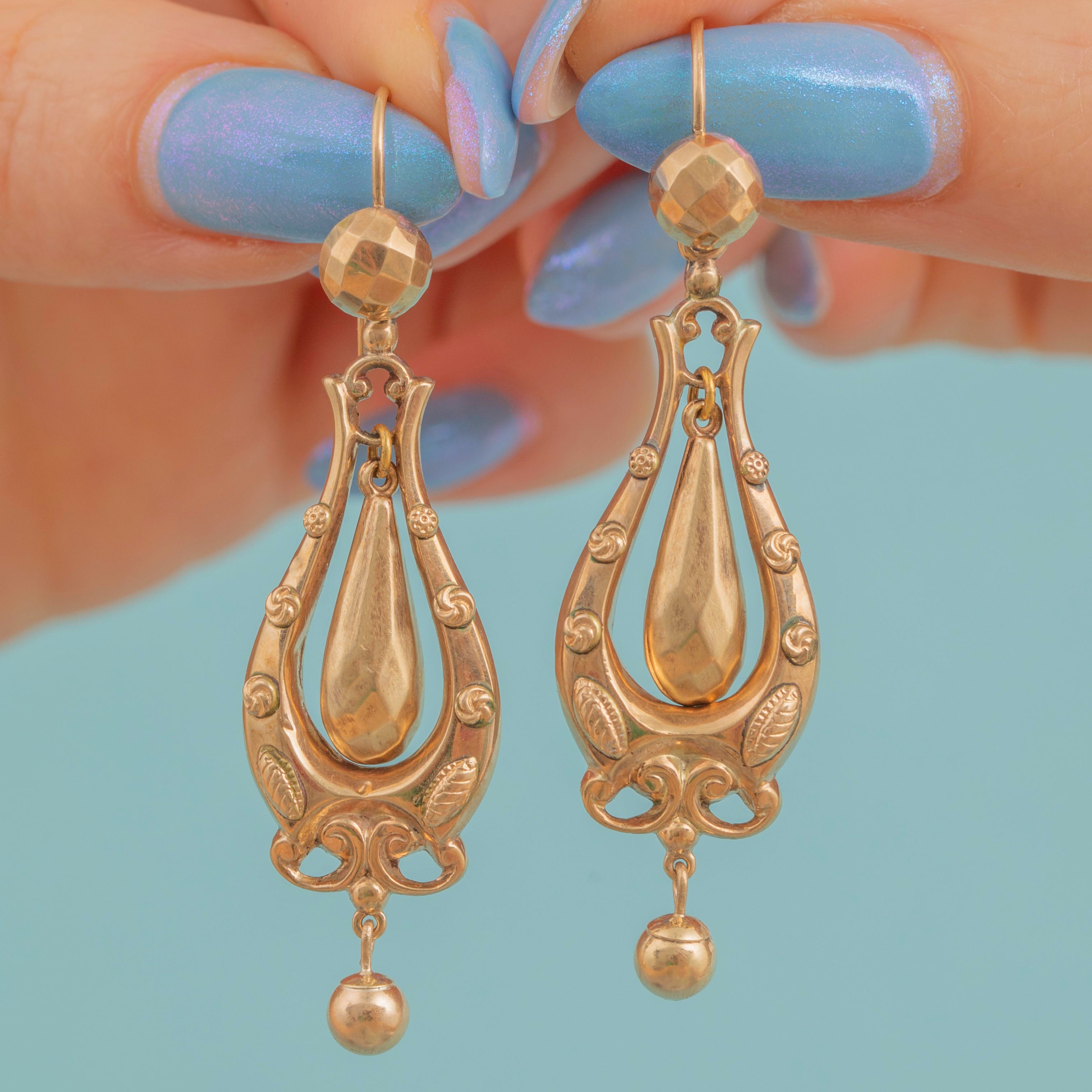 GOOD TO VERY GOOD. These Victorian 9ct Gold Textured drop earrings are in great condition. These earrings have lasted very well overall, with only some dings on the back of the earrings - this won't be visible when worn. The Gold is buttery and the slender hooks provide secure and comfortable wear.