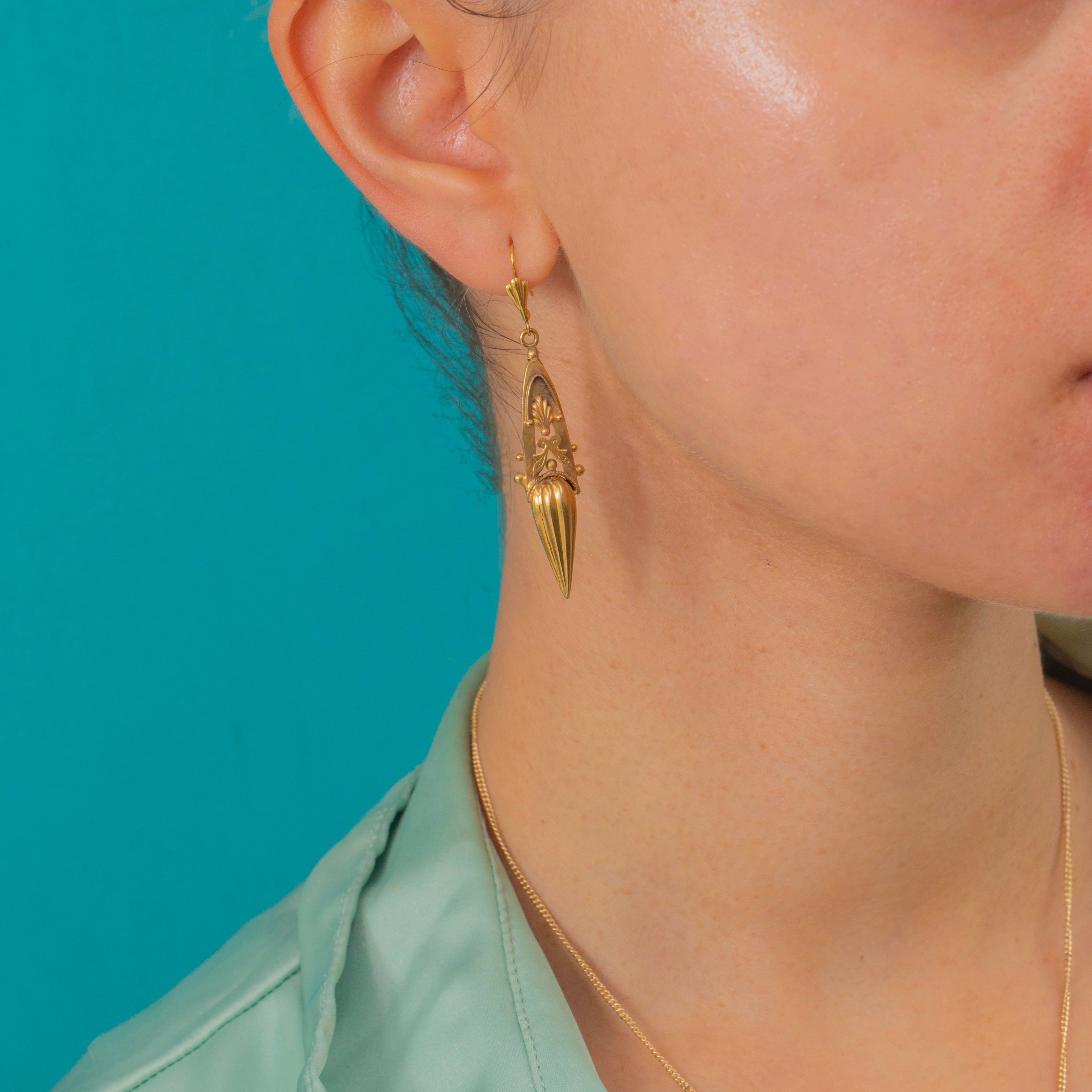 These striking Victorian torpedo earrings are a perfect example of the bold and sculptural style of the 19th century. Crafted entirely in rich 9ct Gold, their elongated drops feature classical motifs including shells, scrolls, and applied bead detailing, a true celebration of Victorian design.