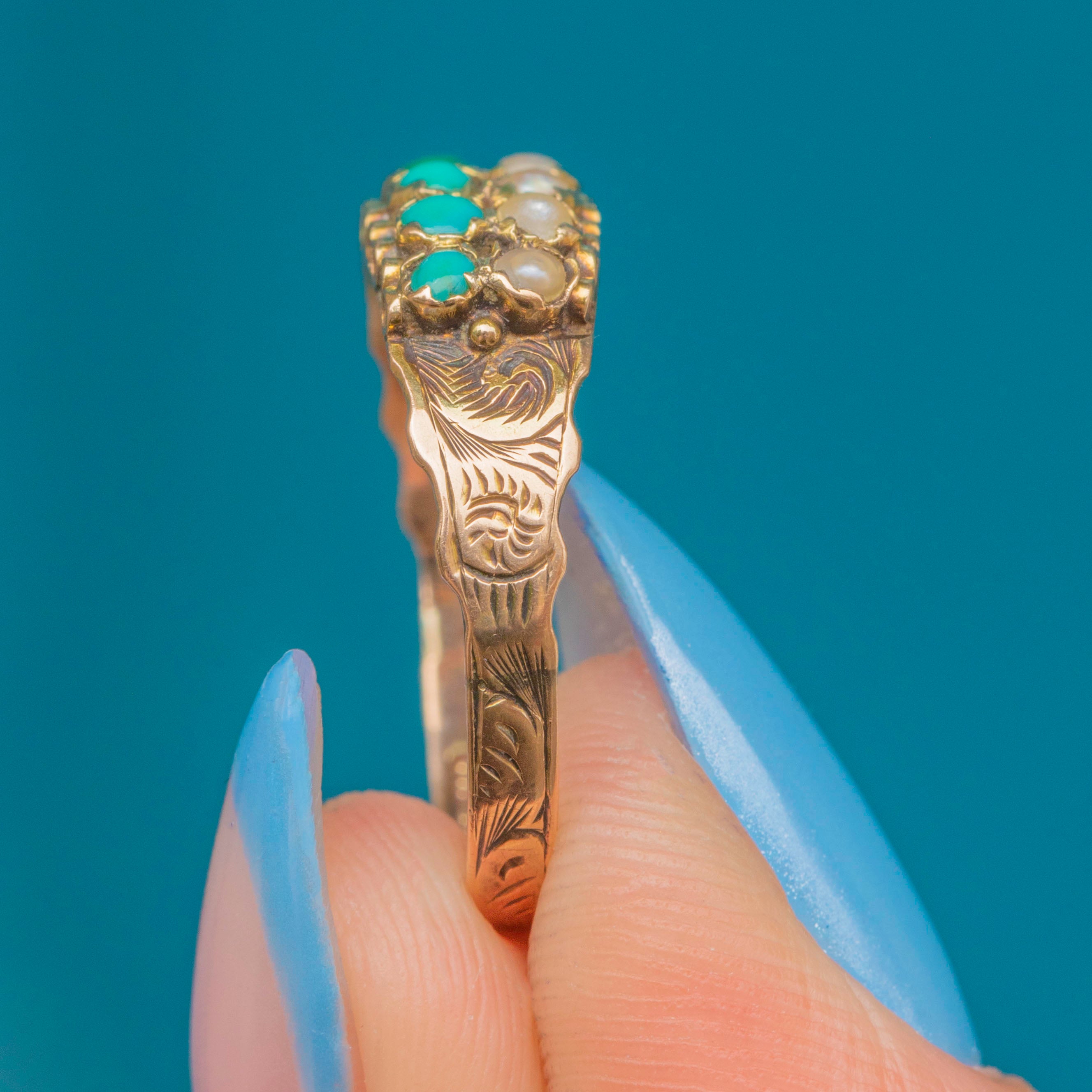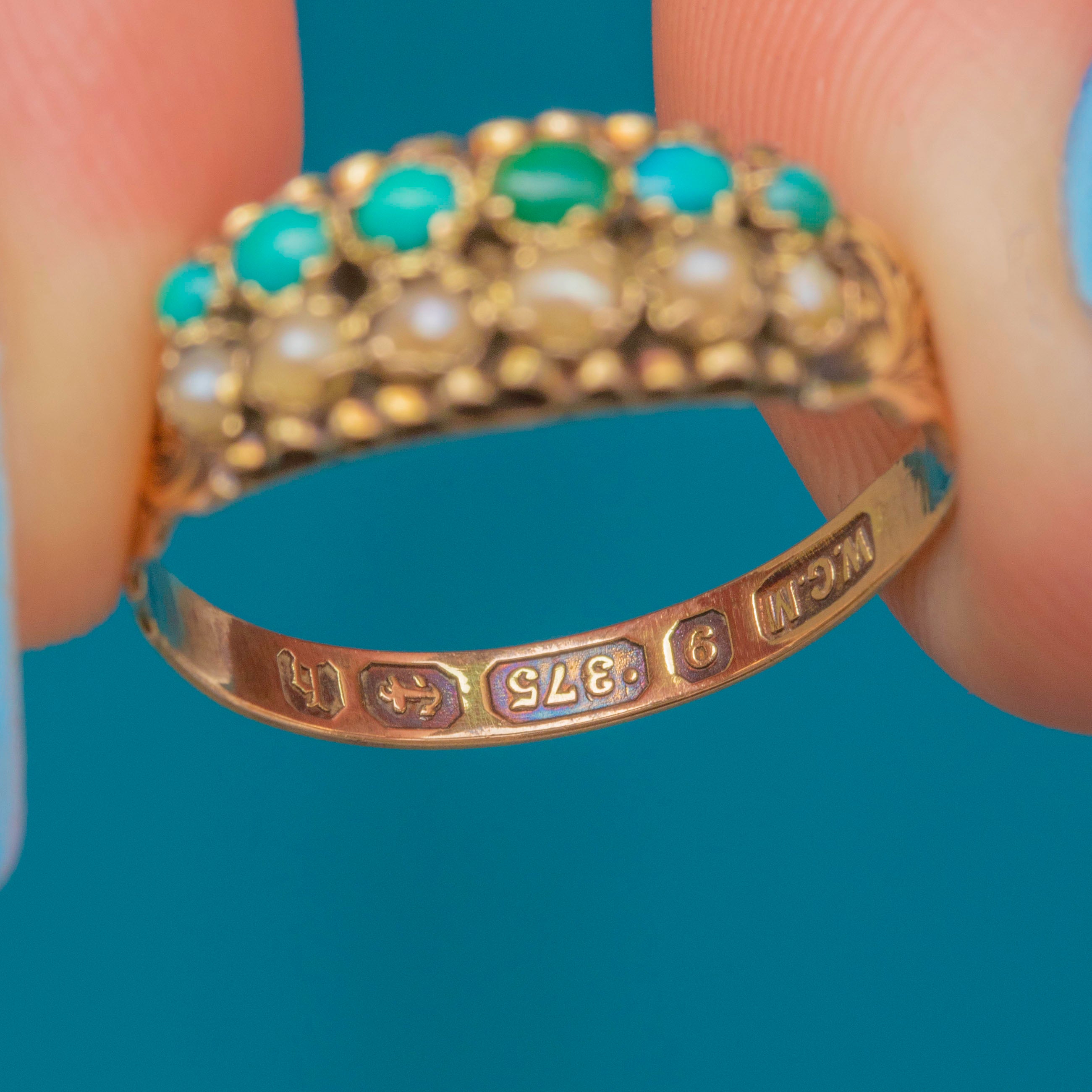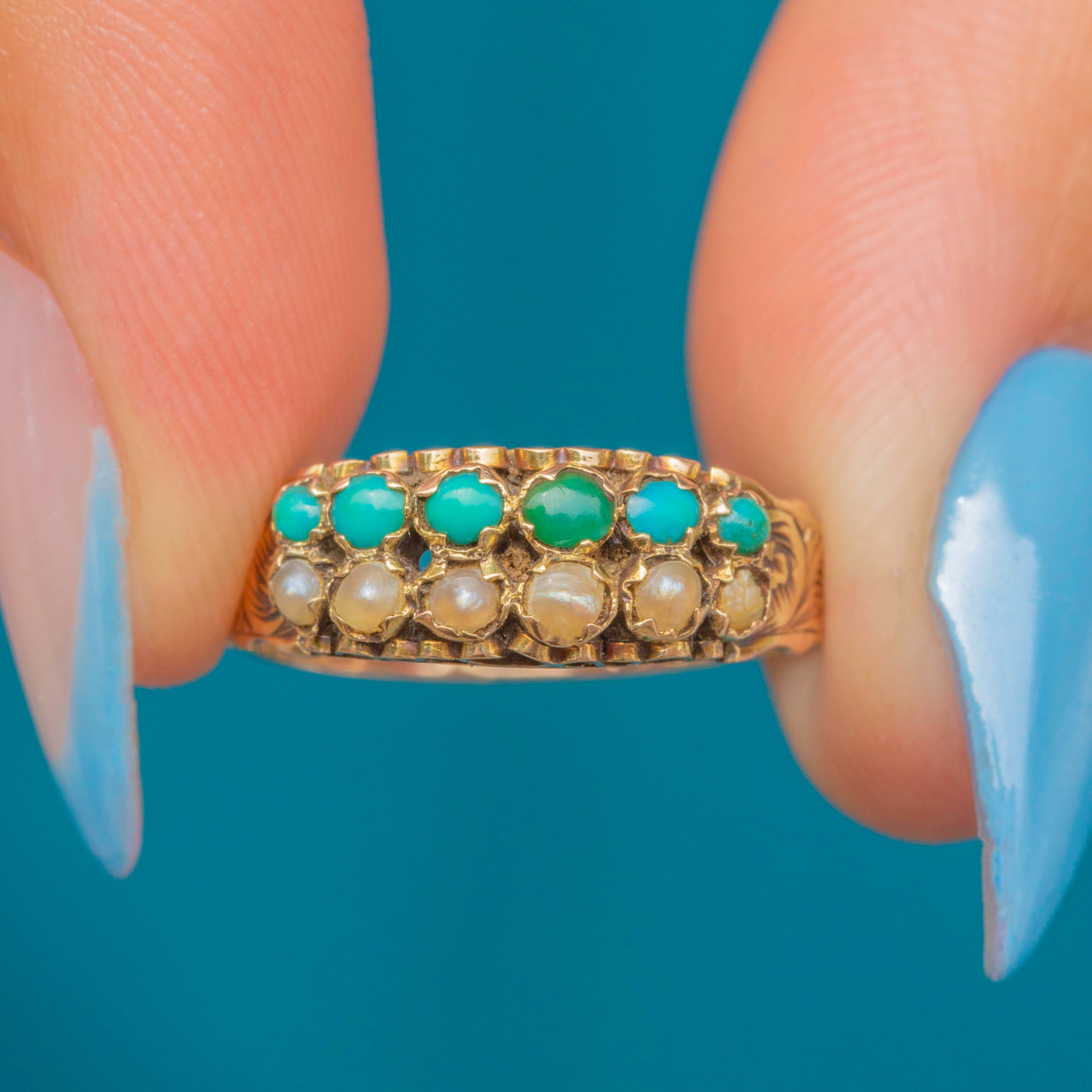VERY GOOD. This Victorian ring has lovely natural stones in it. The natural Turquoise stones vary ever so slightly in colour, which we love, and the Pearls have retained a lovely nacre. The engraved band is sublime, and the inside of the ring has a full set of hallmarks.