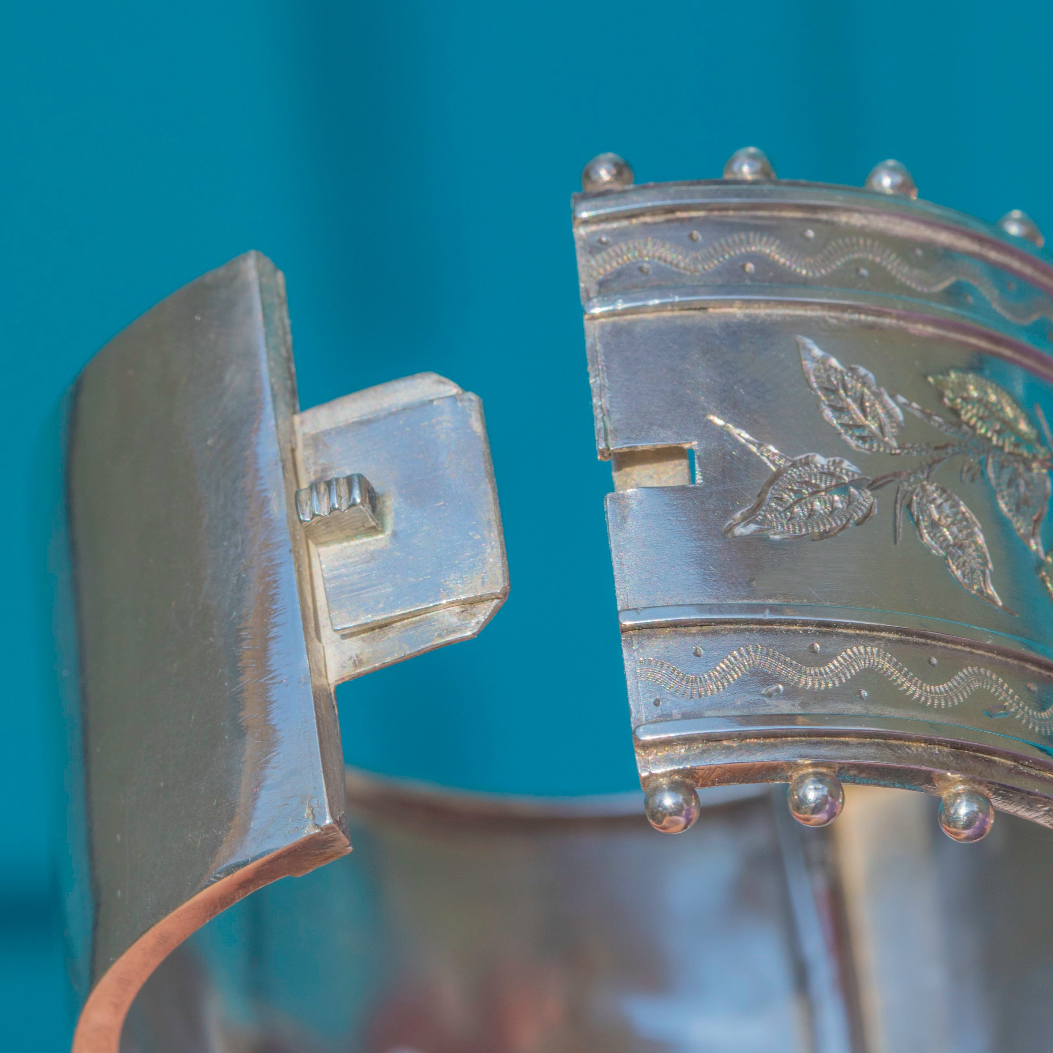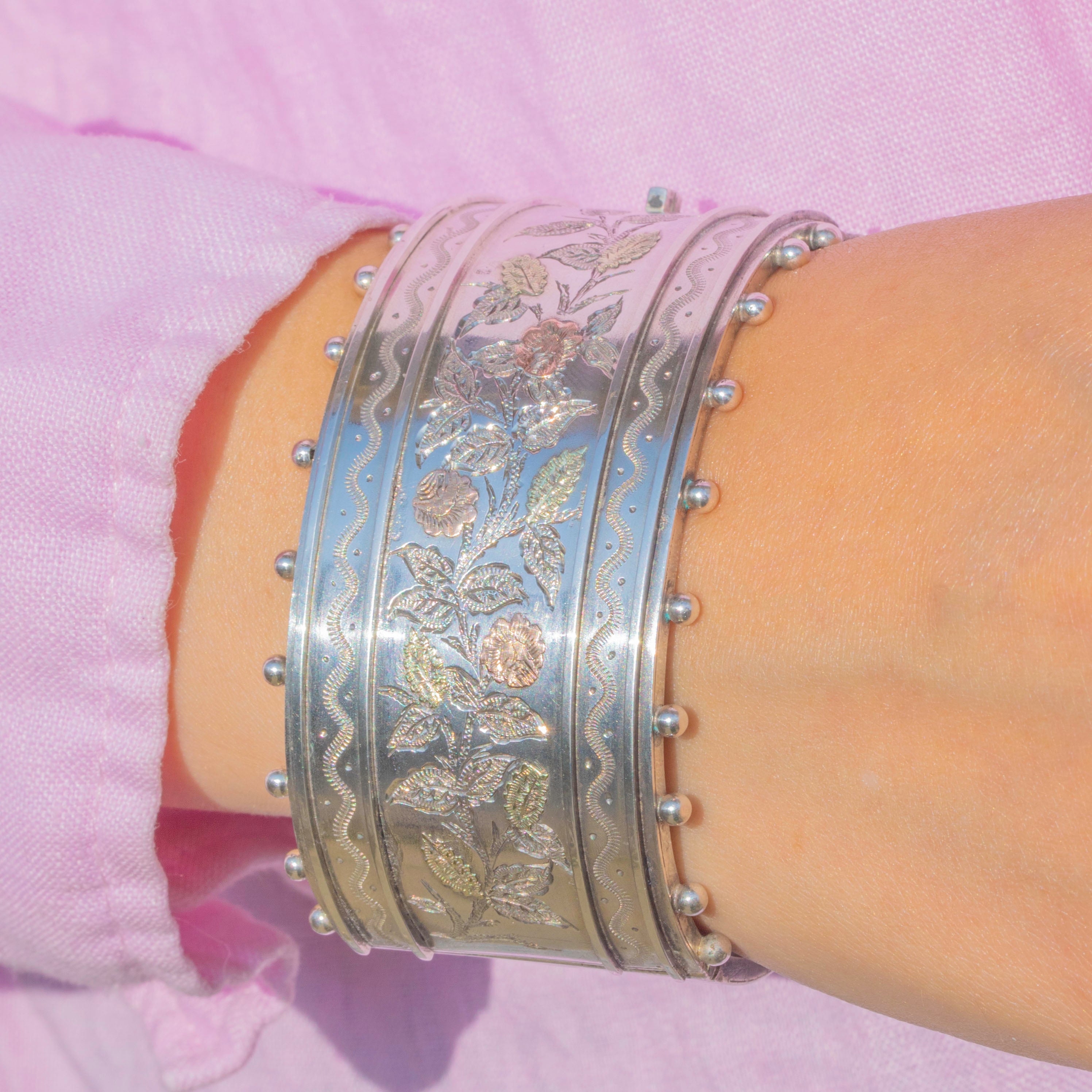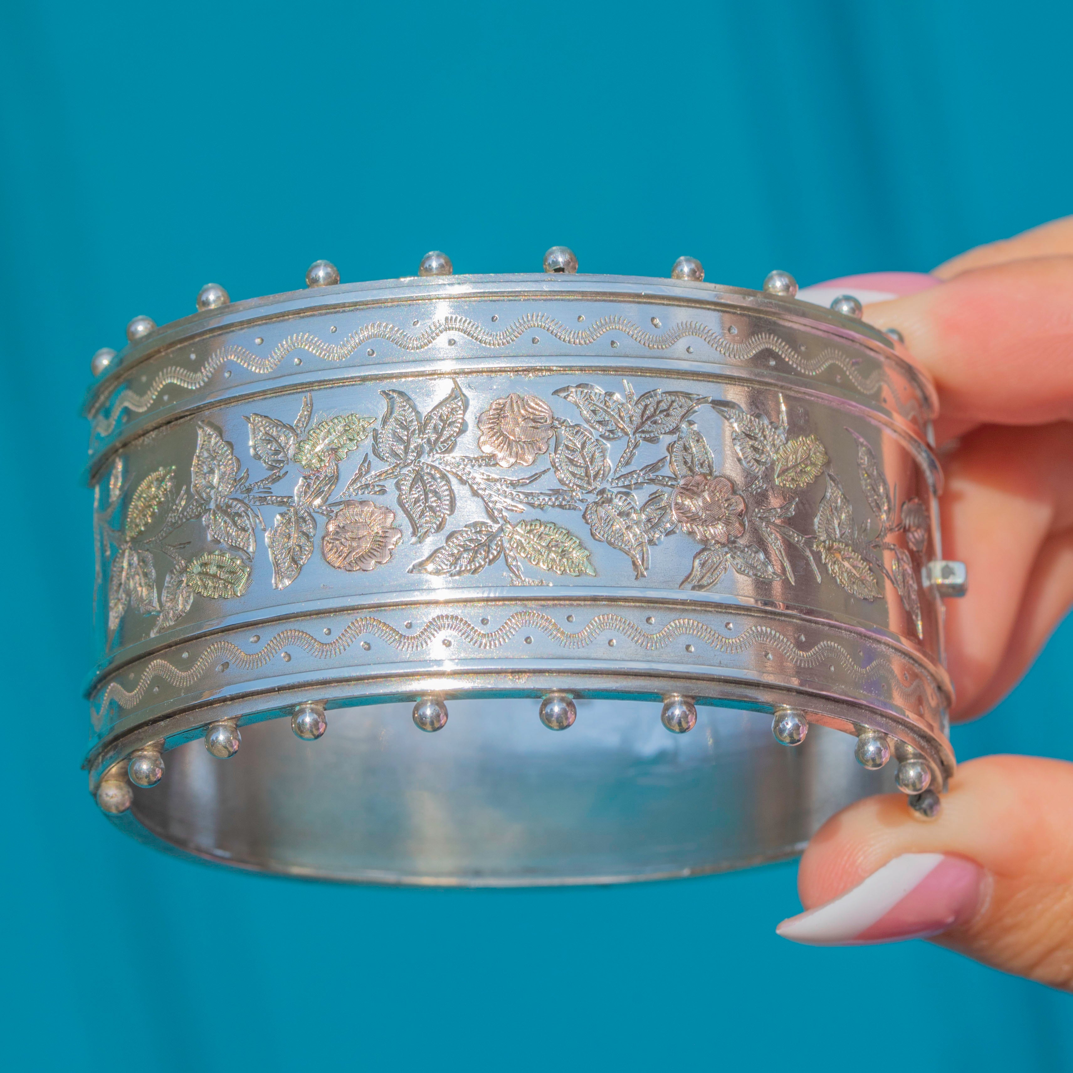 Victorian Aesthetic Silver & 9ct Gold Floral Engraved Cuff Bangle c.1882