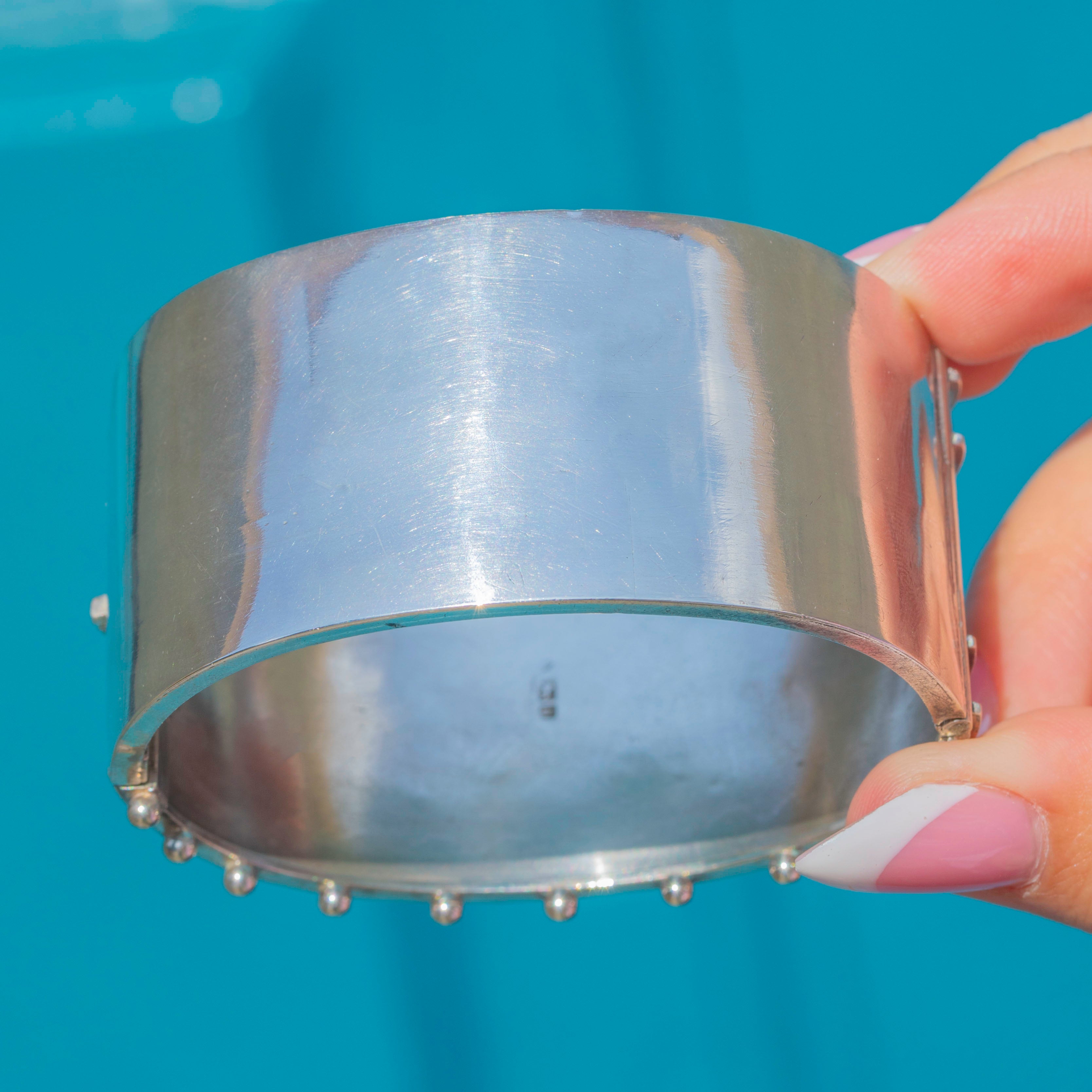 The rose details, a quintessential Victorian motif, are further enhanced by the decorative beaded bangle edge, adding a lovely texture and depth. Fully hallmarked and dated to 1882, this bangle is a wonderfully versatile piece to add antique charm to any outfit.