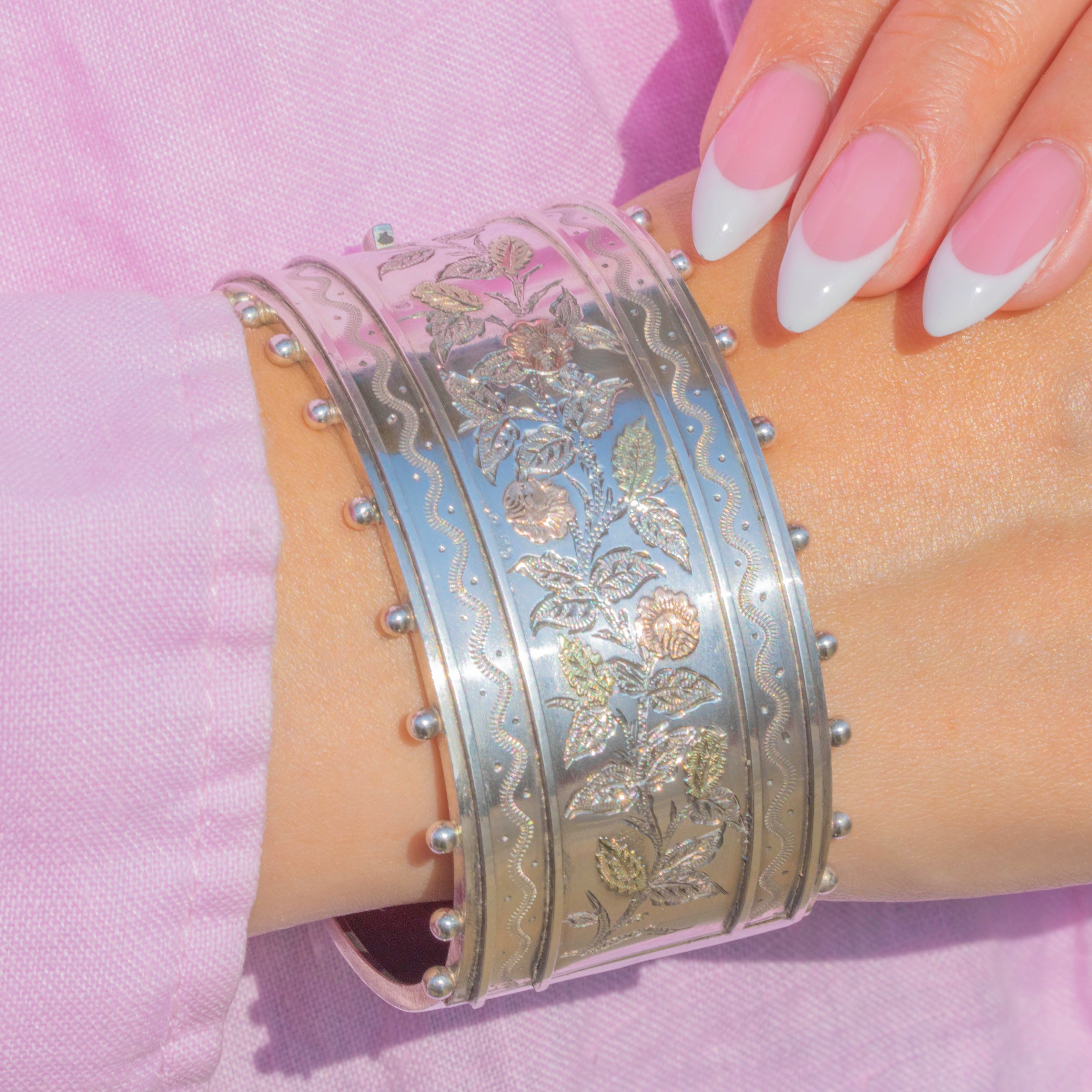 This cuff bangle, crafted from lustrous Sterling Silver, showcases intricate floral engravings on its front and features 9ct Gold accents, enhancing its antique charm.