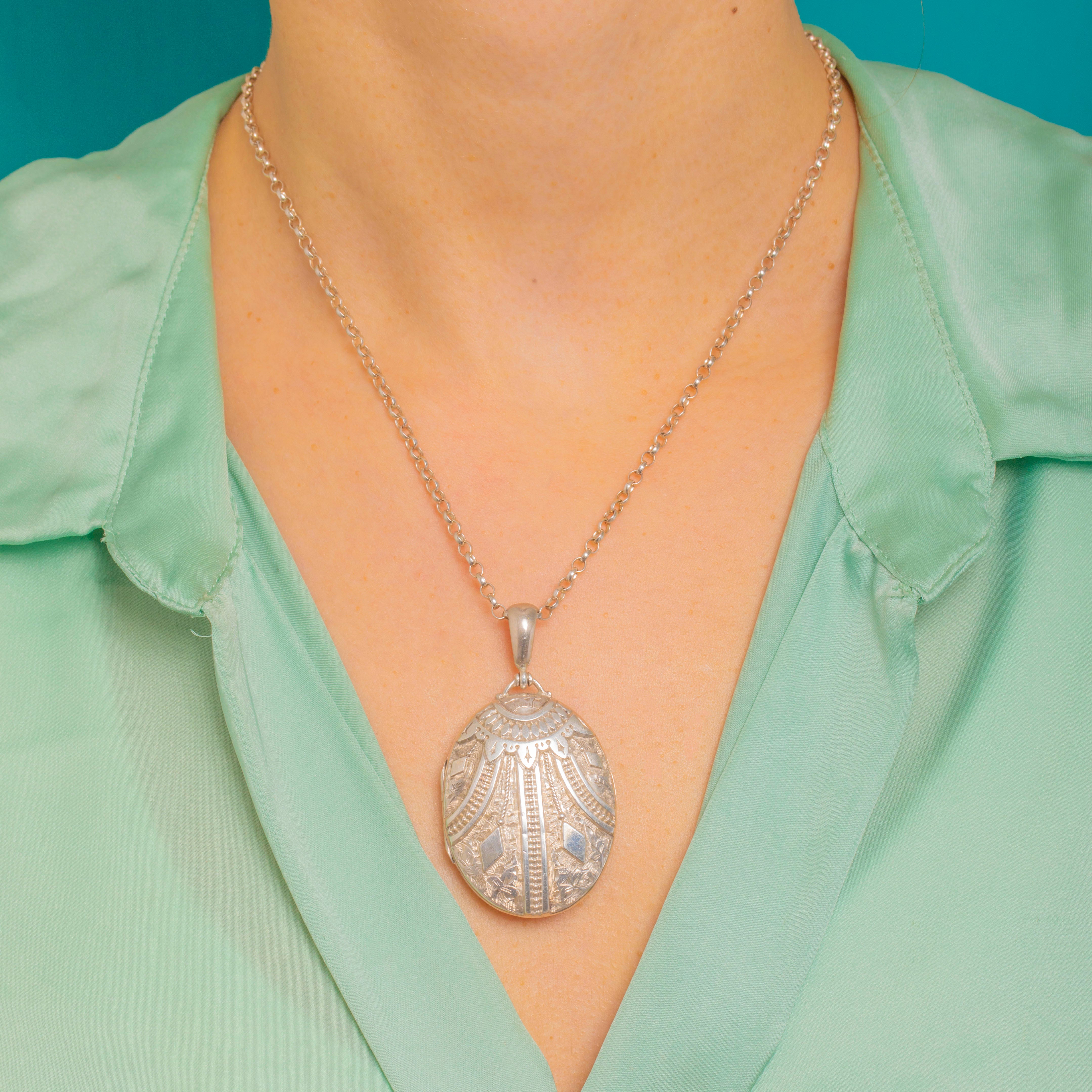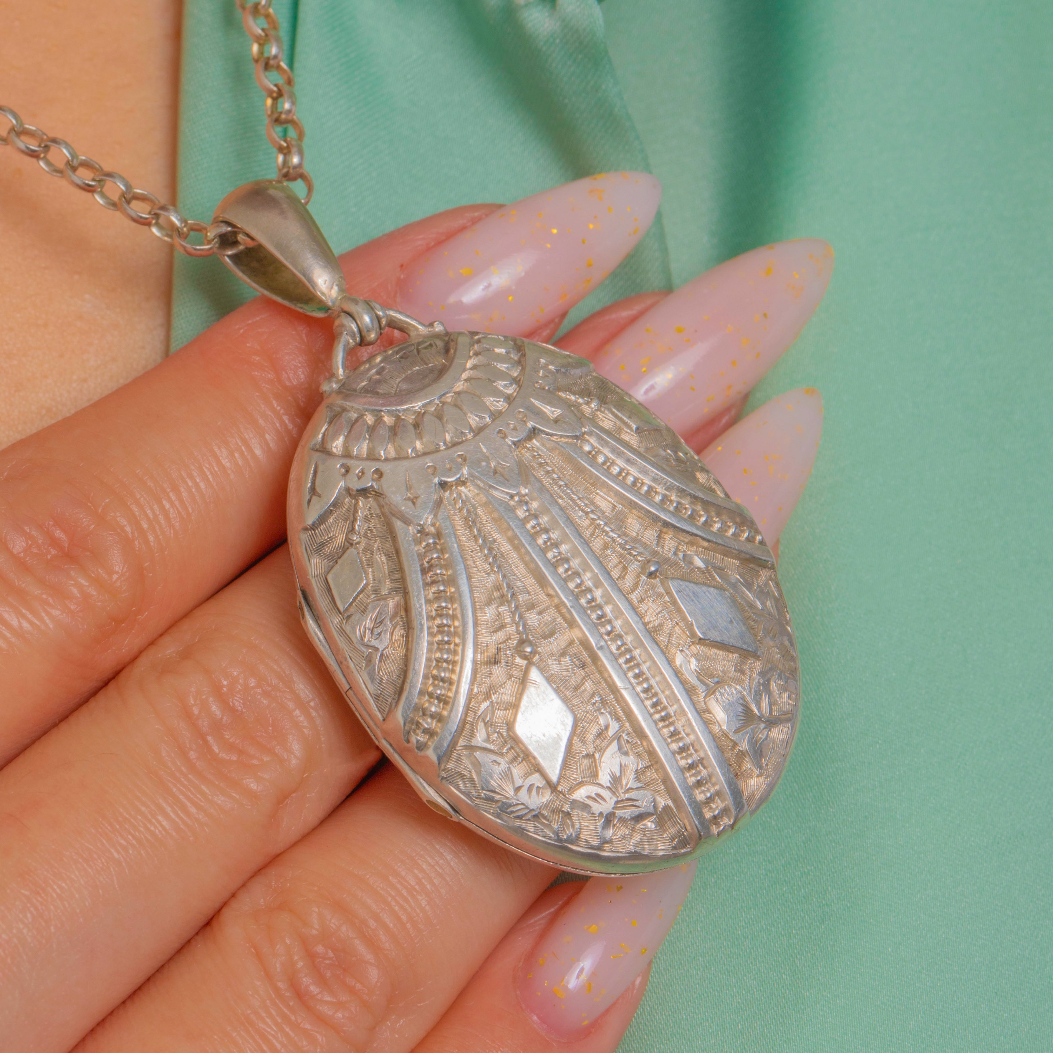 This striking Victorian Aesthetic locket is all about texture and detail, with beautifully engraved panels and beaded accents catching the light from every angle. It’s a wonderfully wearable piece of late-19th century Silver, finished with a classic Victorian bail for easy styling on your favourite chain.