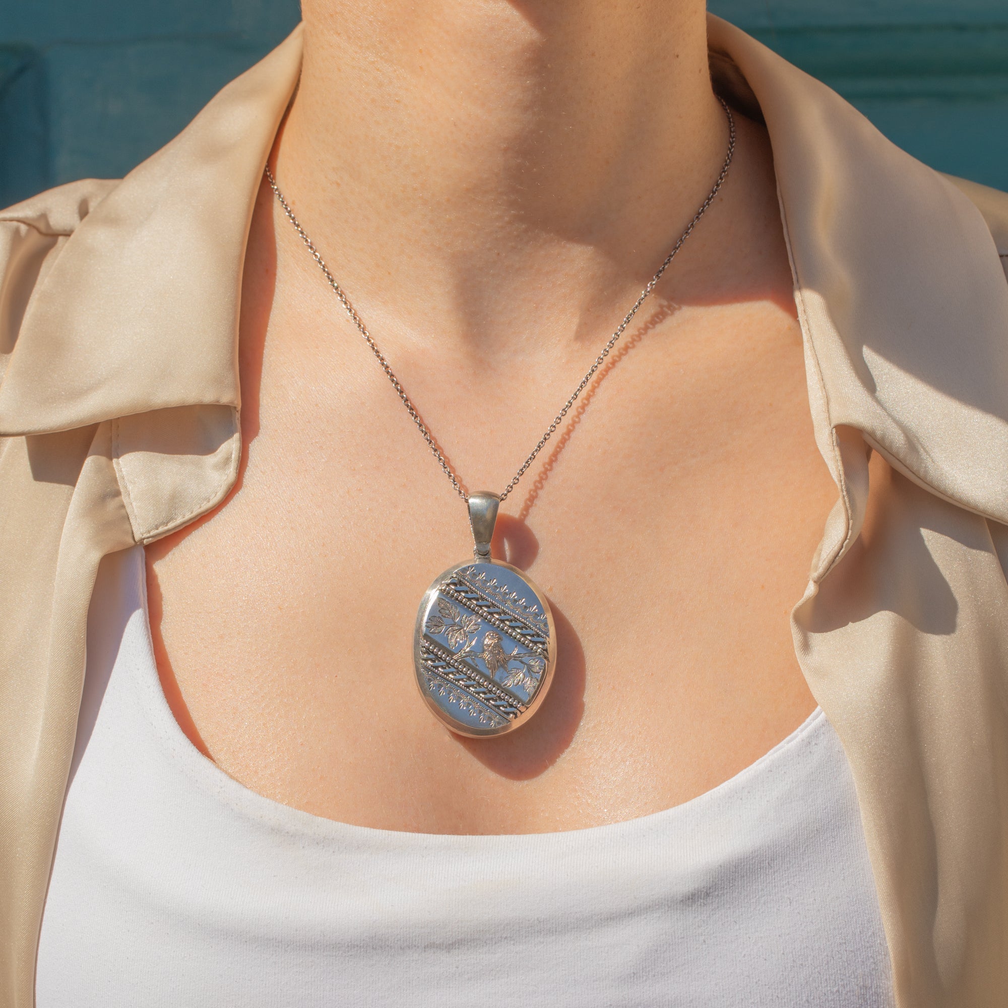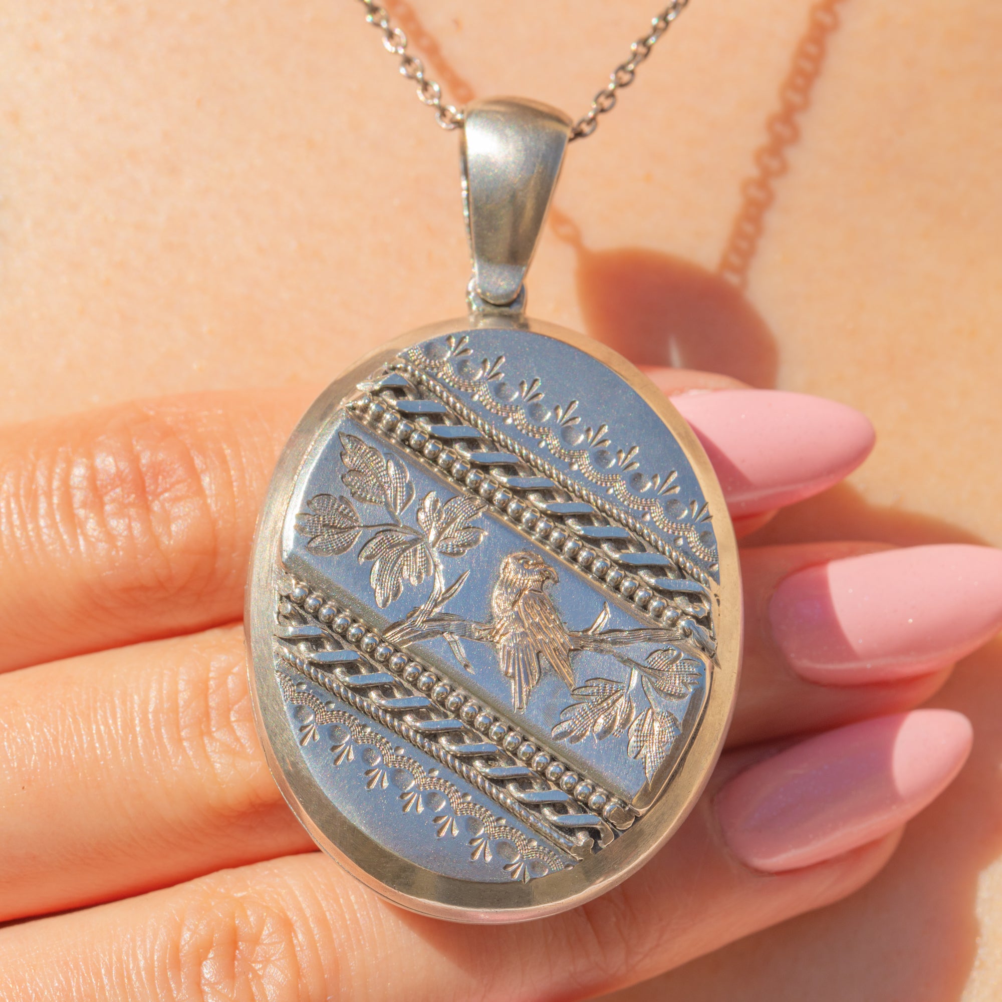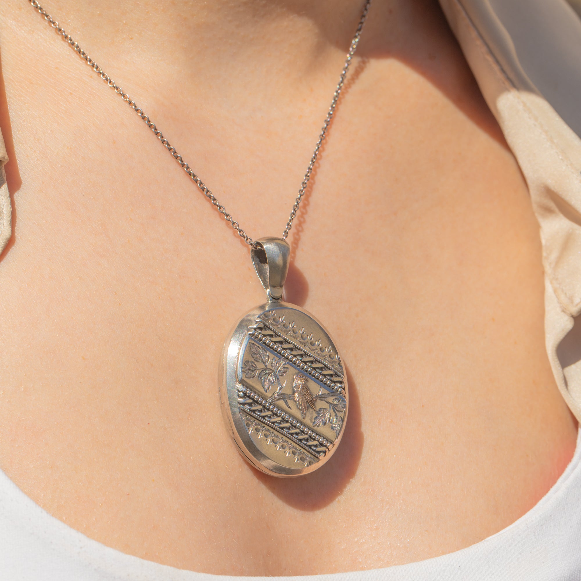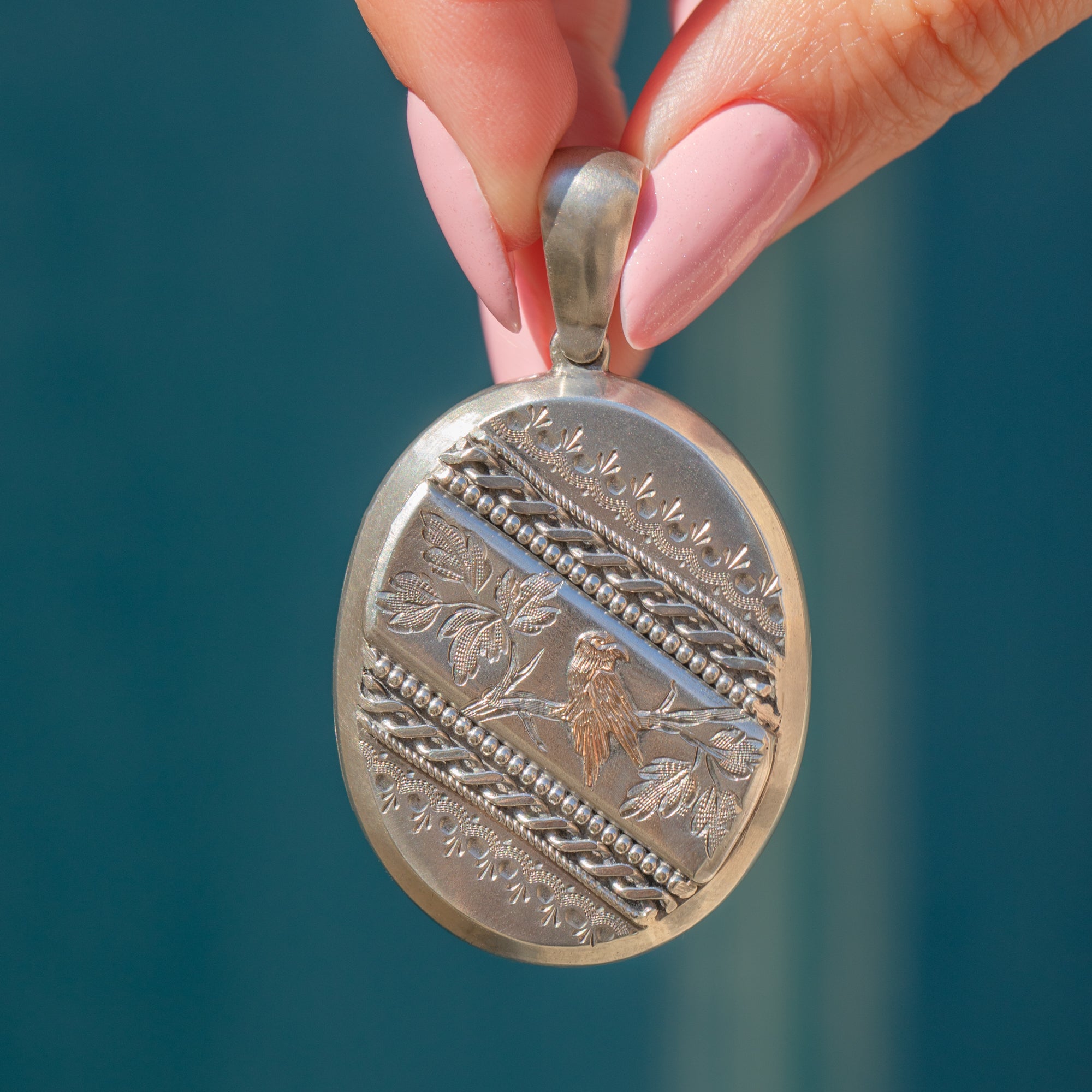 This striking Victorian Aesthetic Silver oval locket will make the perfect new abode for your most cherished photograph! Crafted from solid Sterling Silver, the front of the locket is embellished with ornate engravings and beaded details, with a sweet 9ct Gold bird perched amongst foliage.