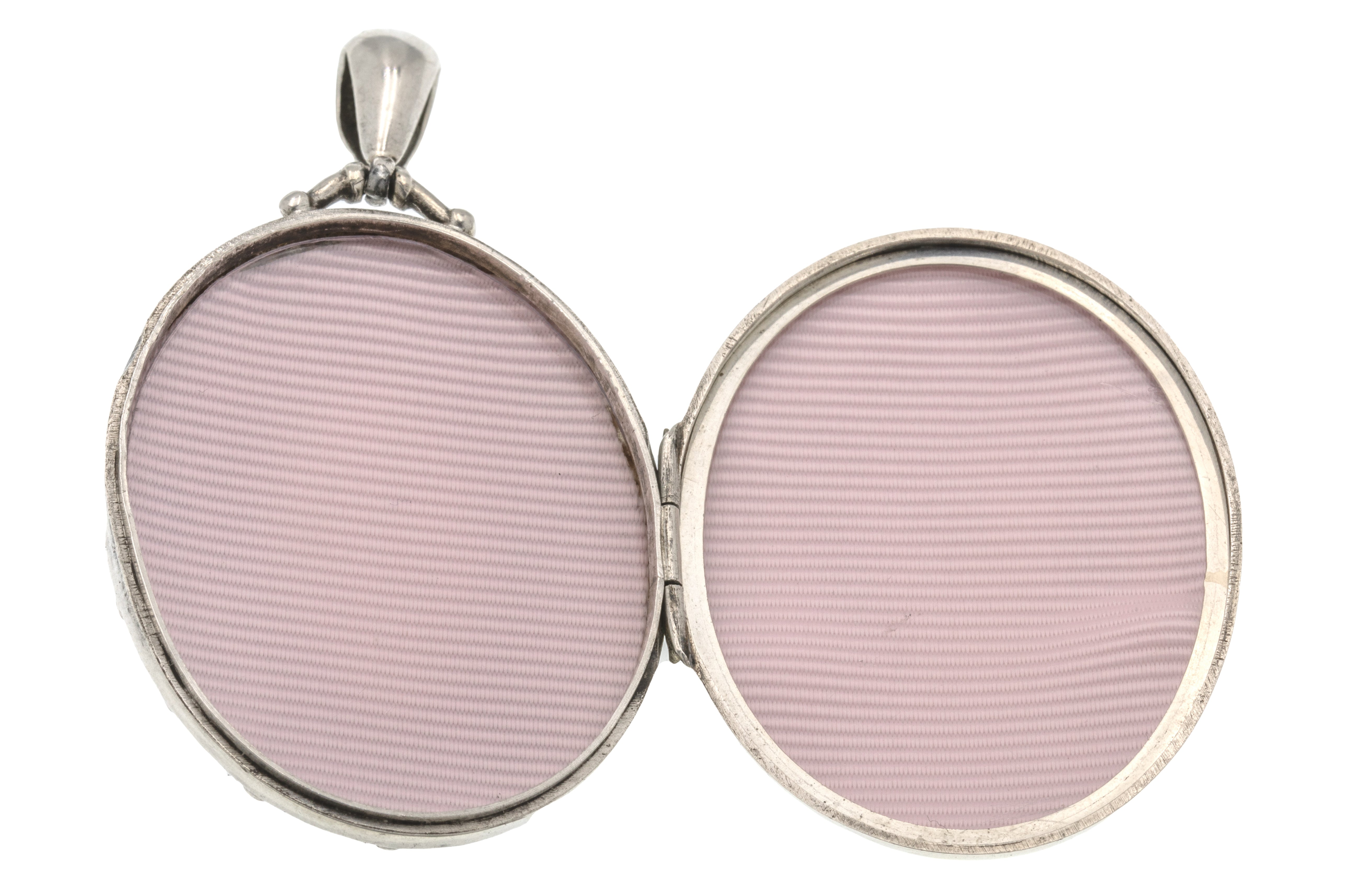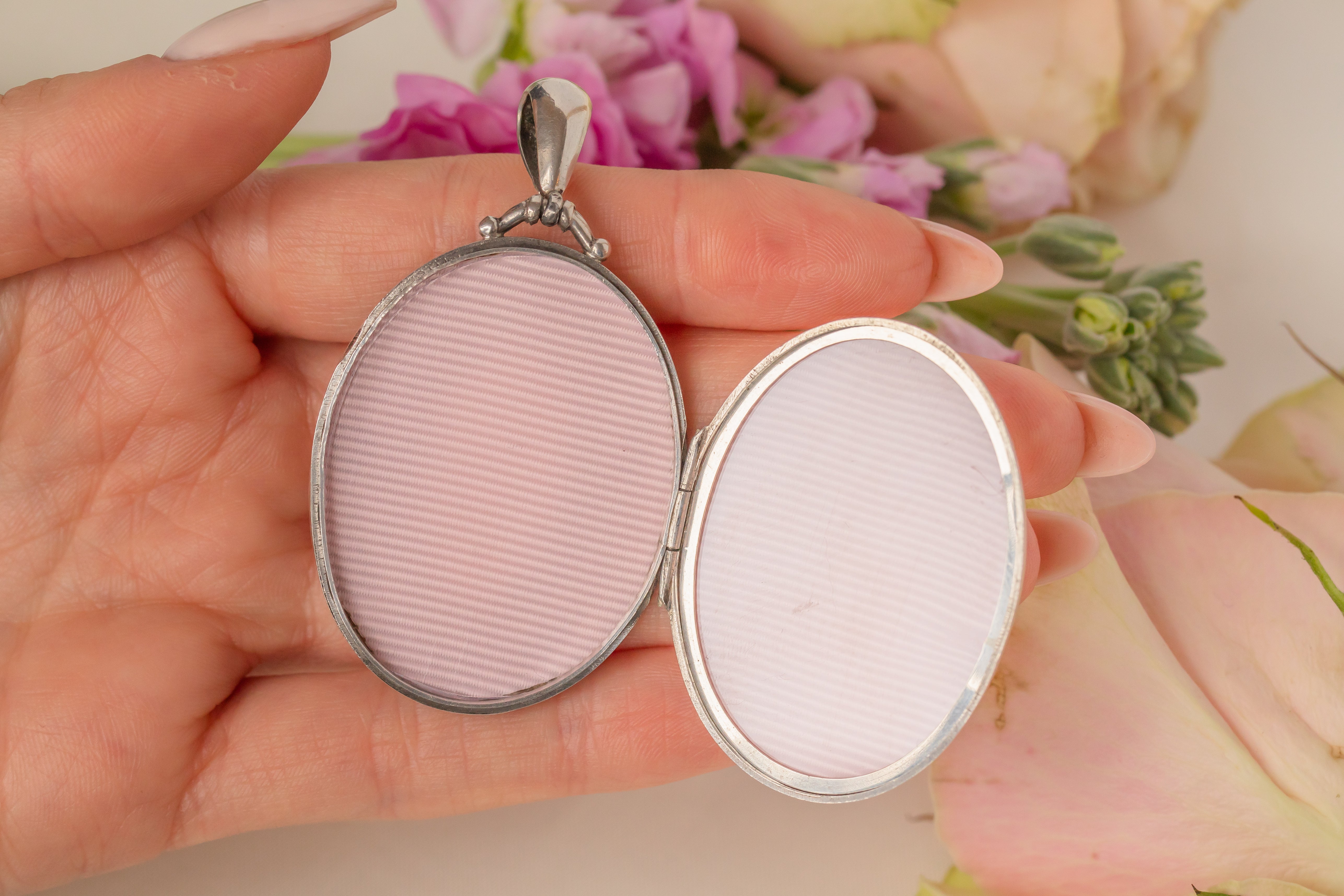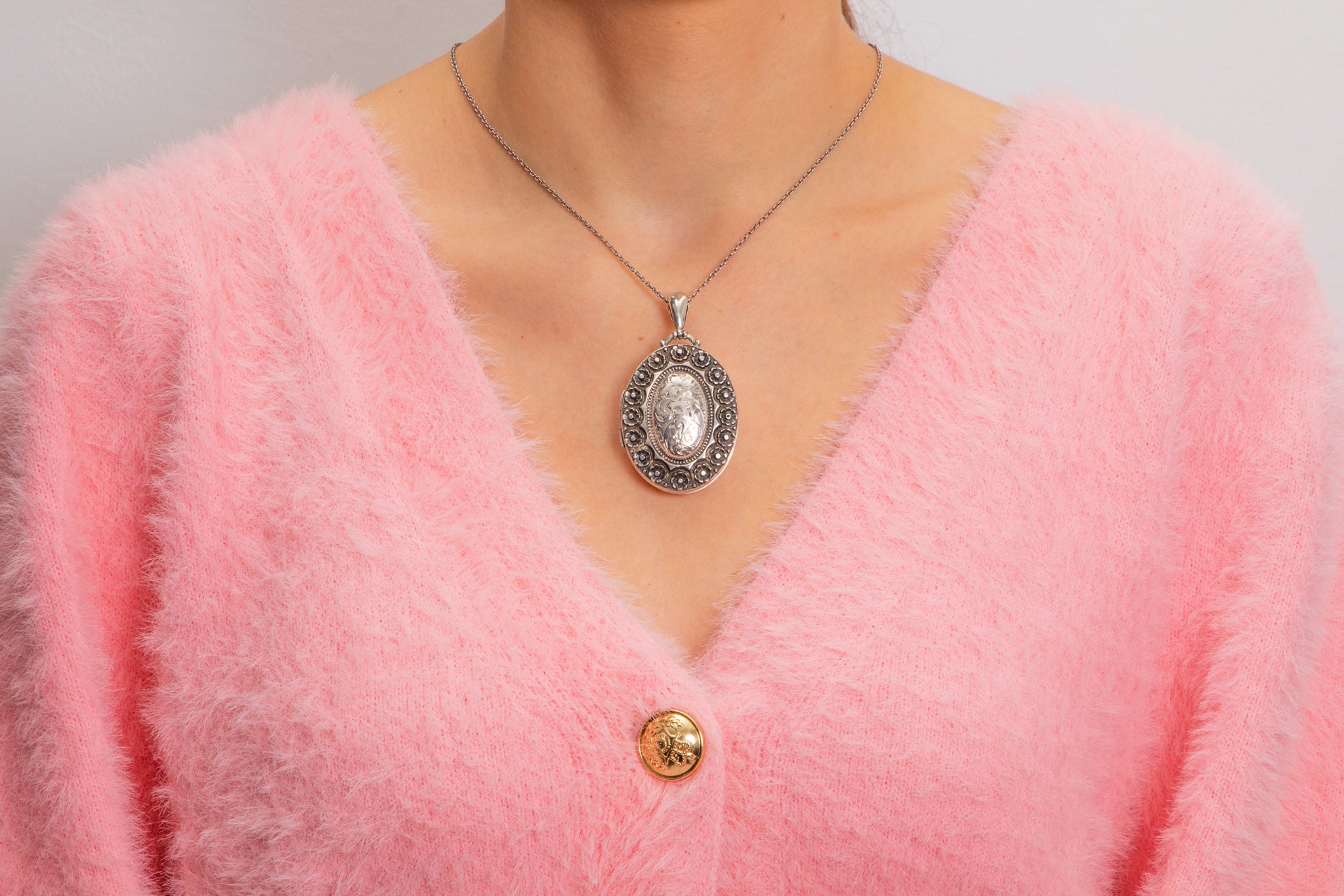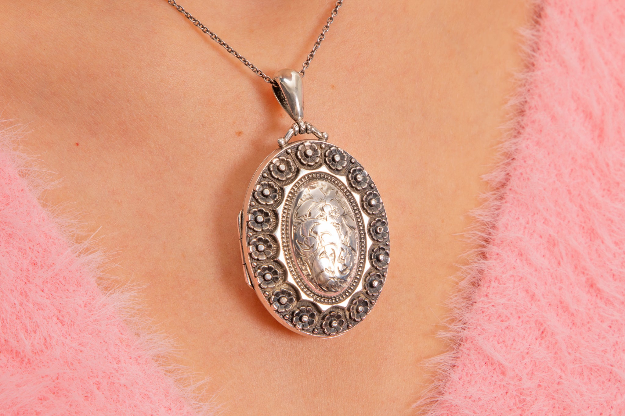With two frames inside, this large oval locket provides a sweet abode for two of your most precious photographs. Complete with a substantial bale, suspend her from a chunky Silver chain for the ultimate antique look!
