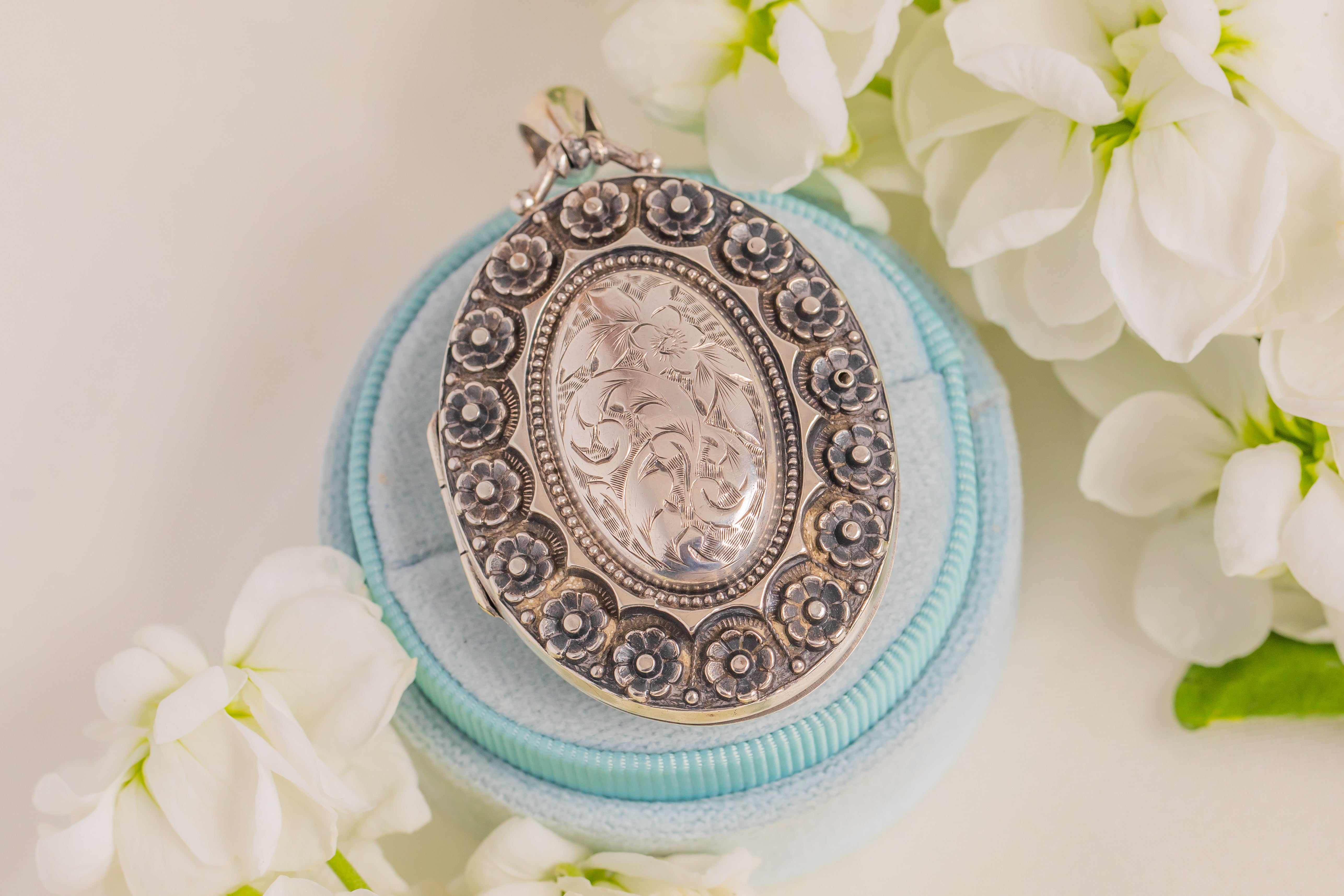 One for the antique collectors, this Victorian Aesthetic Sterling Silver flower locket is an original English antique hallmarked to 1880! Flaunting a floral engraved domed front, framed by a halo of embossed flowers, this antique locket has bundles of Victorian charm.