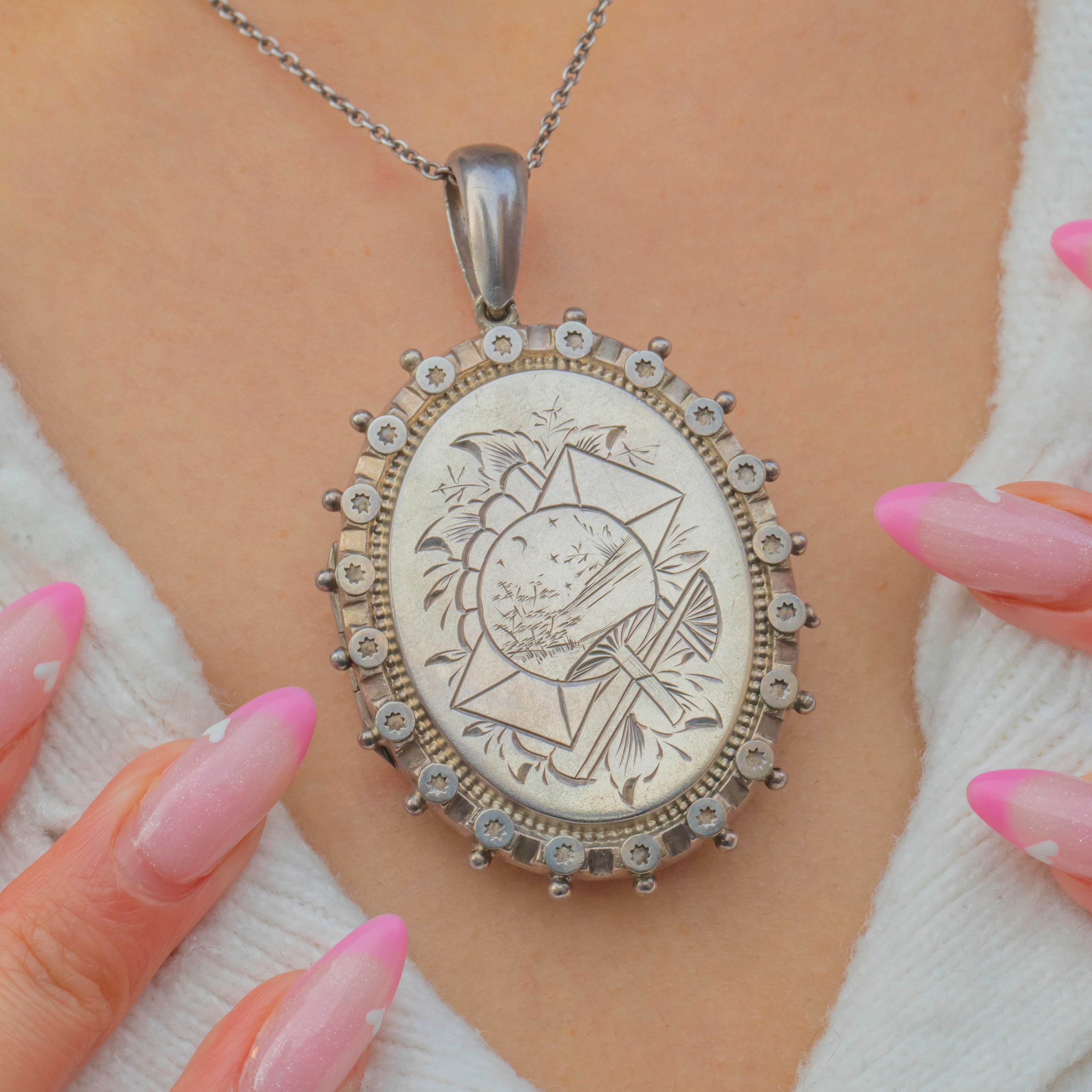 This striking Victorian aesthetic Sterling Silver locket is the perfect statement piece for women who love to stand out from the crowd! Featuring a unique motif of an East-Asian pastoral scene inscribed onto a fan, this antique locket is crafted entirely from Sterling Silver.