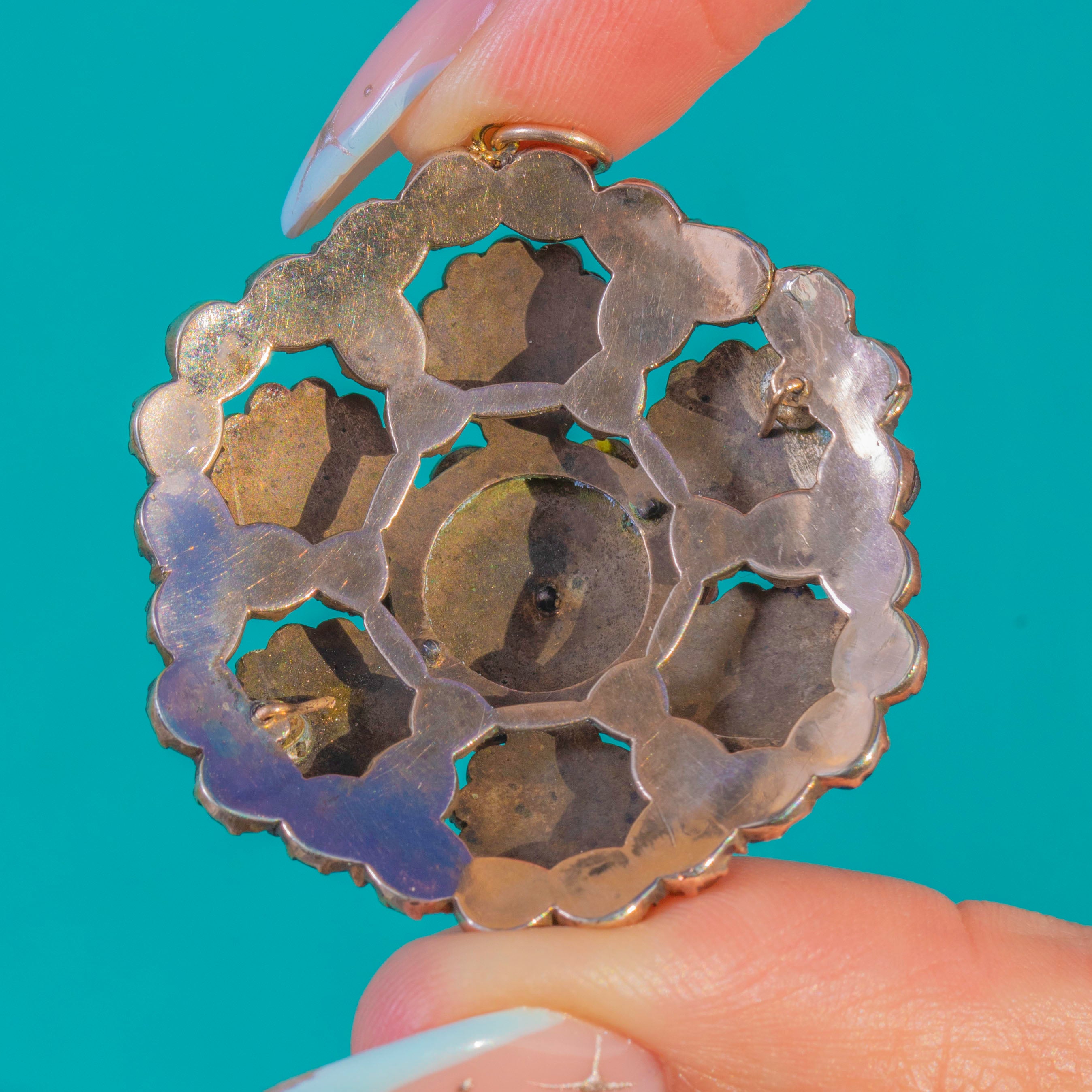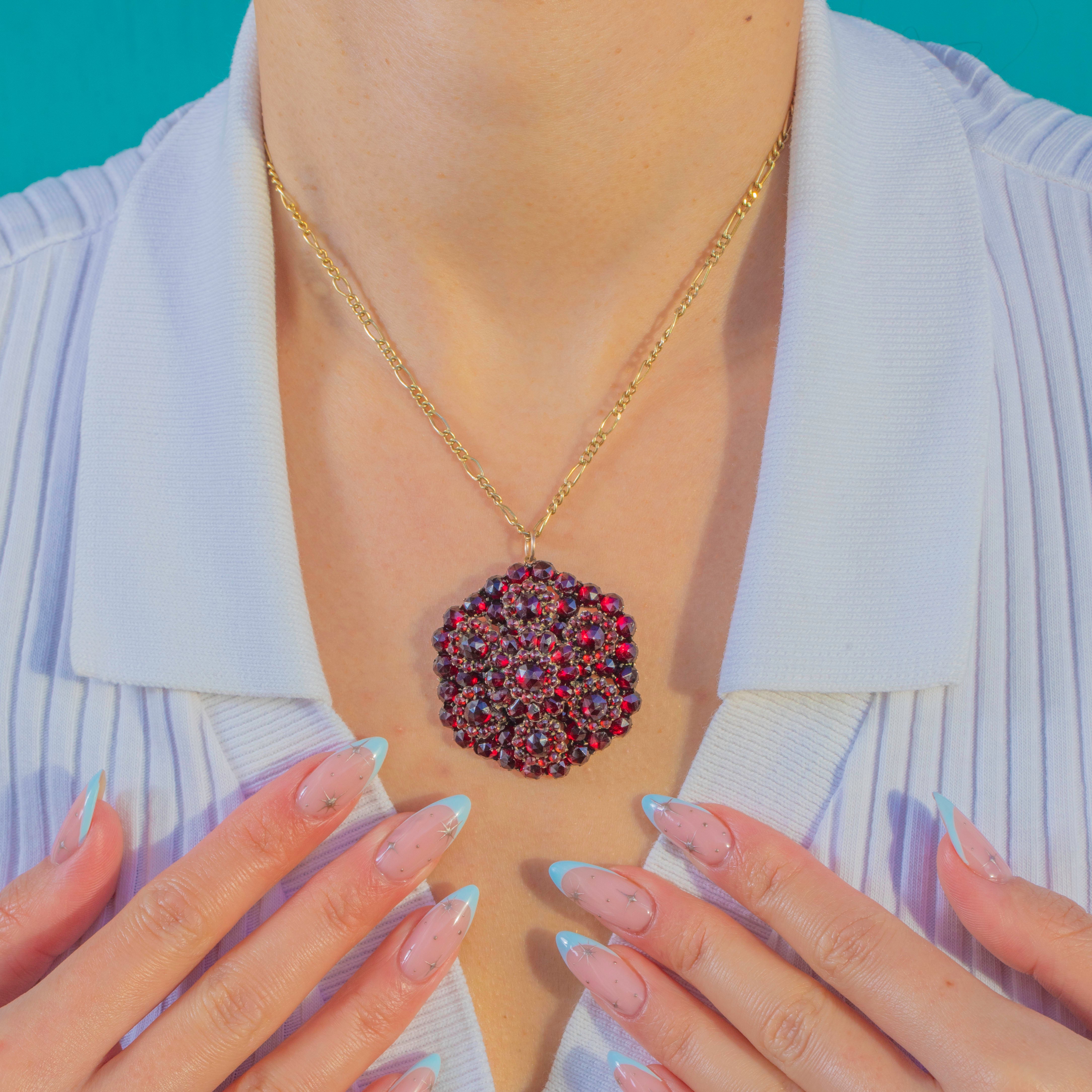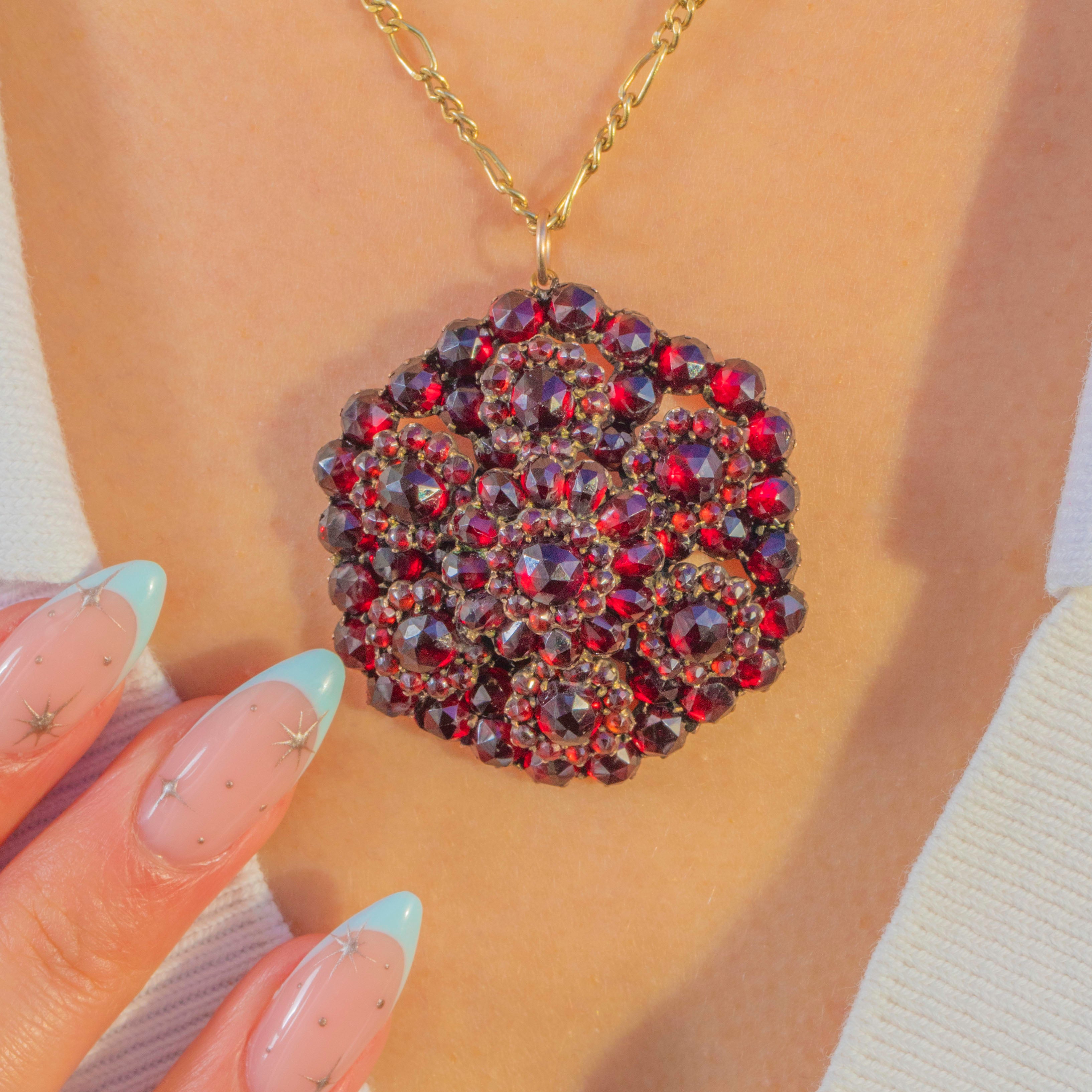 A glowing constellation of Bohemian Garnets, this Victorian flower pendant blooms with deep claret tones. Petite rose-cut Garnets are pavé-set in tight concentric rosettes across a gently domed surface, finished with a scalloped edge and radiant starburst sparkle. The 6ct Gold mount shows a mellow antique patina, its recesses lending depth that enhances the richness of the stones.