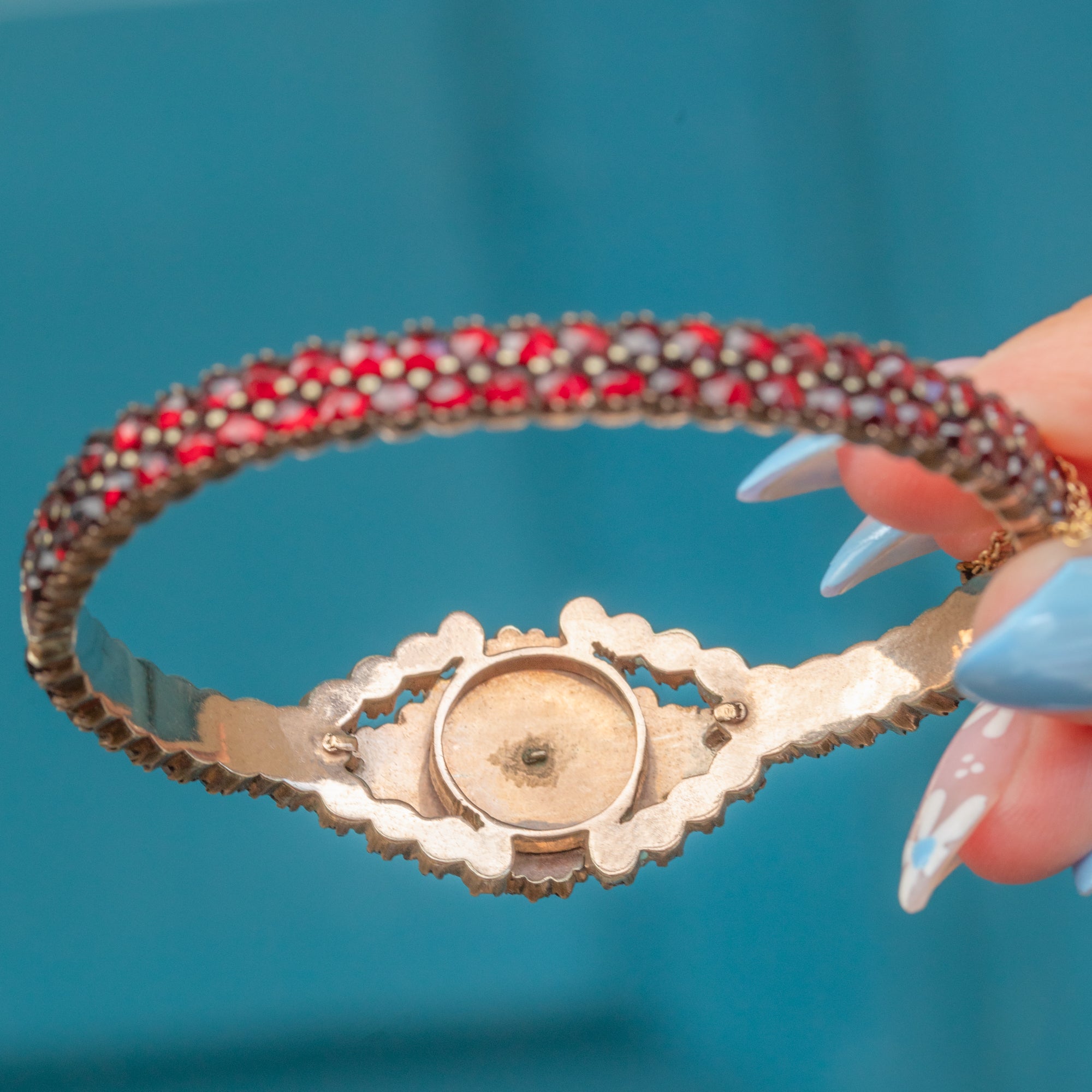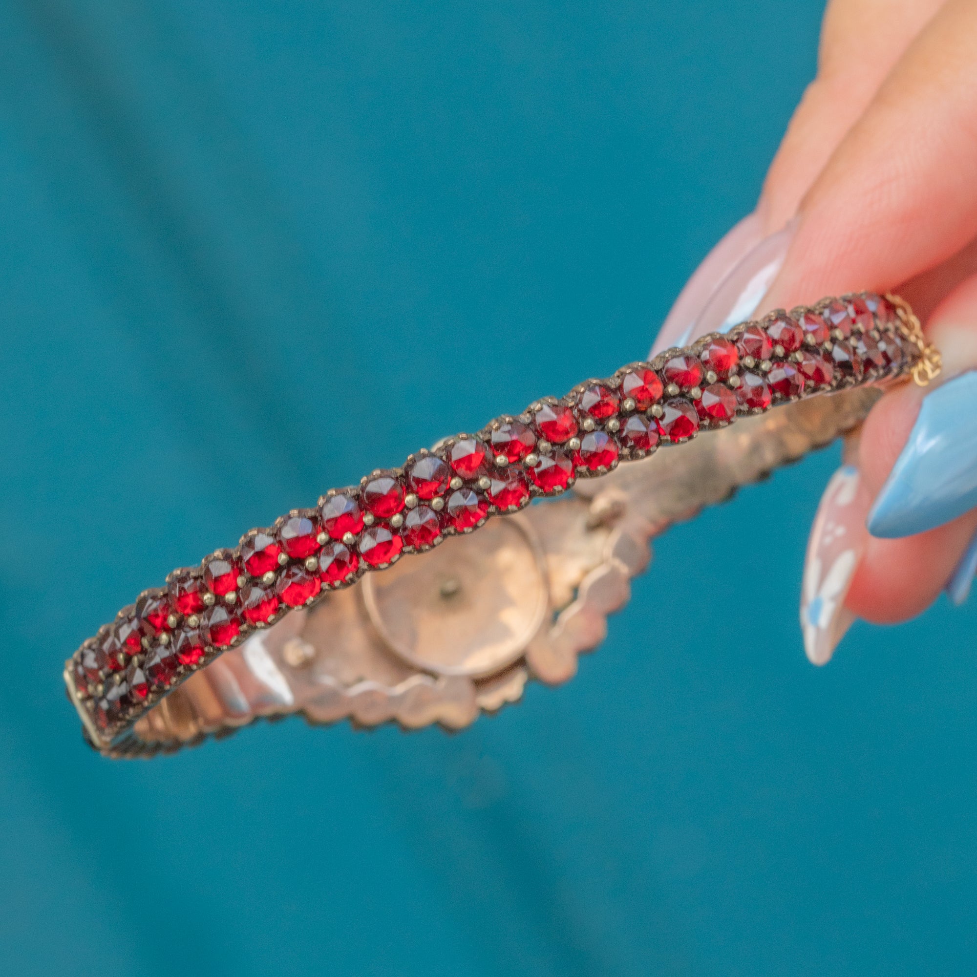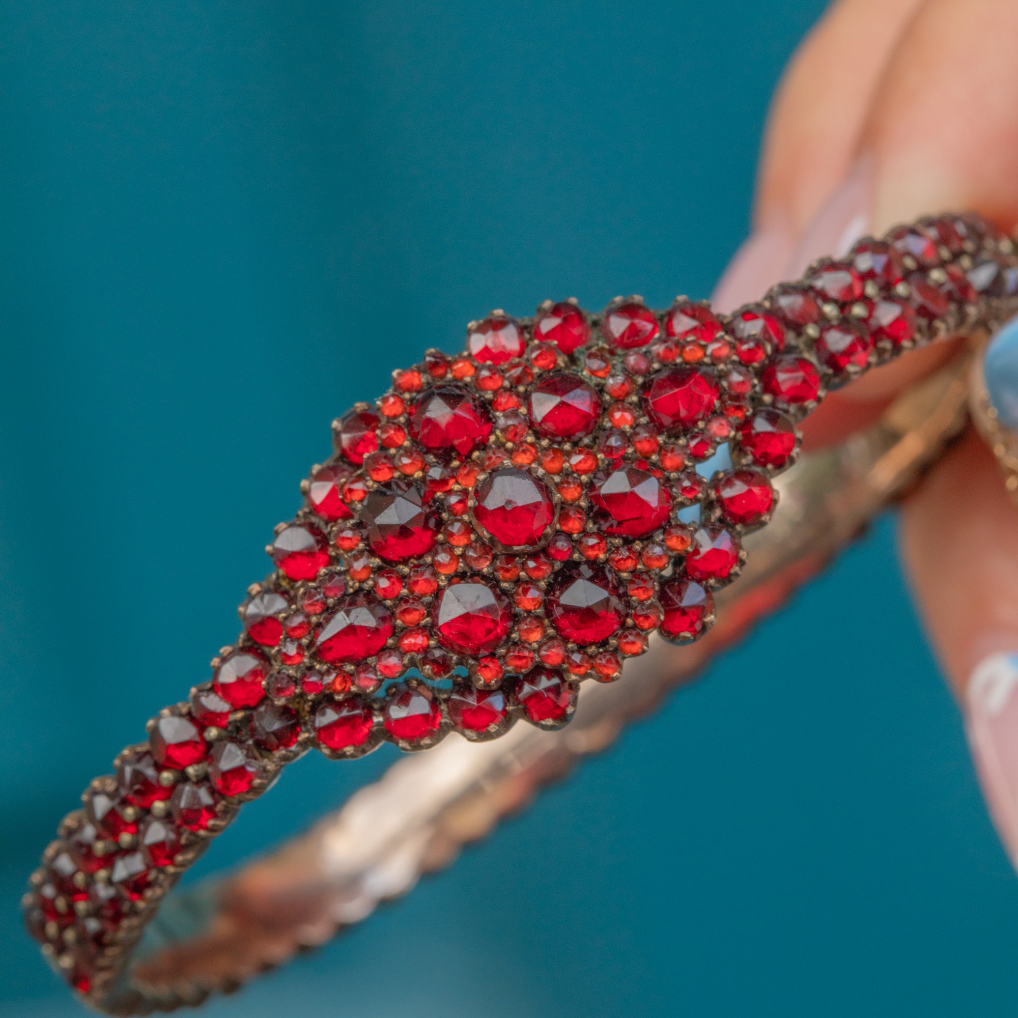 This Victorian bangle is a strikingly unique piece, displaying a myriad exquisite rose-cut Garnets across the entirety of the bangle, each with distinct deep sanguine hues with flashes of cherry red as they catch the light.