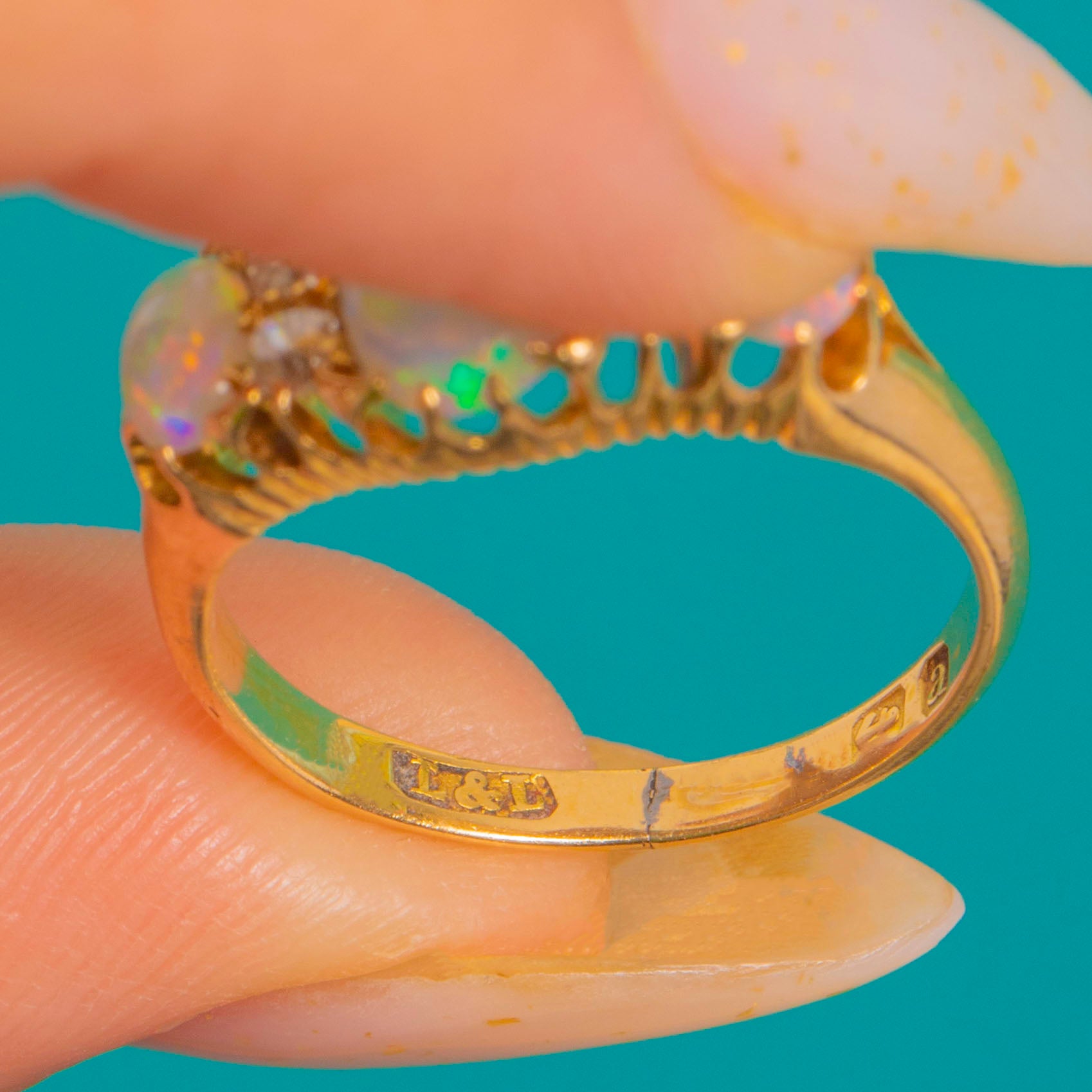 VERY GOOD: The Opals are seated and fully intact. The Gold shows light surface wear with minor scratches and small dents consistent with age and use, and there is a visible line/solder mark on the inner band from a past resize which has partially obscured some hallmarks. Overall the ring is very wearable and has been well cared for given its age.