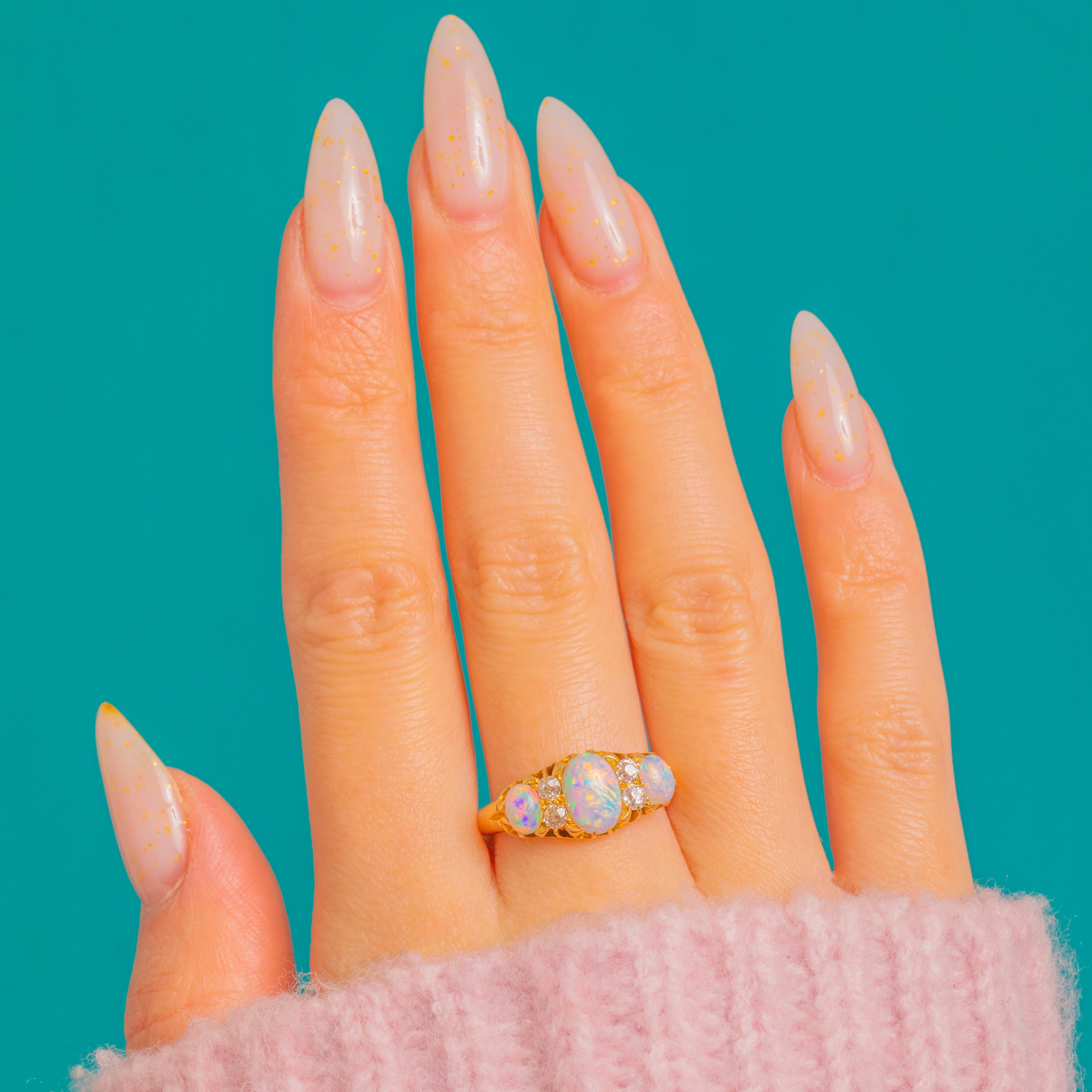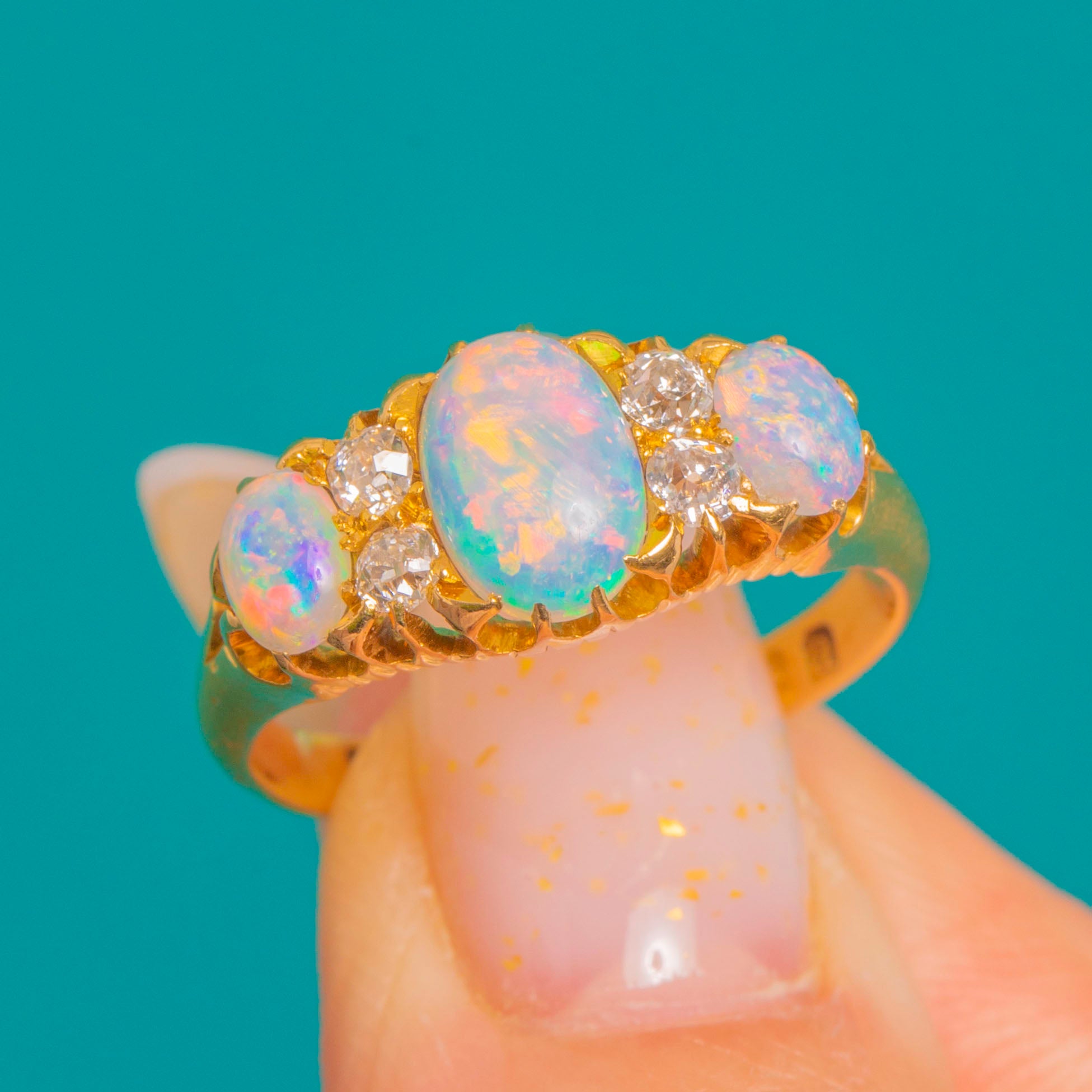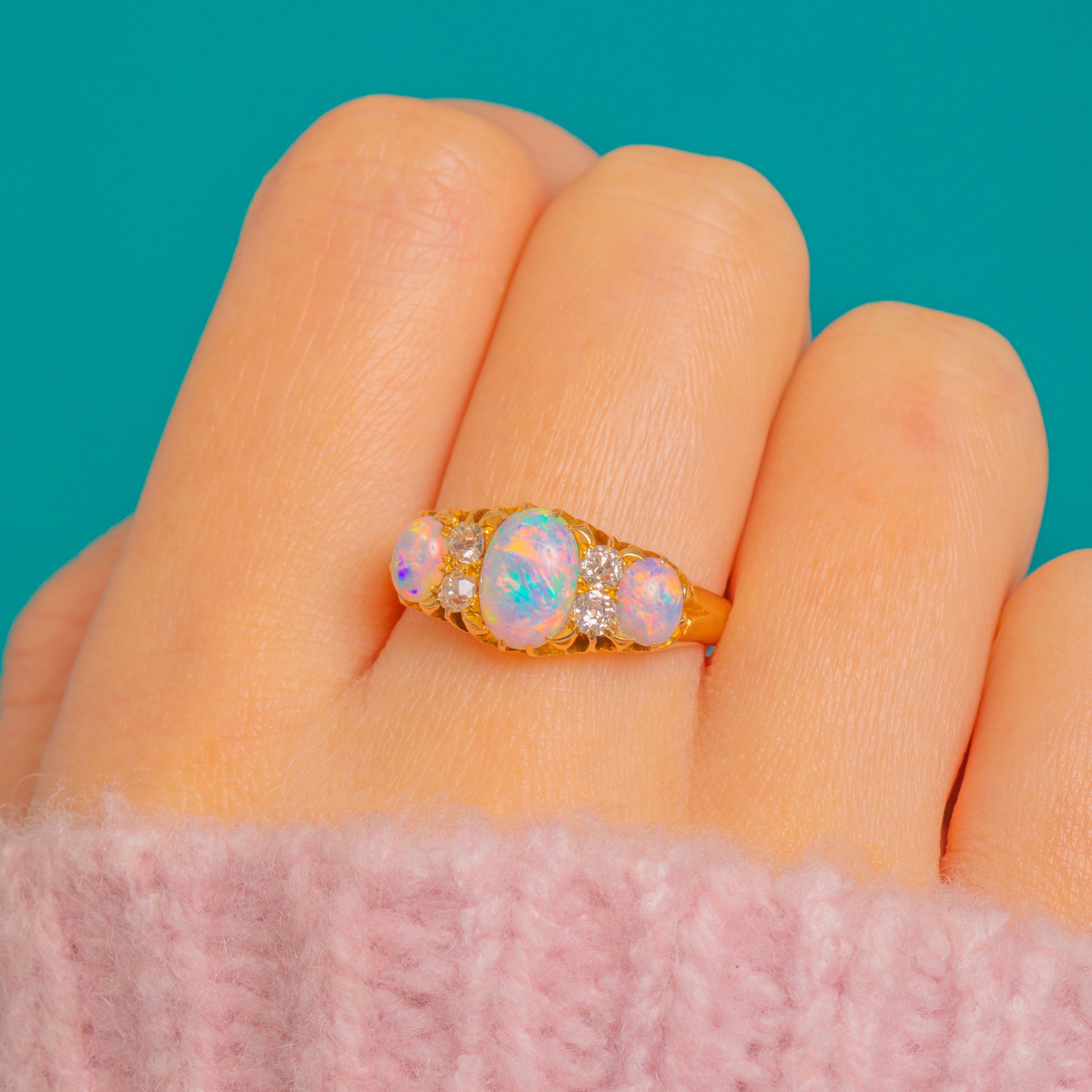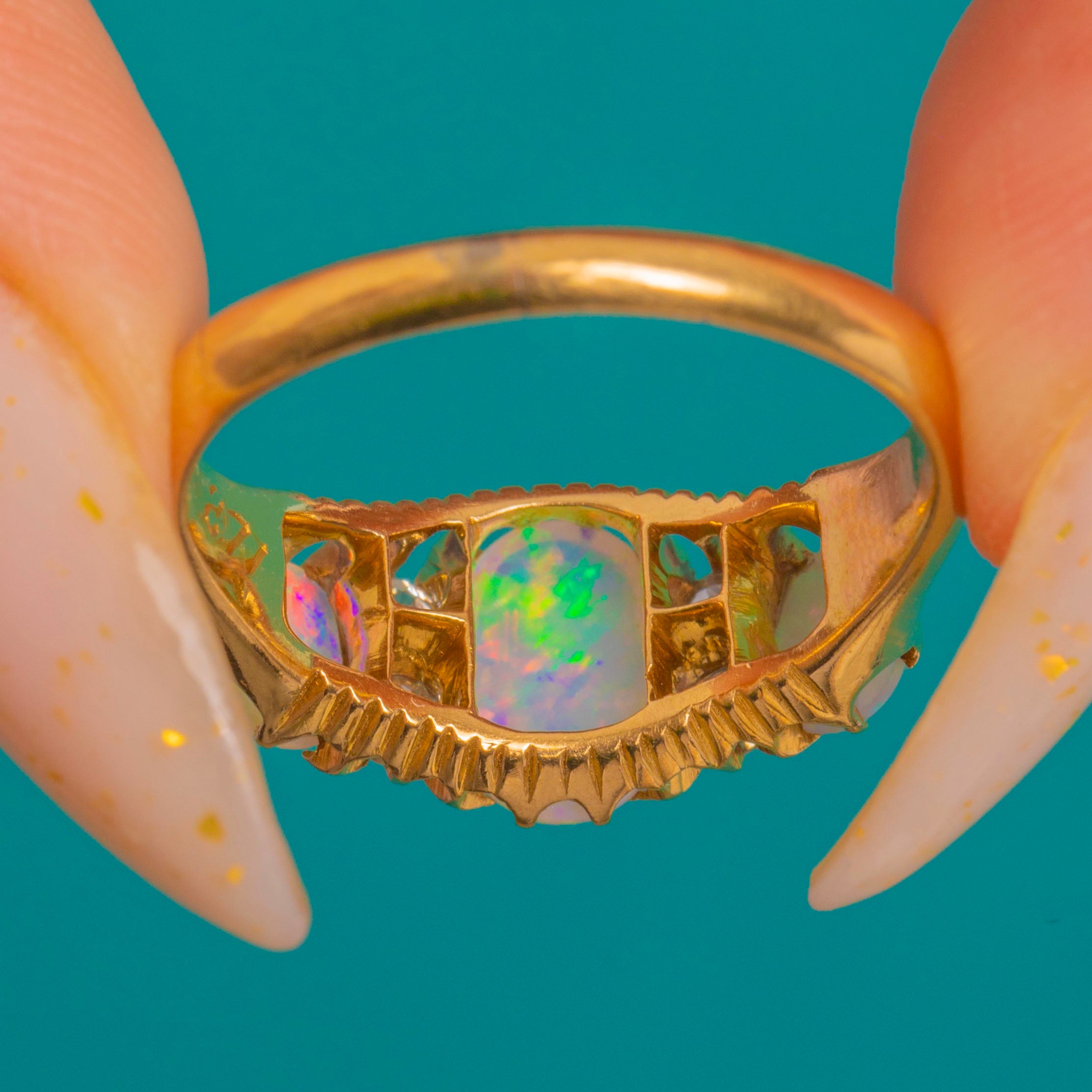 A striking Victorian ring set with three vibrant Opal cabochons.