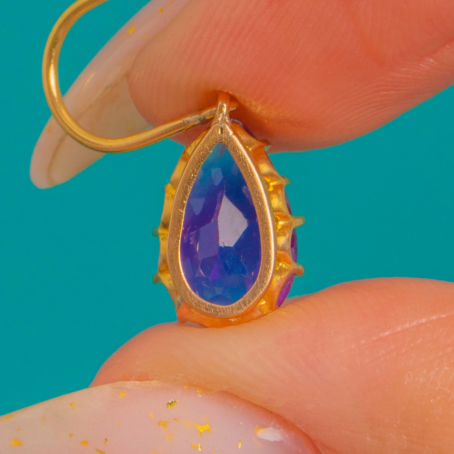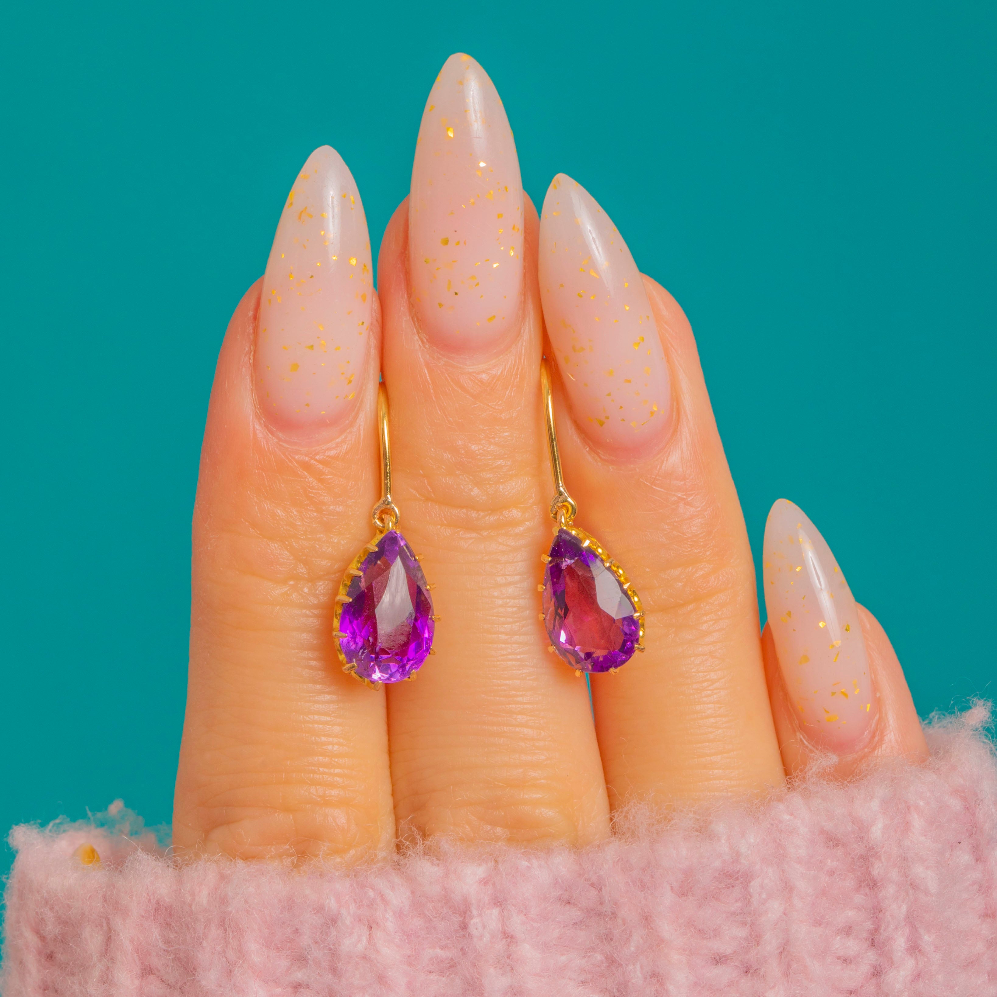 An elegant pair of 15ct Gold pear-drop Amethyst earrings, each set with a faceted pear Amethyst in a scalloped multi-prong collet and suspended from a simple shepherd-hook wire.