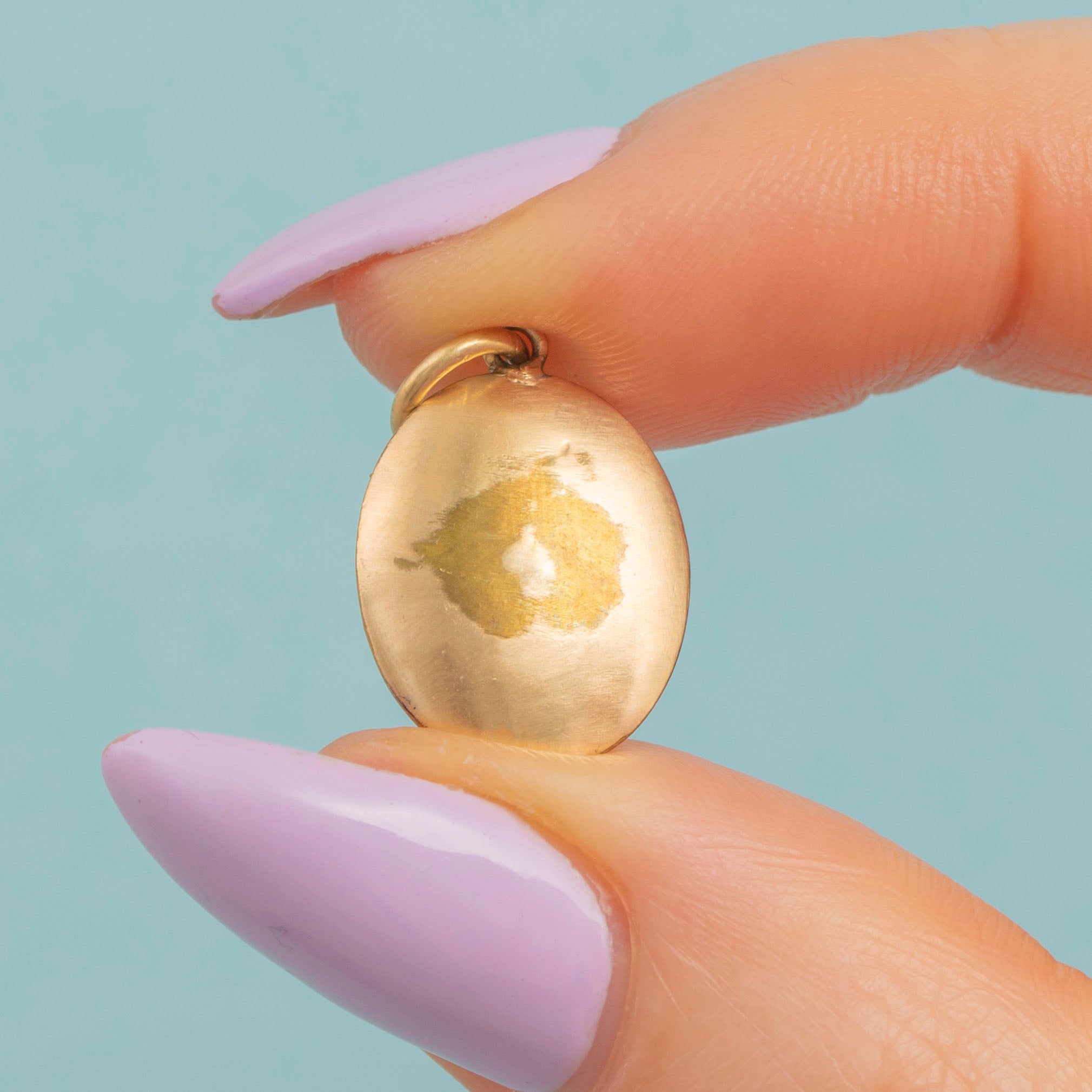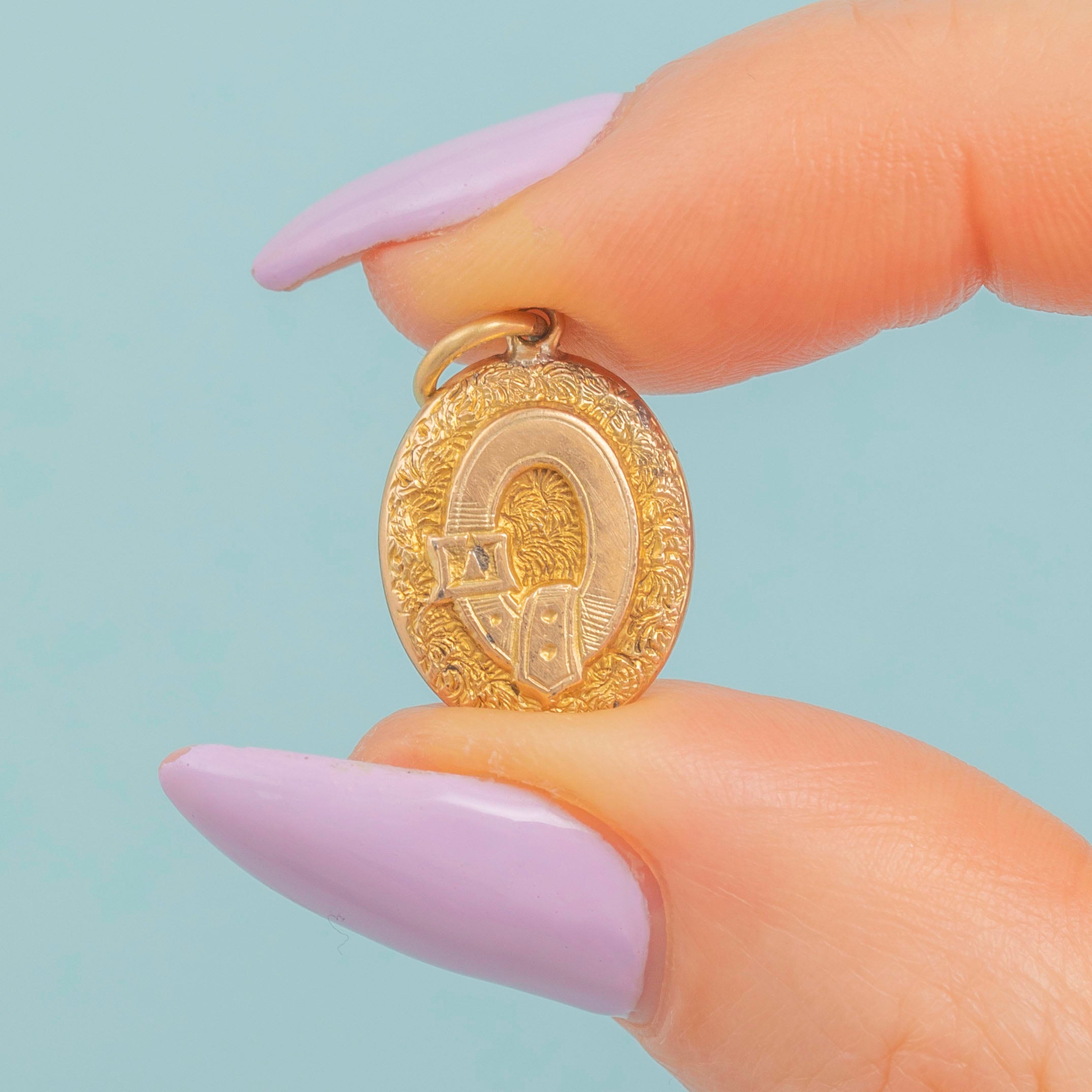 VERY GOOD. This Victorian engraved buckle motif pendant is in lovely condition. The Gold-toned metal is buttery and the details have all remained clear and defined. Once part of a cufflink set, this charm has a trace of her original use visible on the back, but remains smooth and beautifully lustrous overall. The jump ring makes it easy to attach this charming pendant to any chain of your choice!