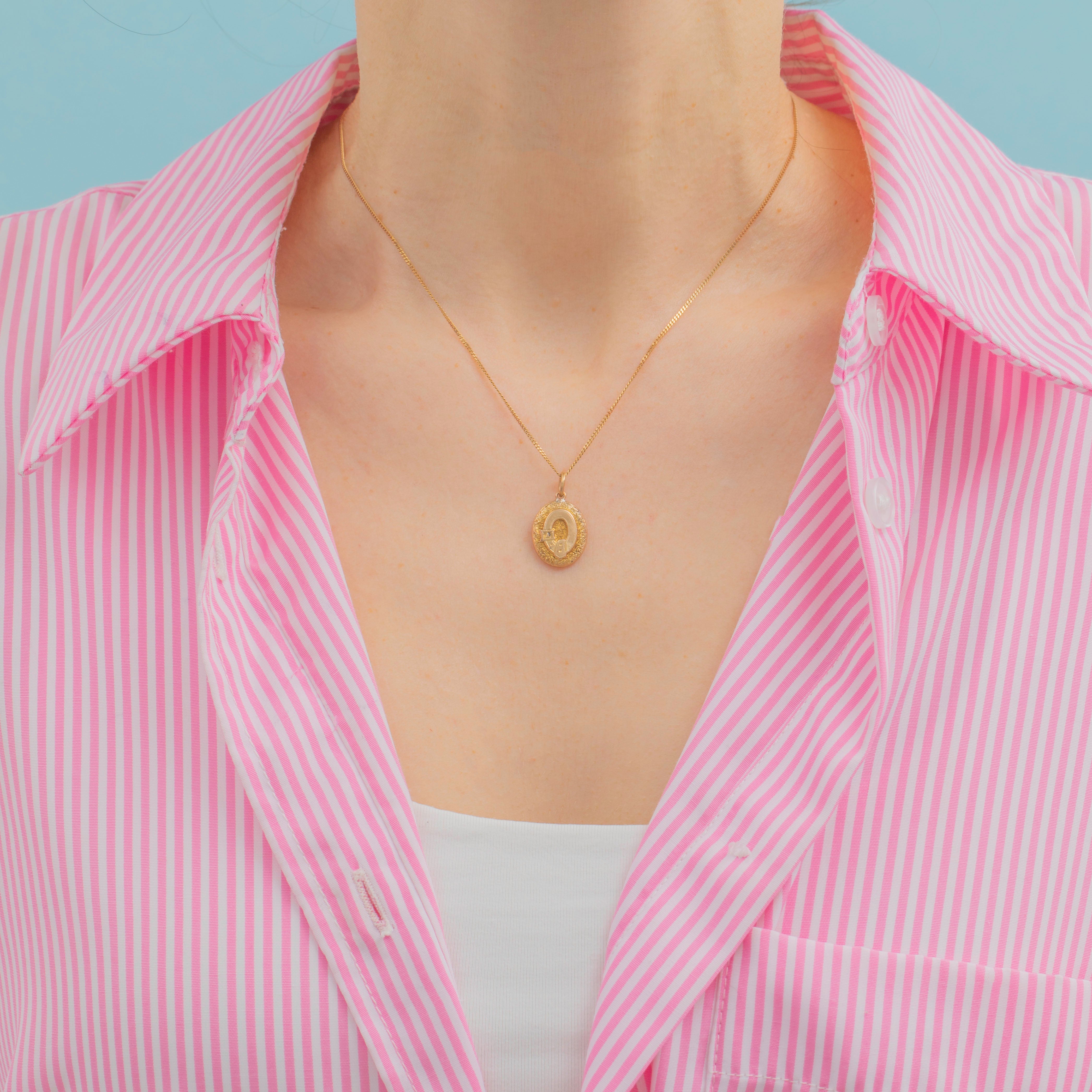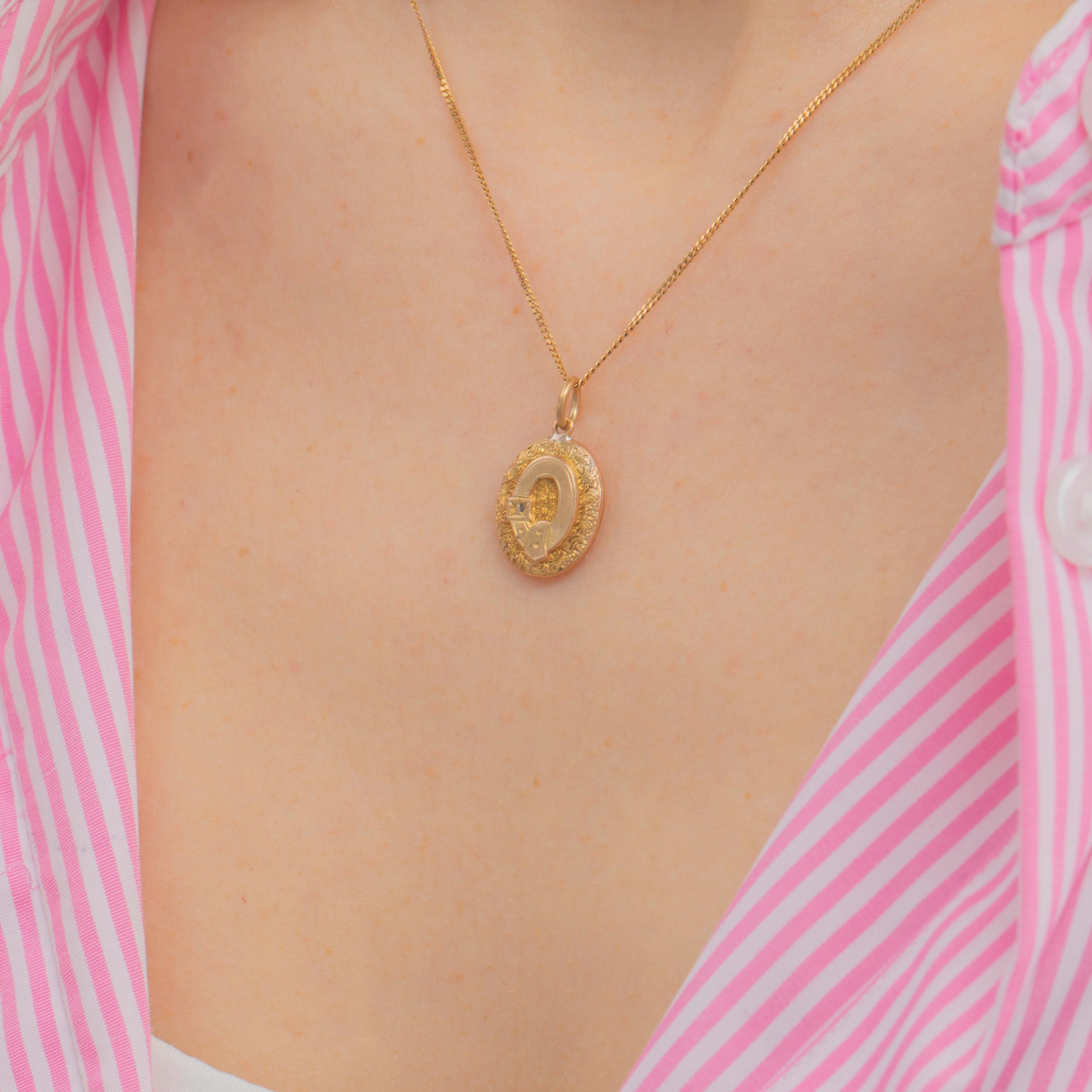 We absolutely love this Victorian engraved buckle motif pendant! This exquisite piece is crafted from a honey-hued Gold-toned metal and features a symbolic buckle motif on her front.