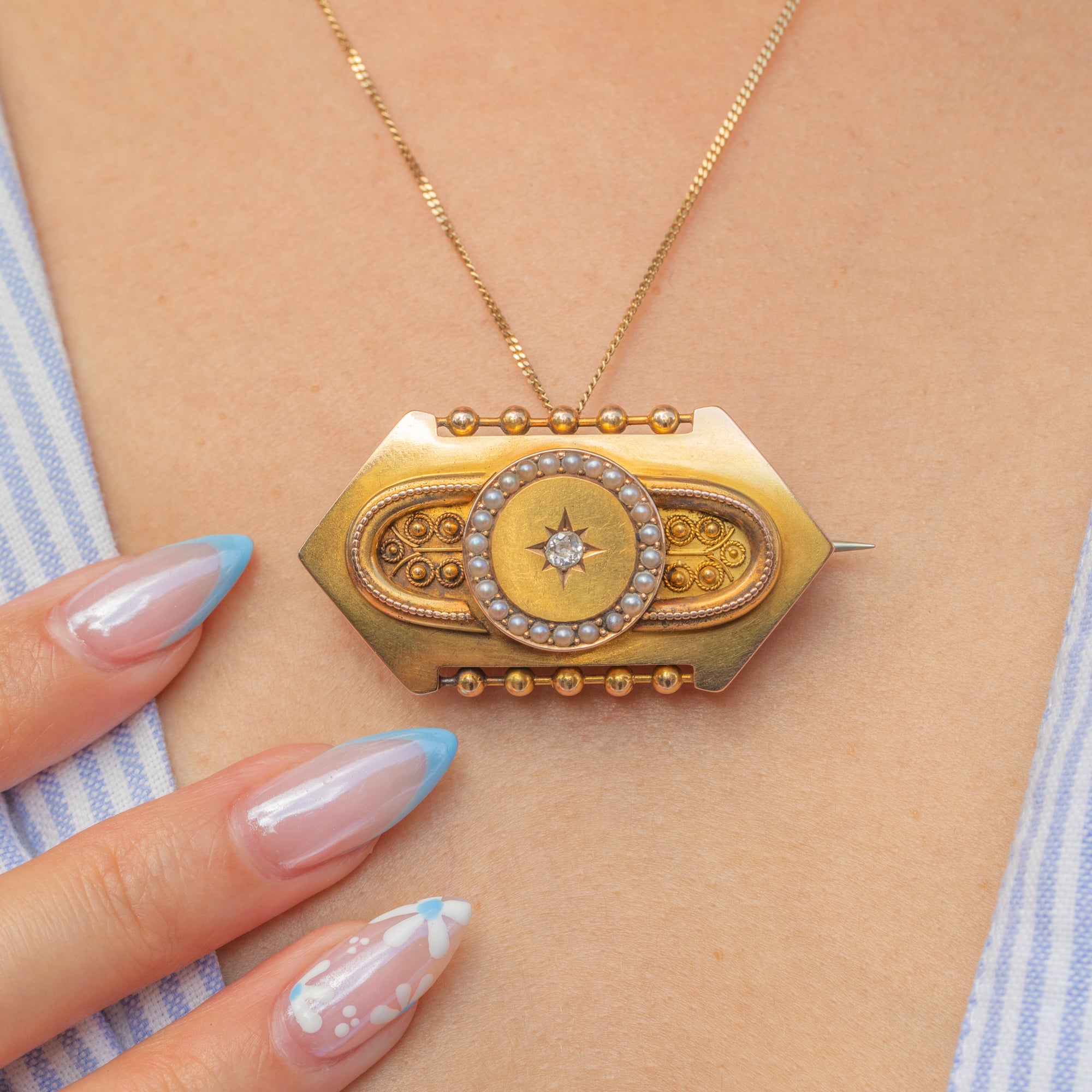 This brightly saturated 18ct Gold brooch is a fine example of Etruscan revival jewellery! The brooch's striking geometric form is inlaid with a glimmering 0.10ct Diamond centre, displayed within a distinct star setting, and is encircled by lusturous Seed Pearls.