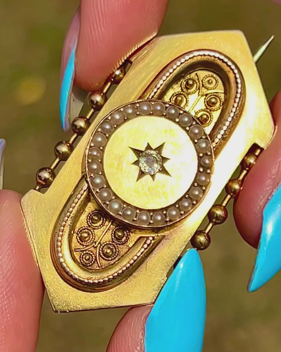 Victorian Etruscan Revival 18ct Gold Diamond Pearl Brooch, Locket Back